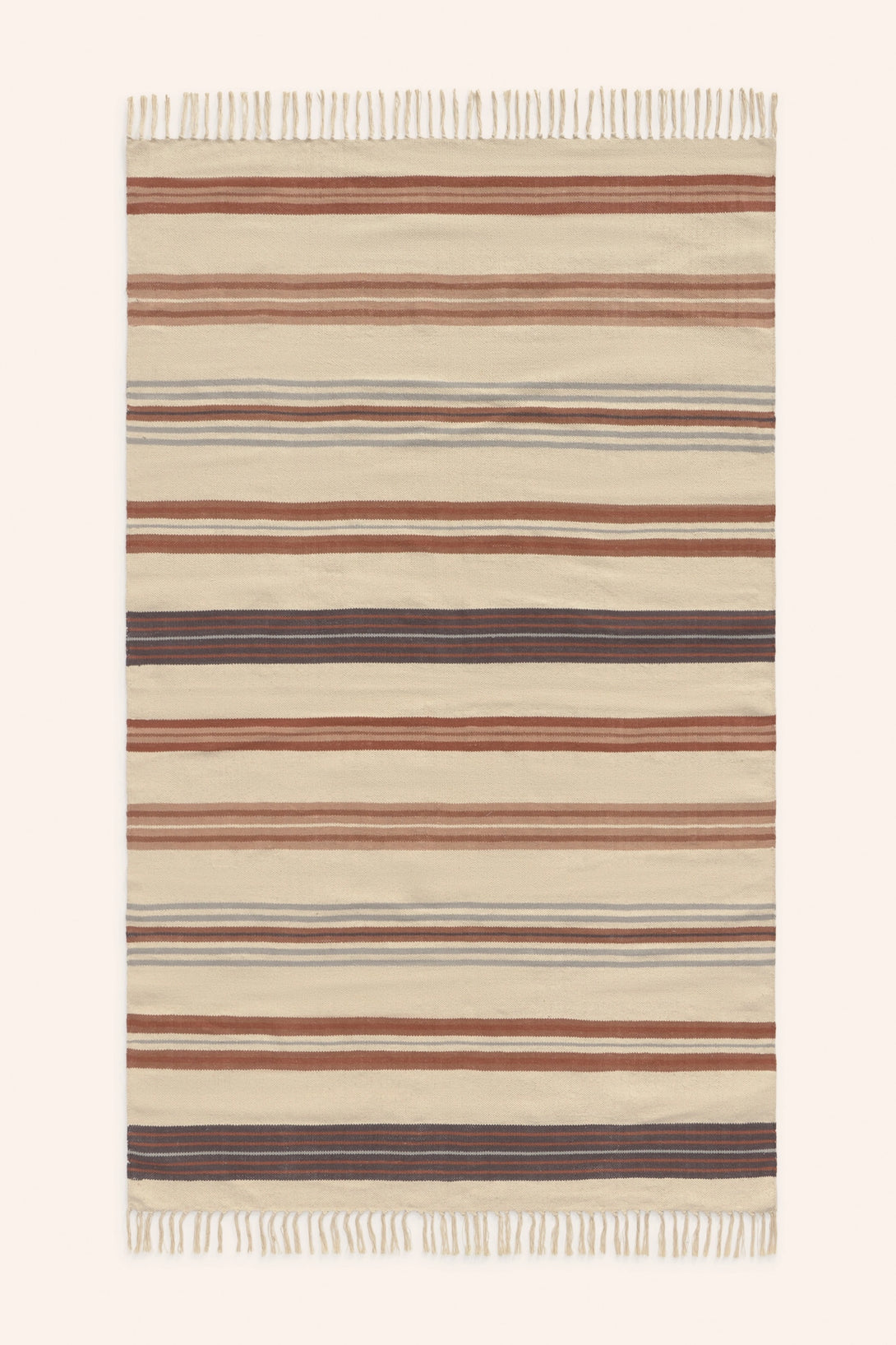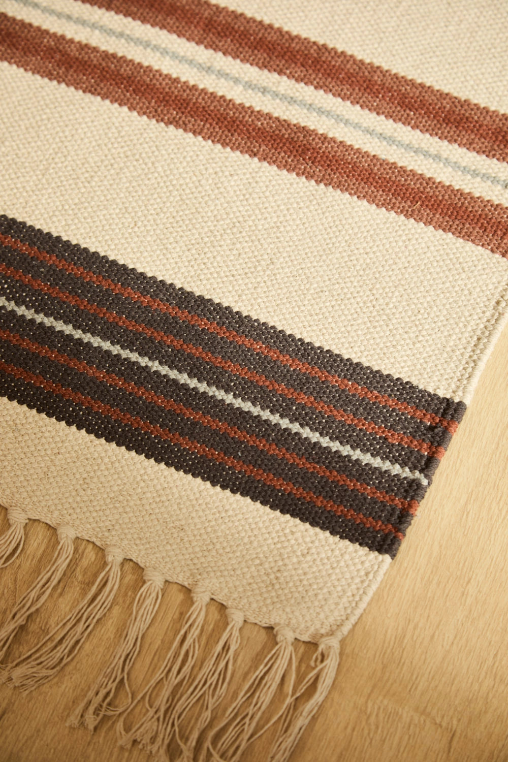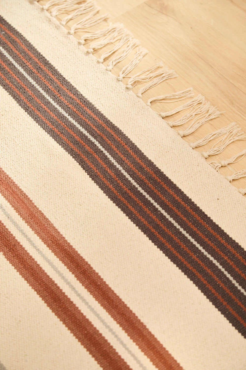 Washable cotton dhurrie rug with woven stripes in earth tones. Fringed finish.