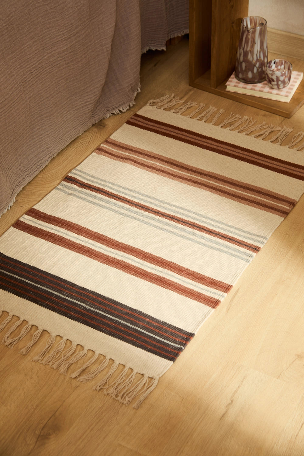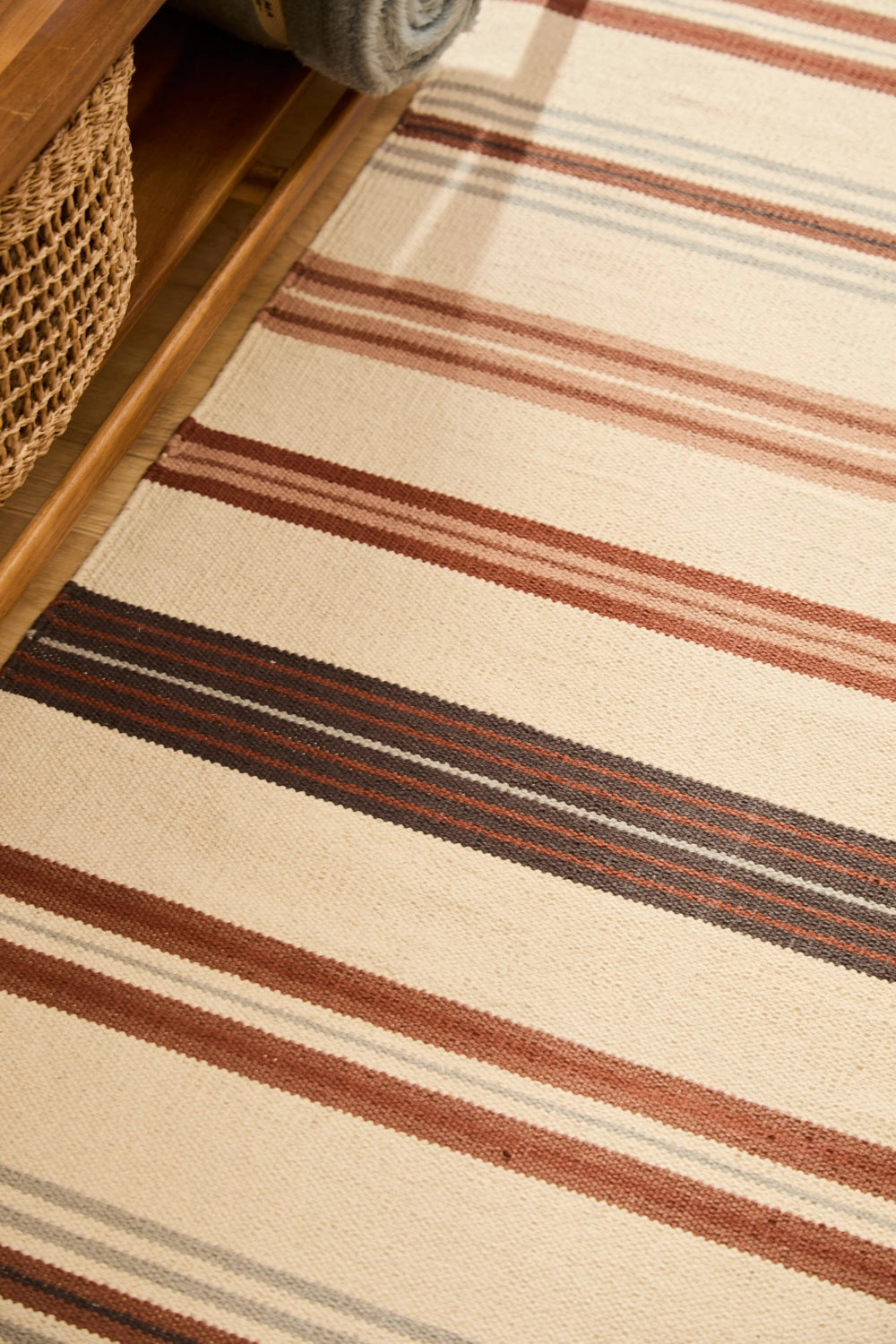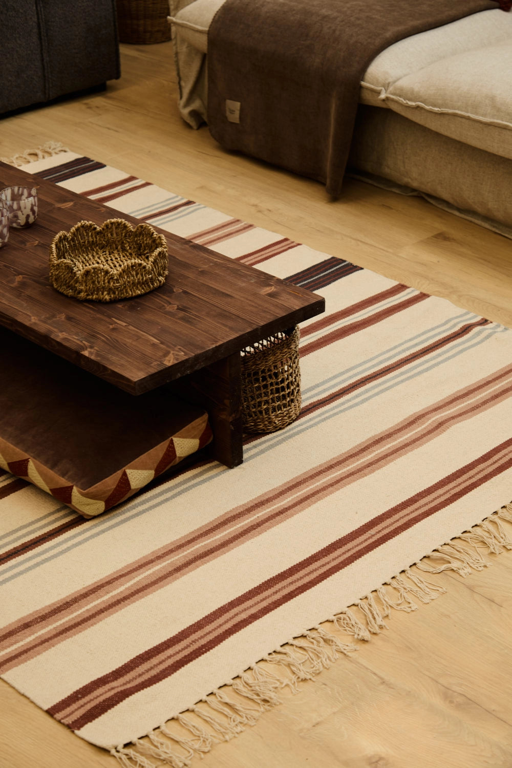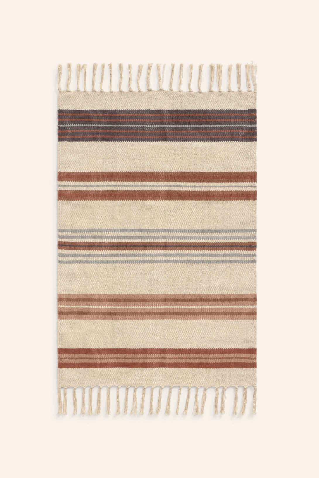 Washable cotton dhurrie rug with woven stripes in earth tones. Fringed finish.