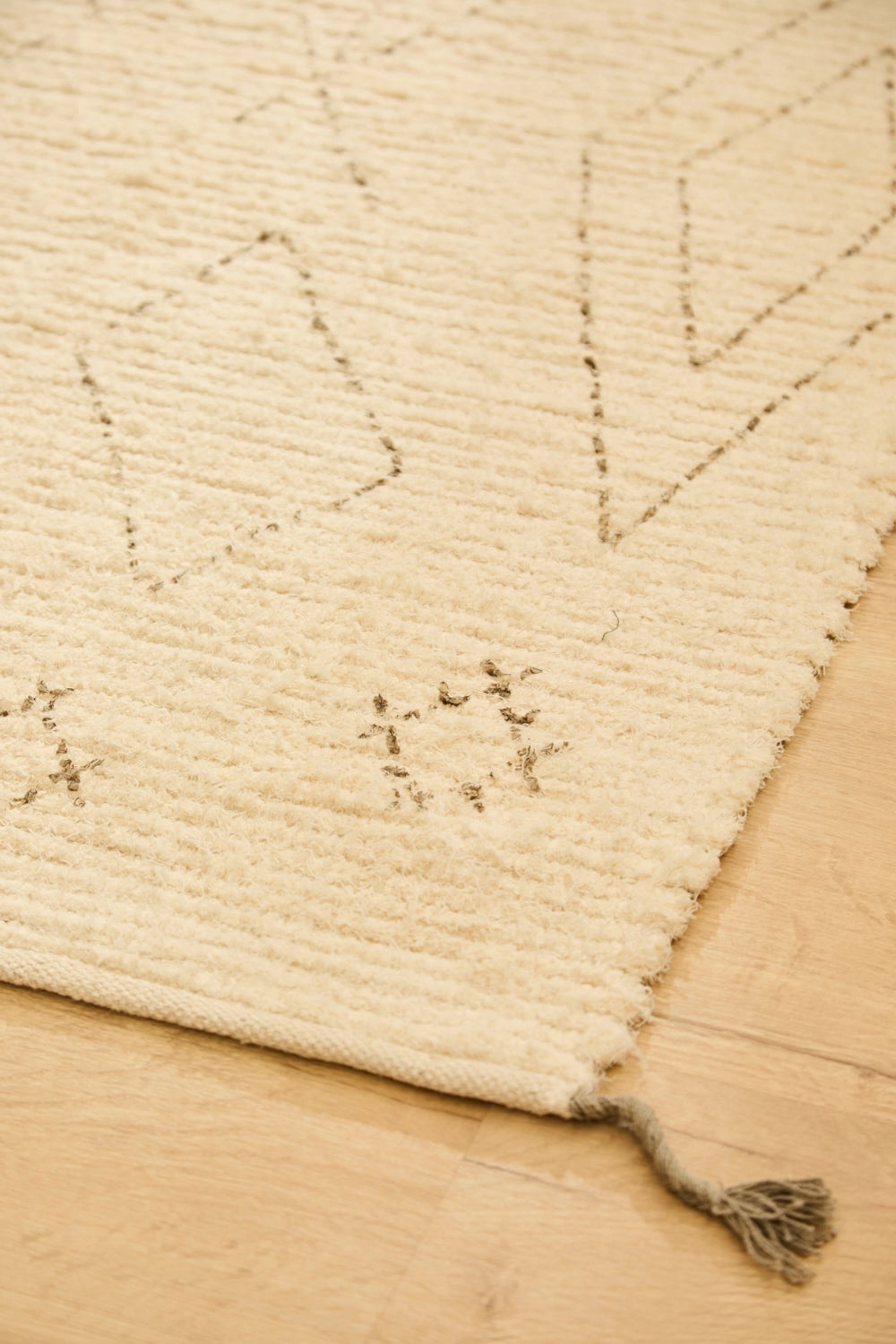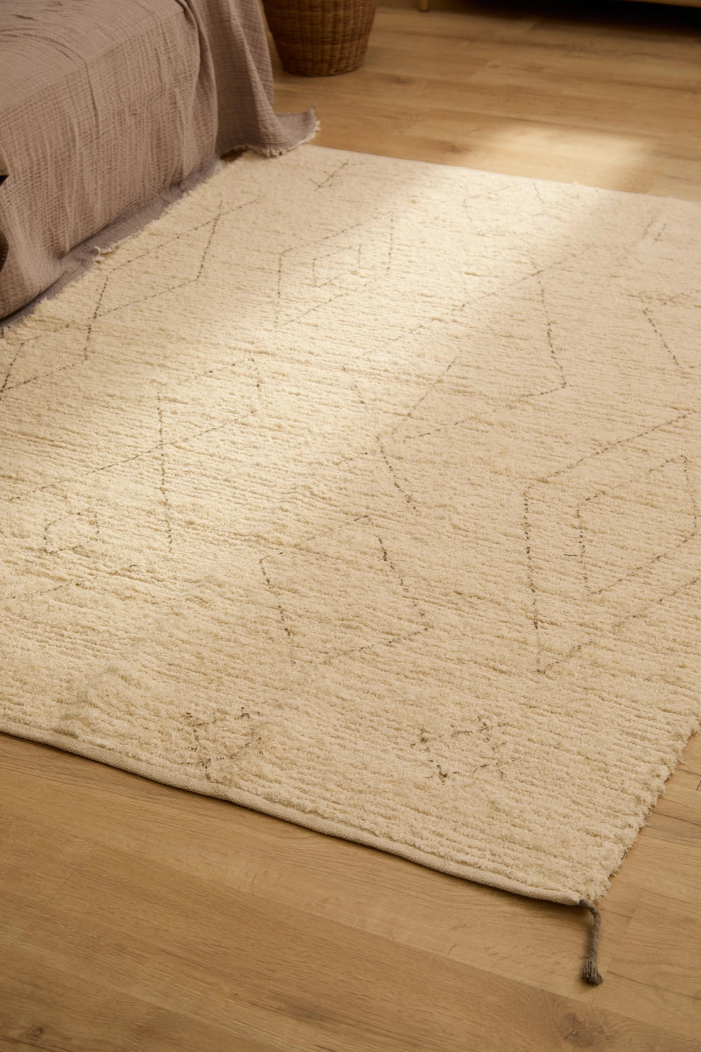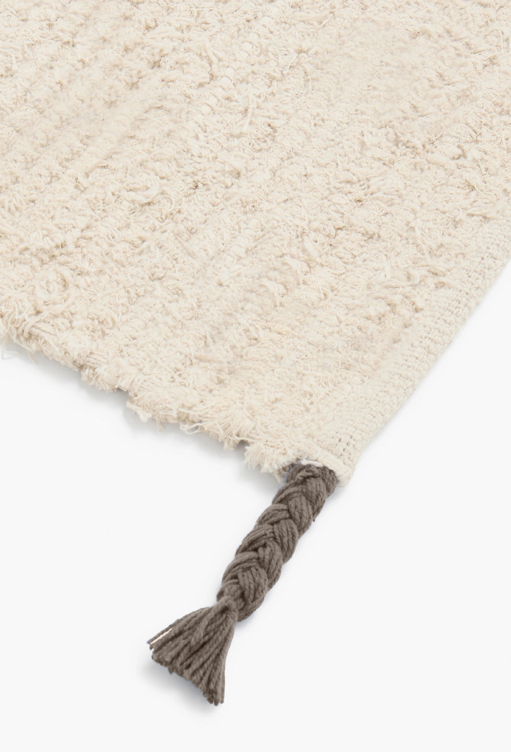 Washable slub cotton rug with a stone-tone print. Fringed finish.