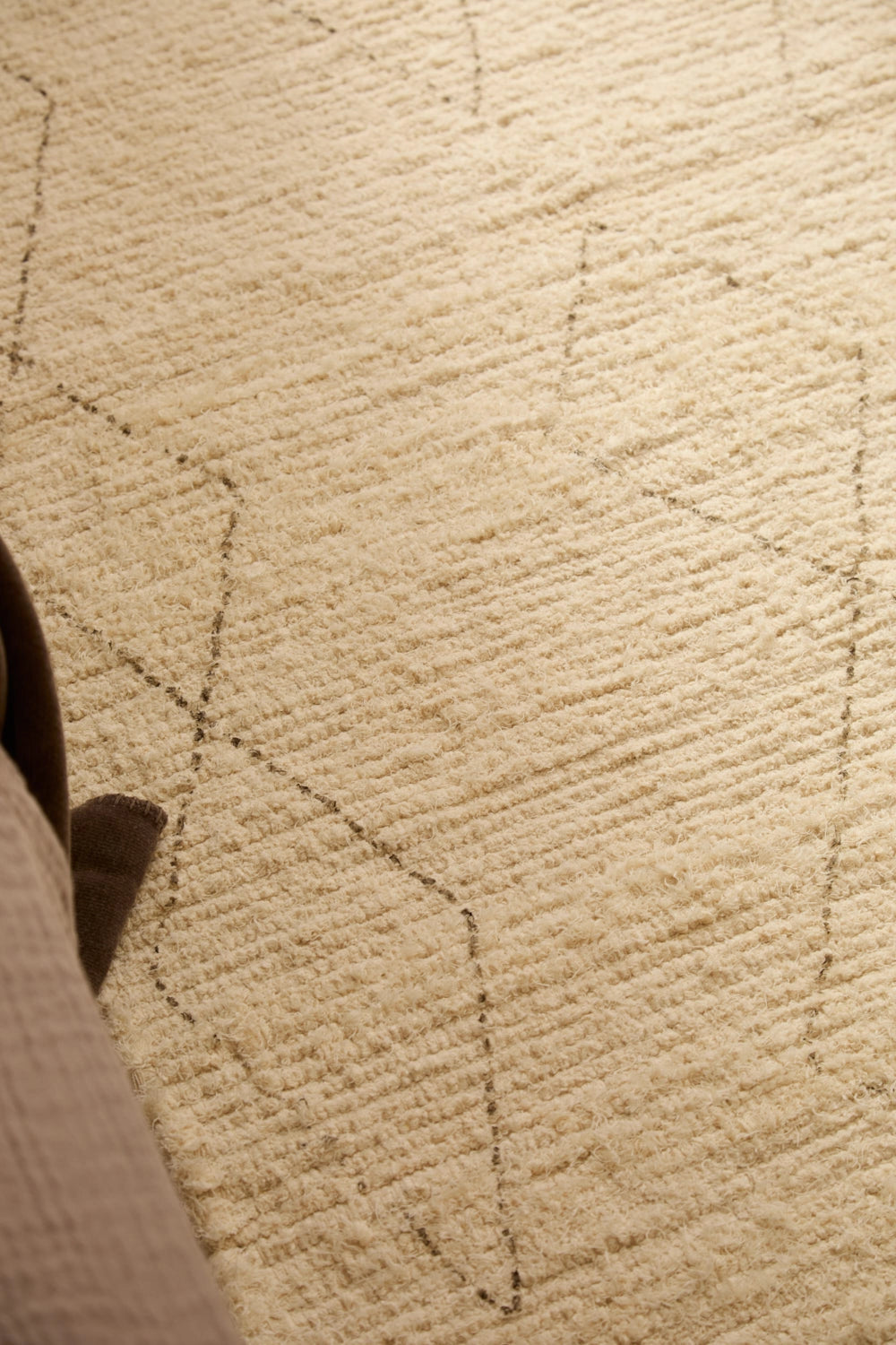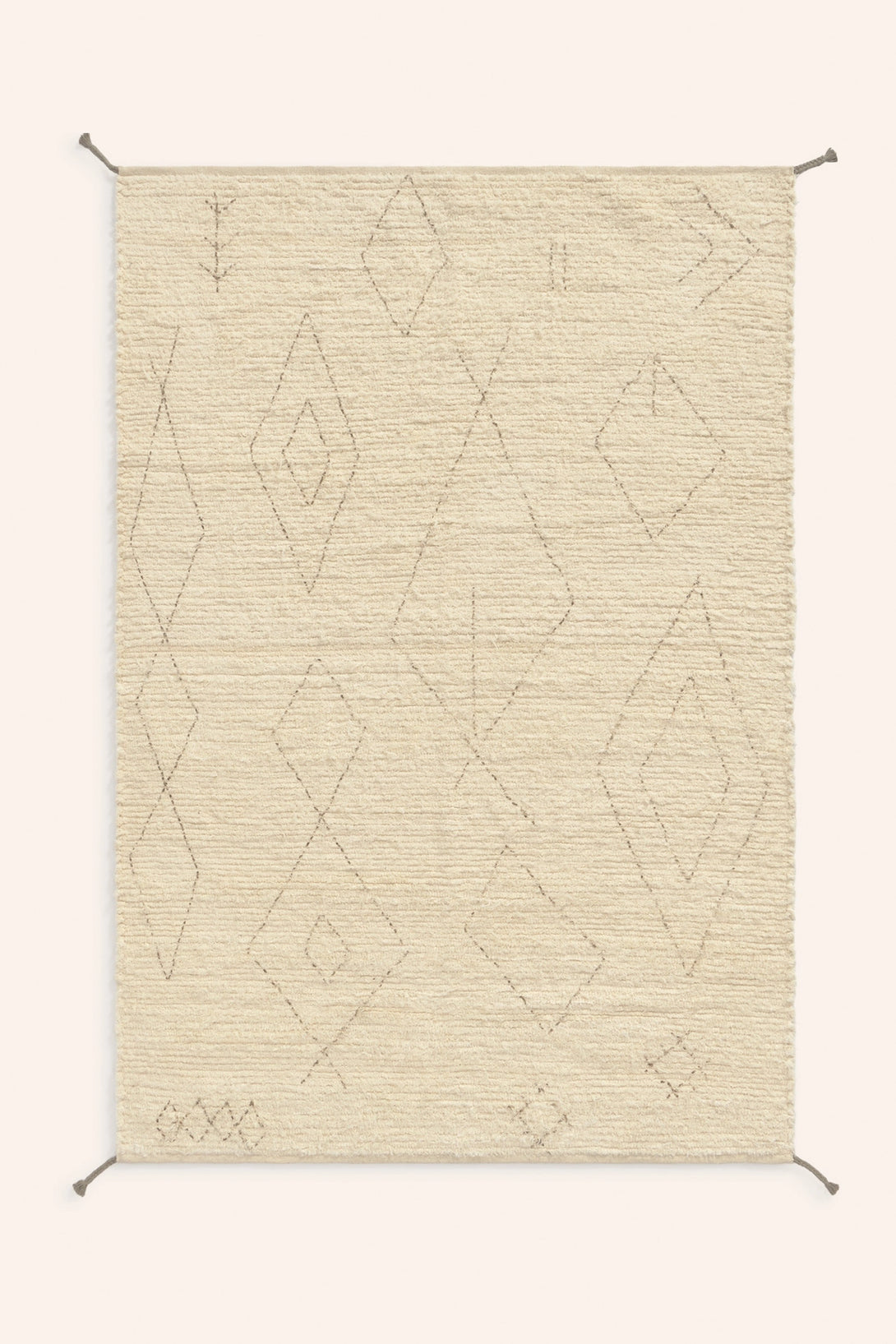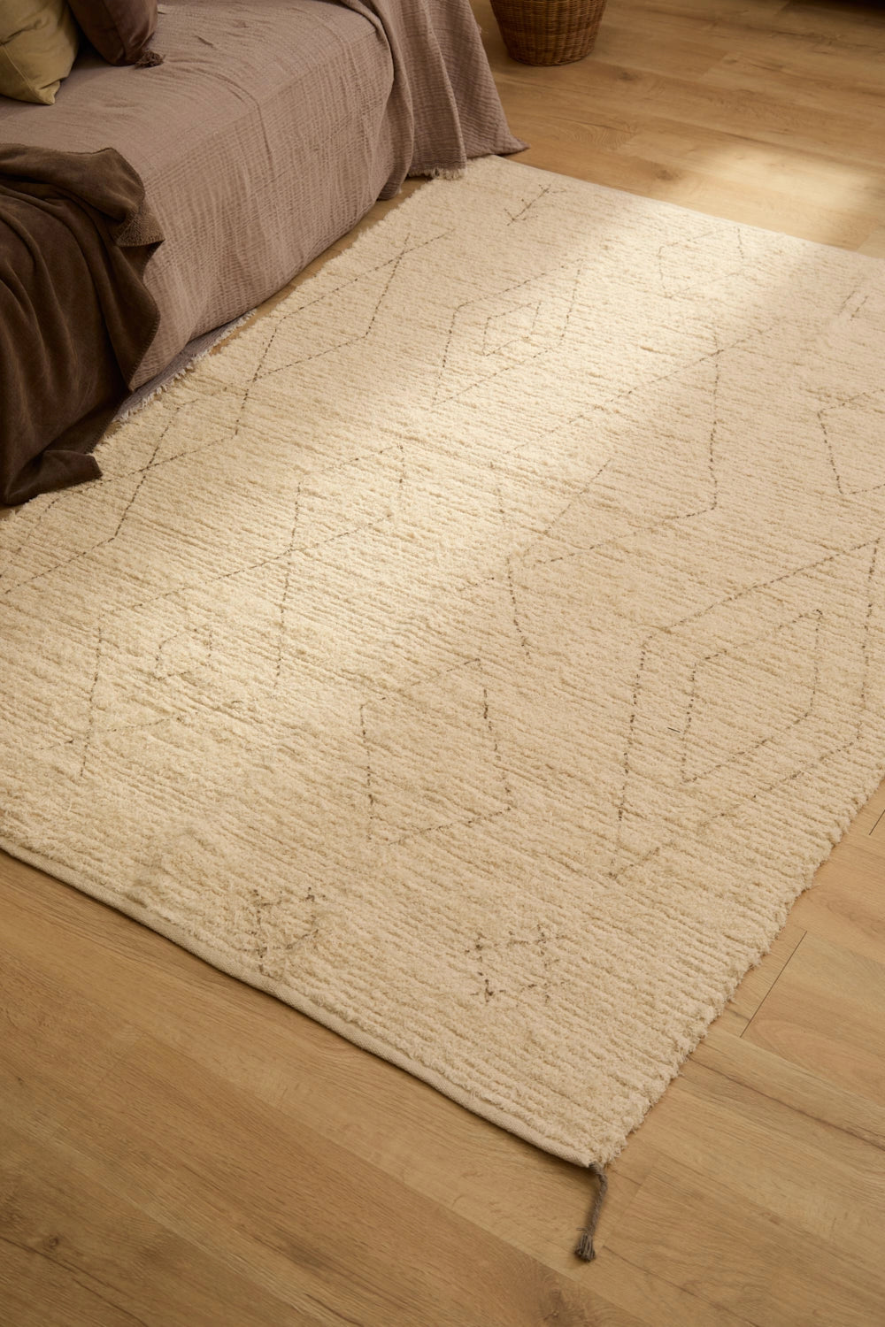Washable slub cotton rug with a stone-tone print. Fringed finish.