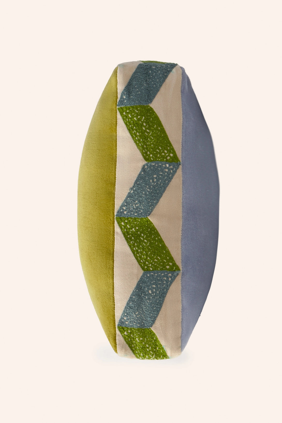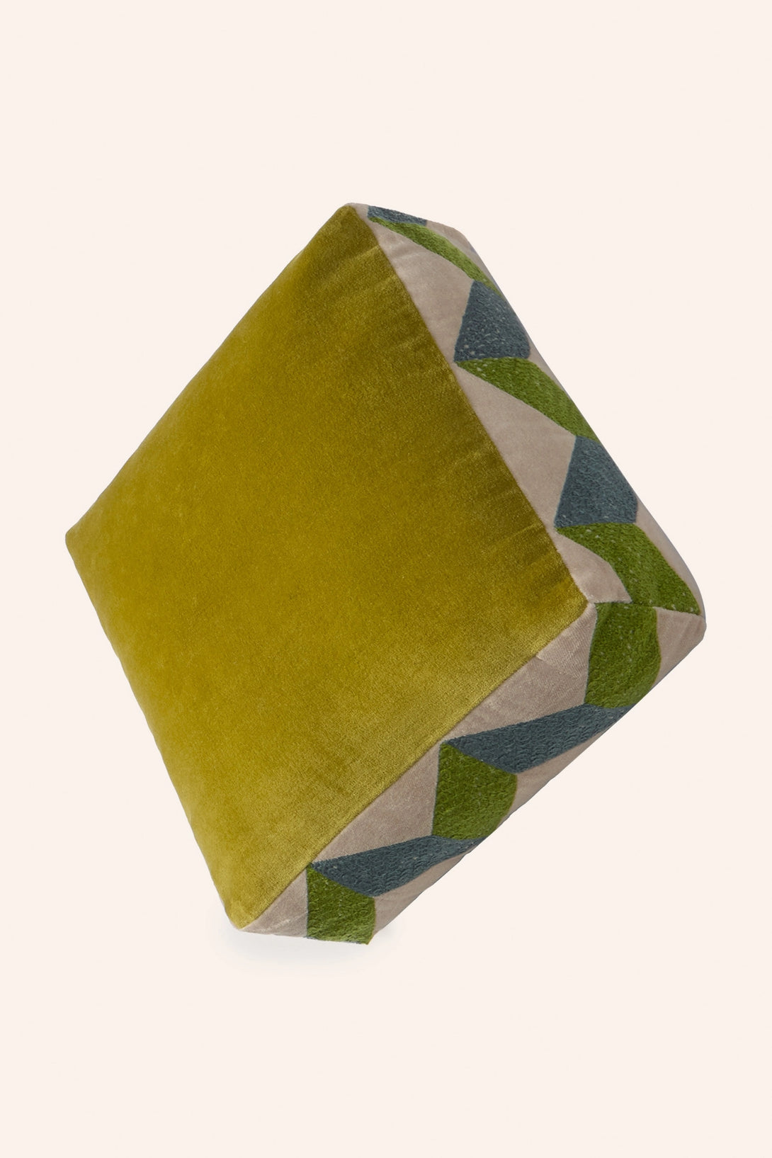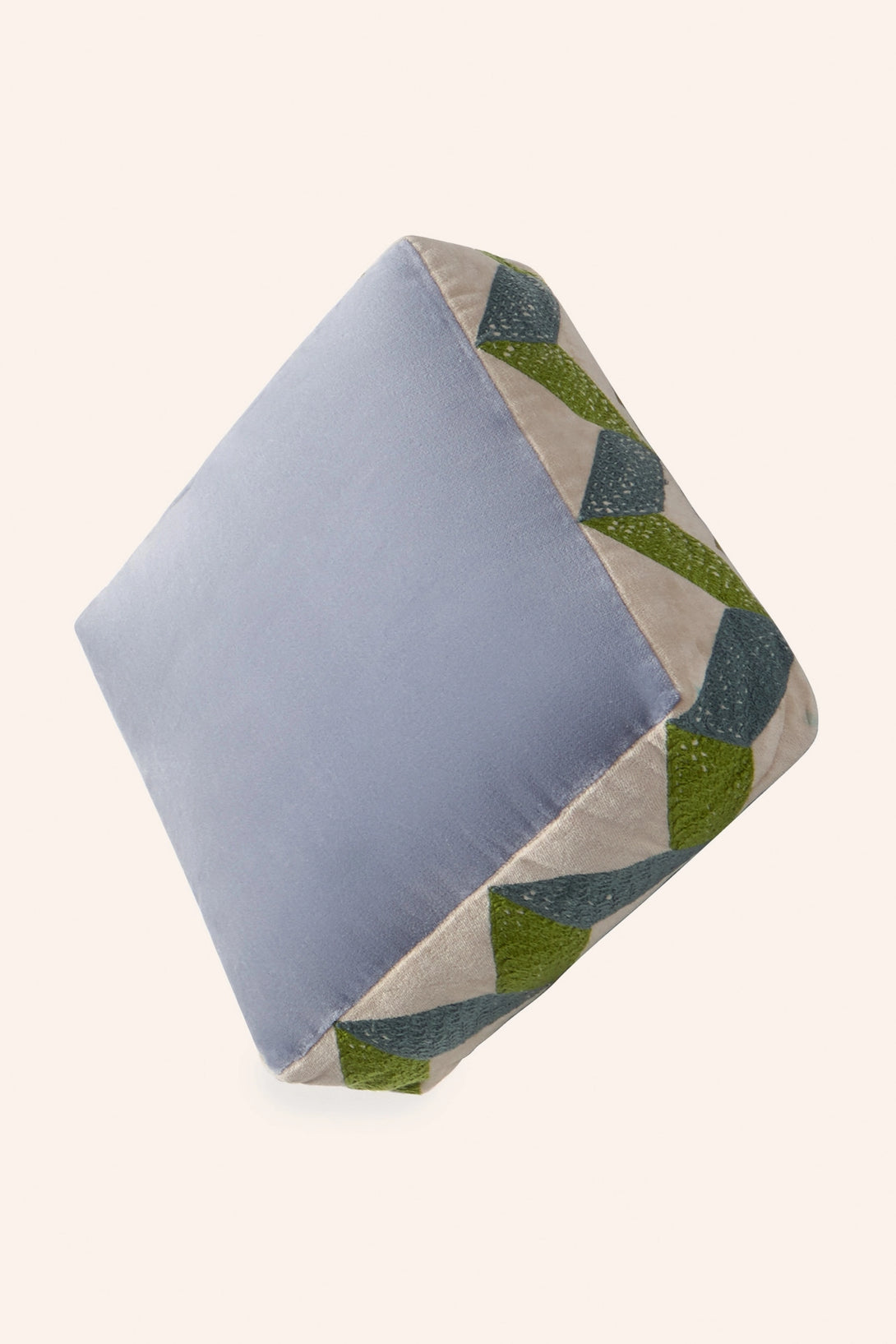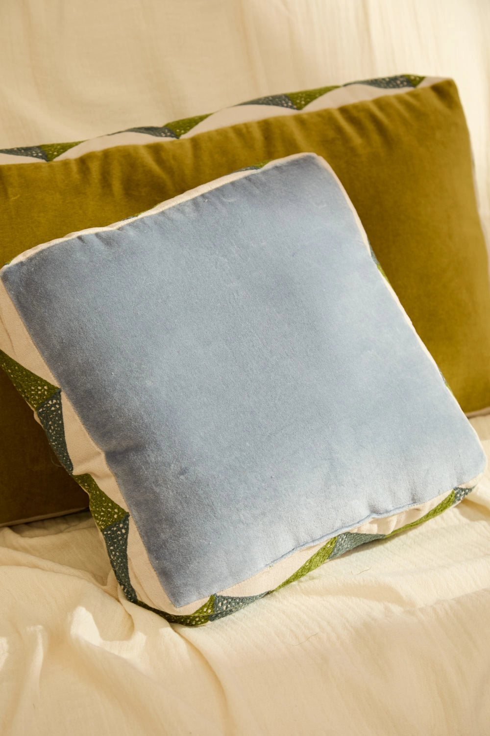 Square cotton velvet cushion, green on one side and blue on the other, with a matching embroidered trim. Each cushion may have slight color variations due to the dyeing process and screen display.
