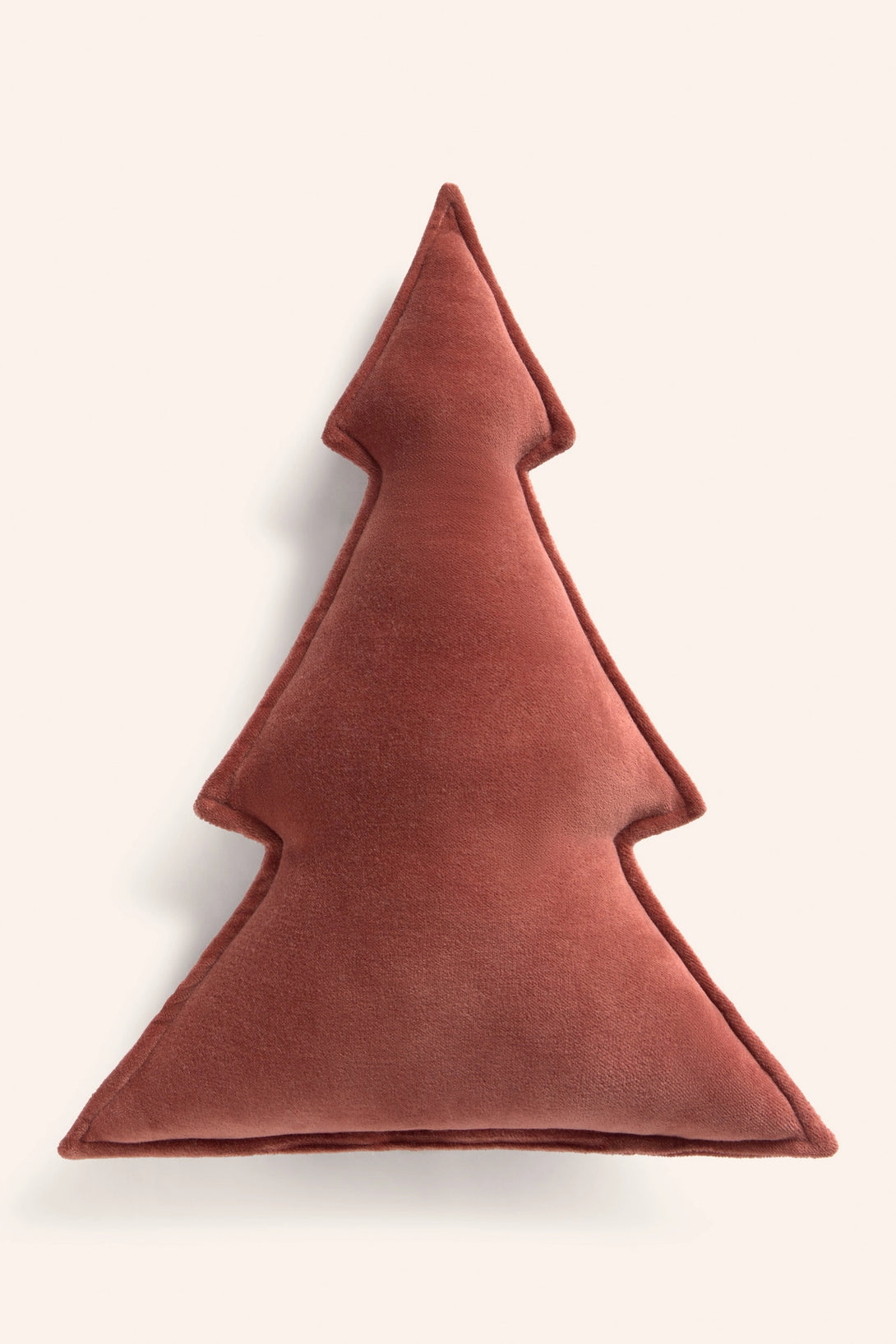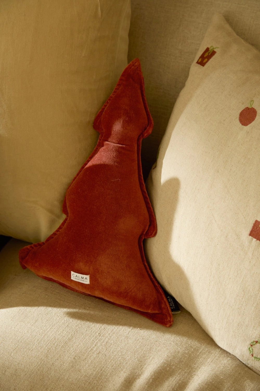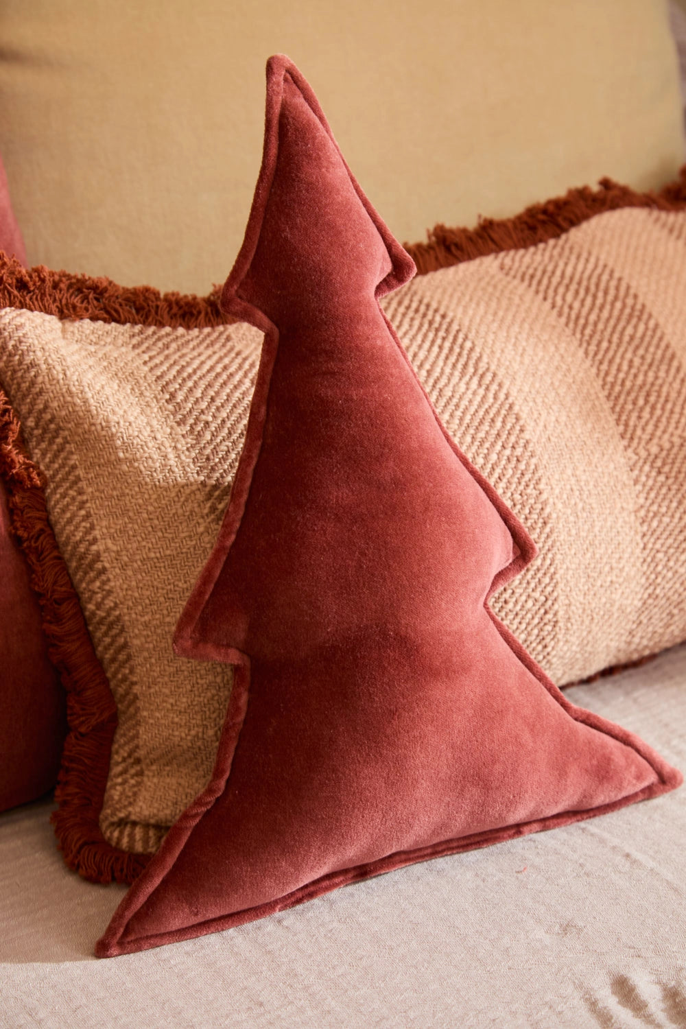 Decorative Christmas tree-shaped cushion made of earthy cotton velvet. Piping detail.