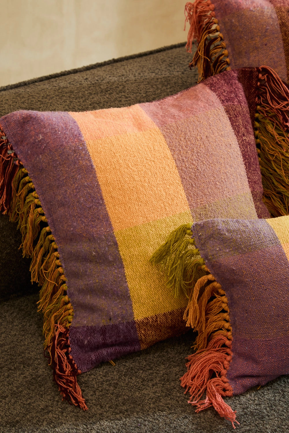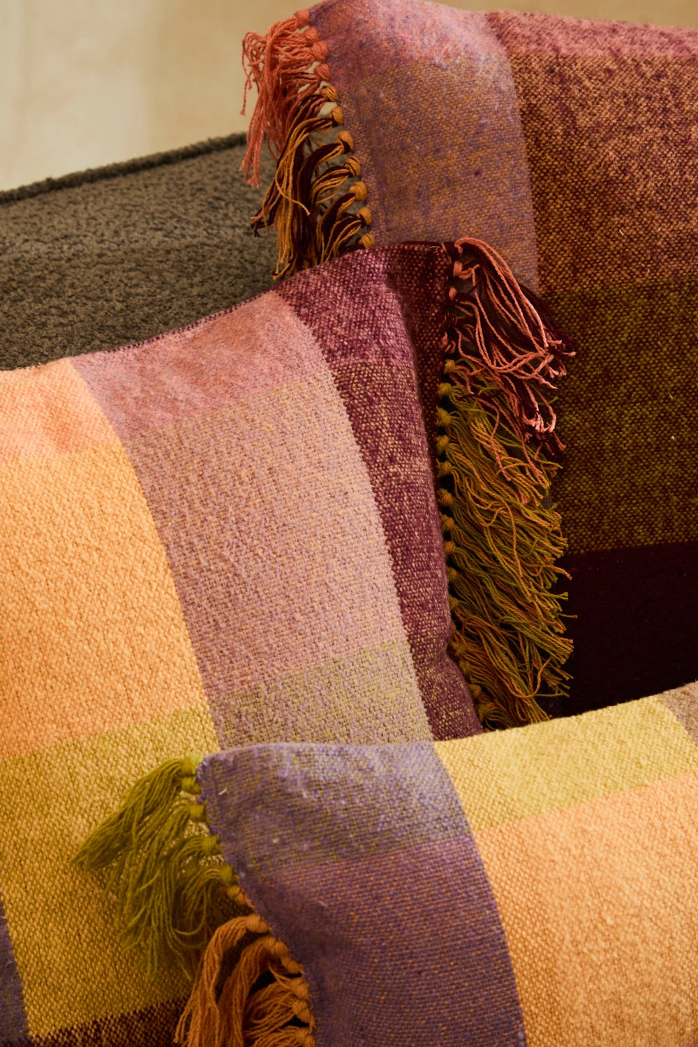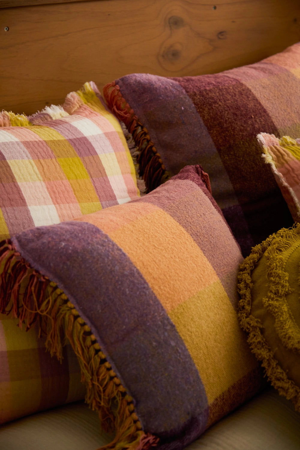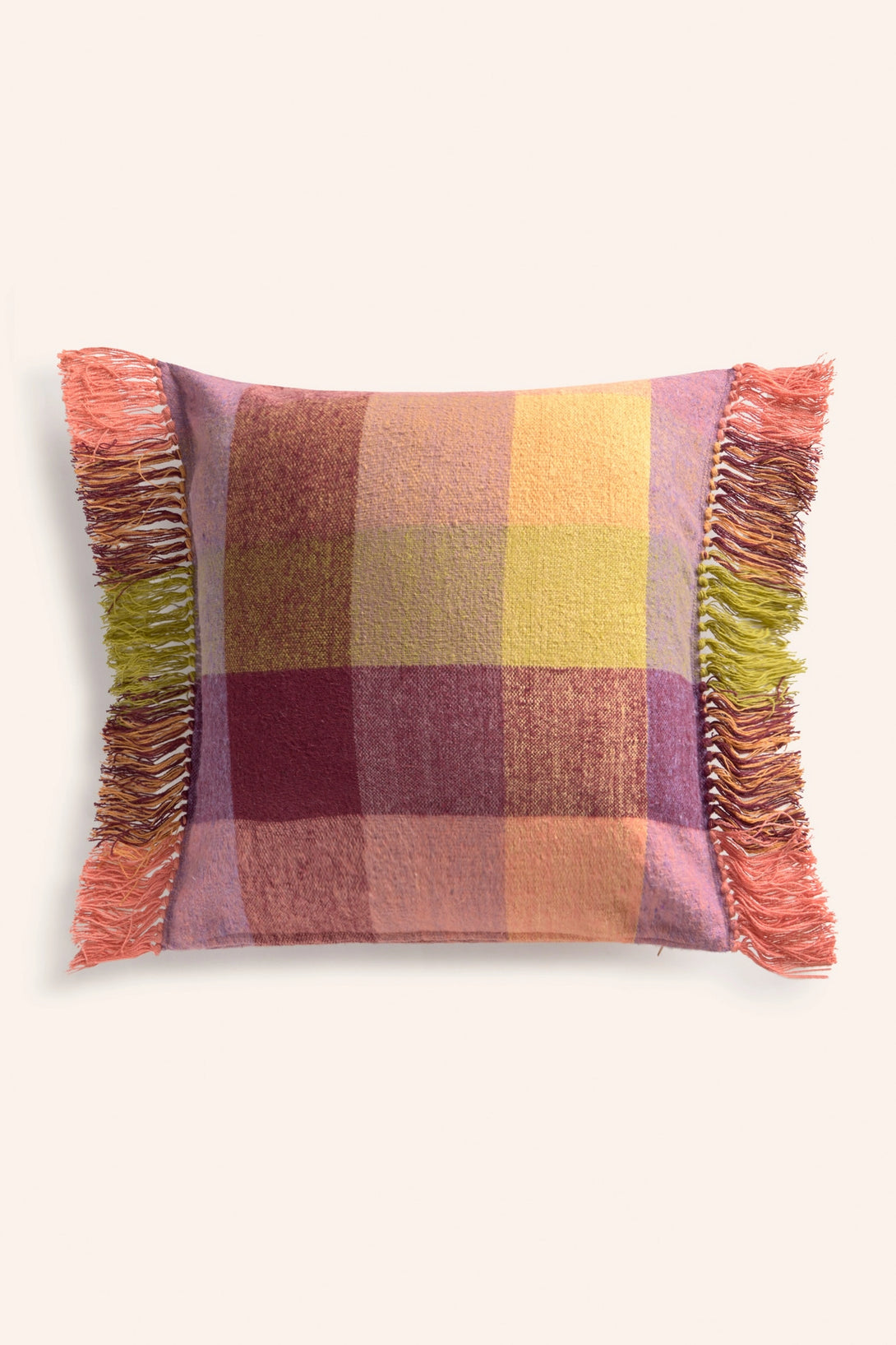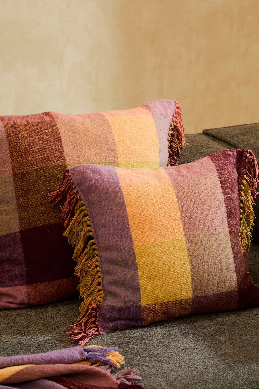 Square flannel cotton cushion cover with a multi-color check design. Concealed bottom zipper closure. Back is identical to the front. Fringed trim. Each cushion may have slight color variations due to the dyeing process and screen display.