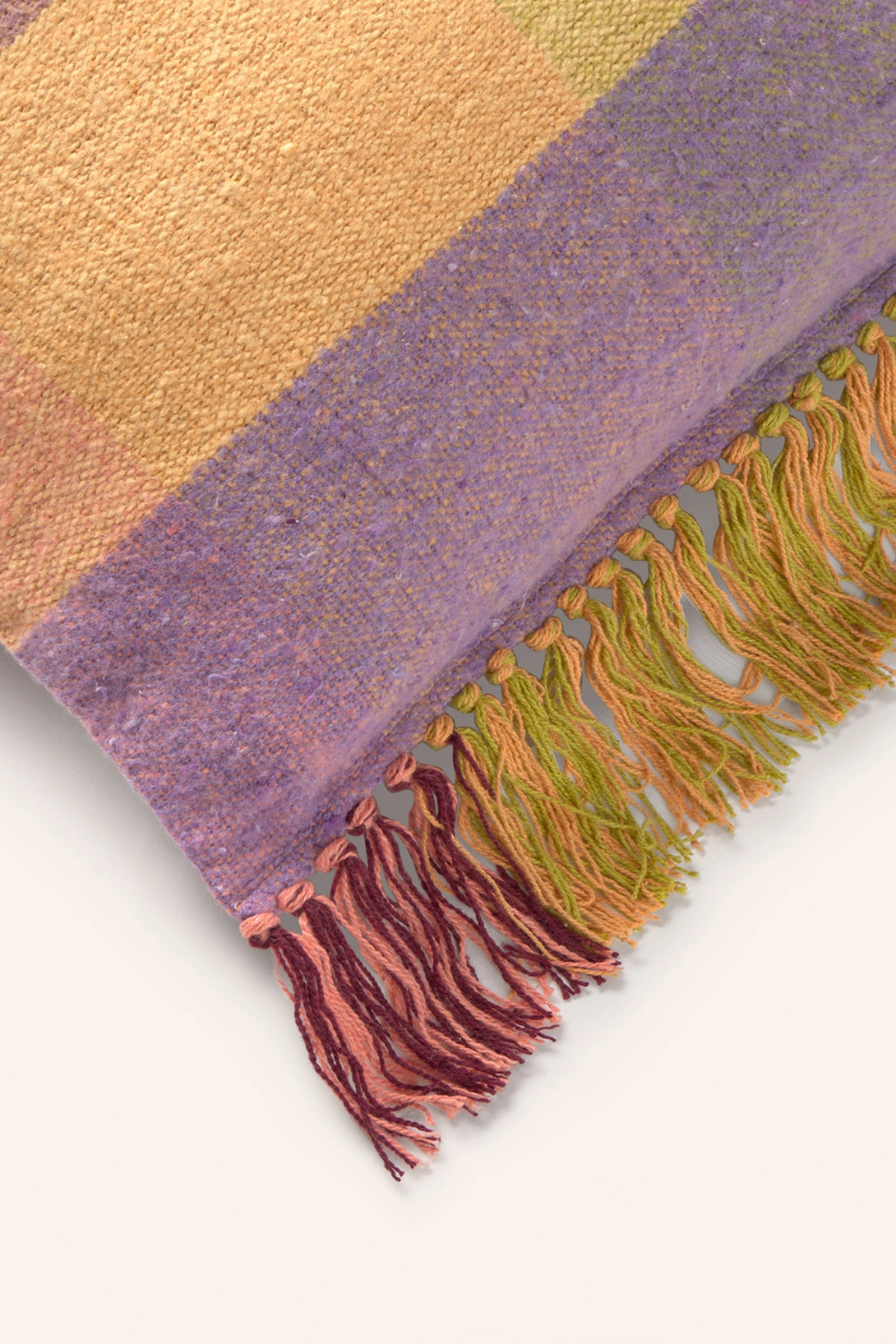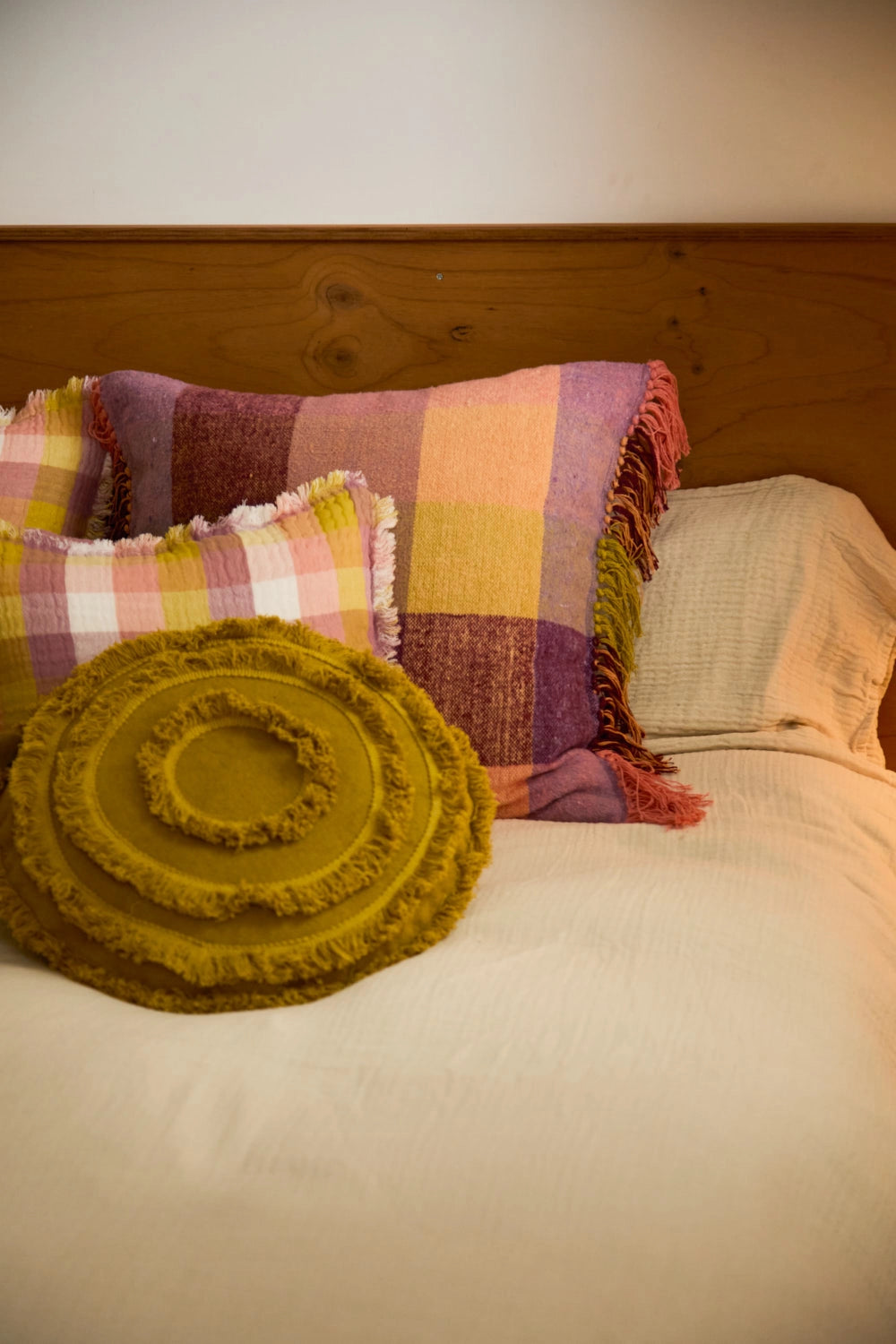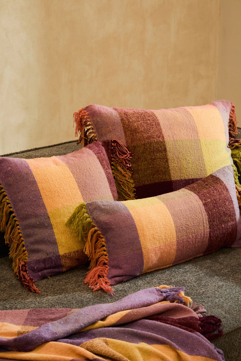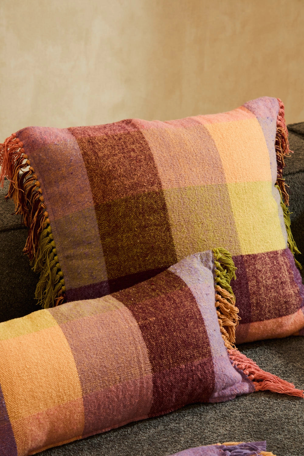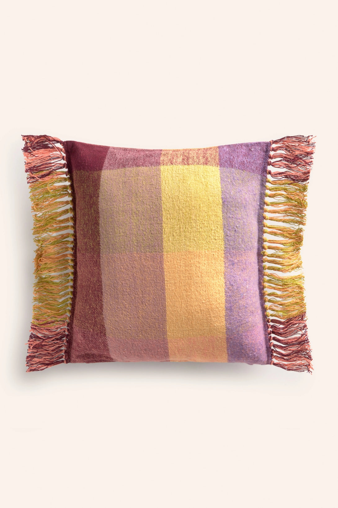 Square flannel cotton cushion cover with a multi-color check design. Concealed bottom zipper closure. Back is identical to the front. Fringed trim. Each cushion may have slight color variations due to the dyeing process and screen display.
