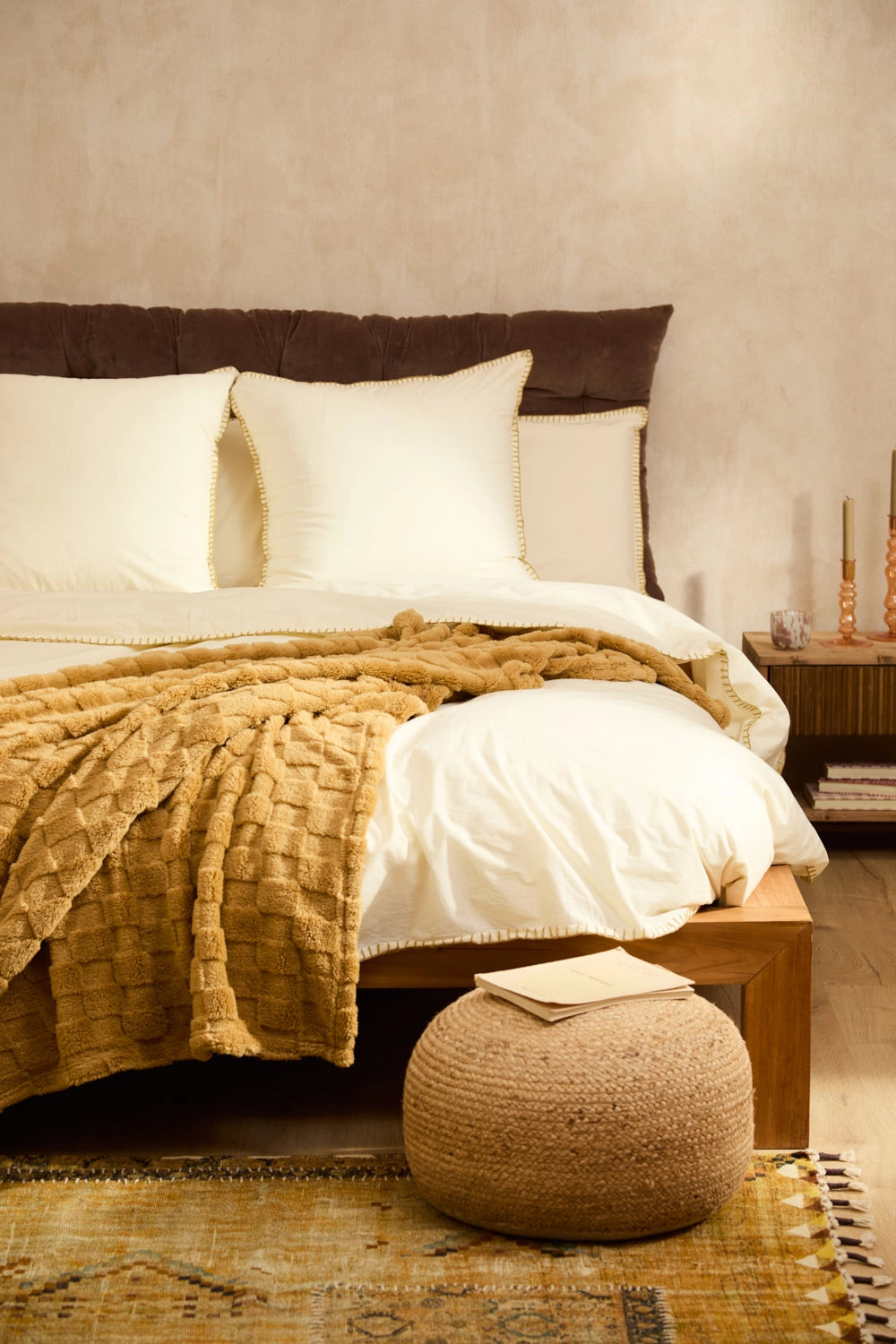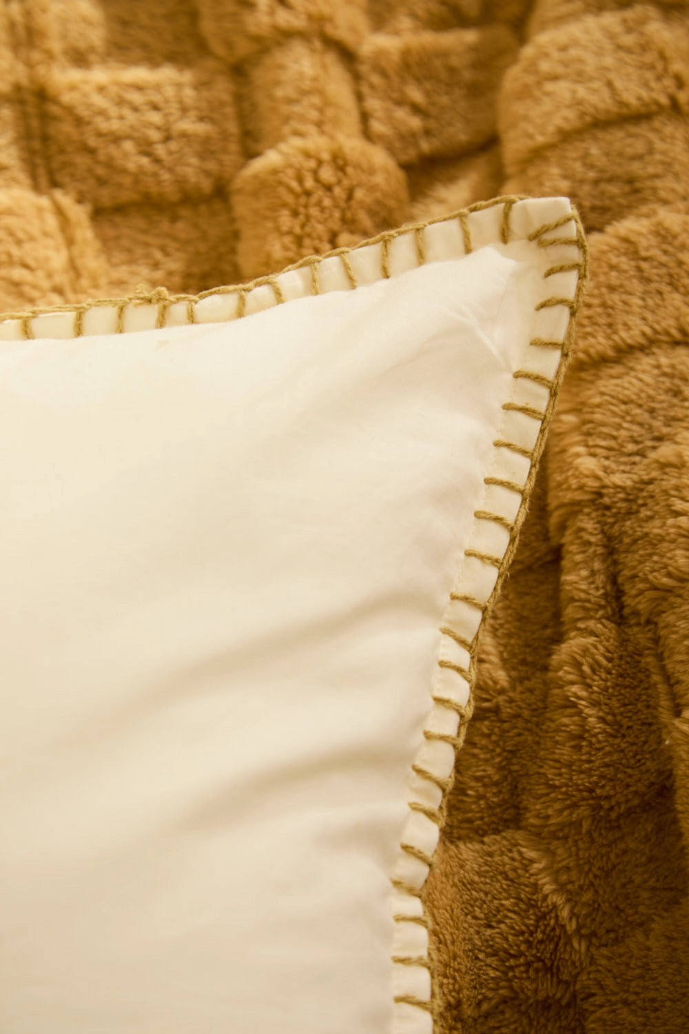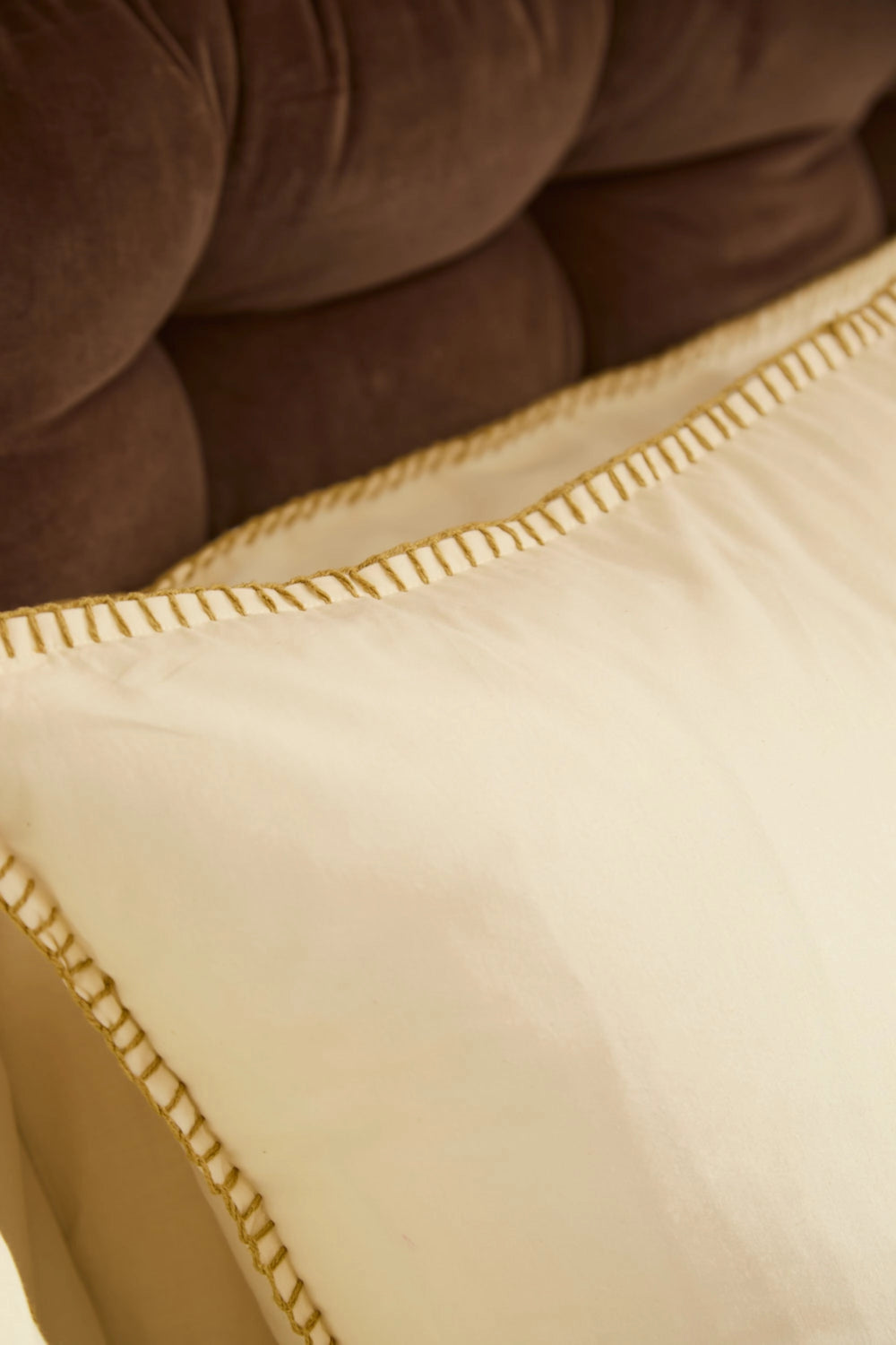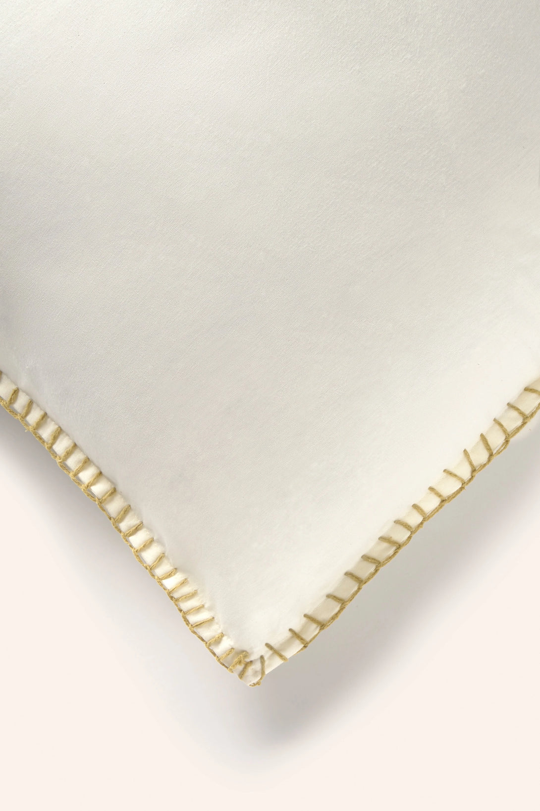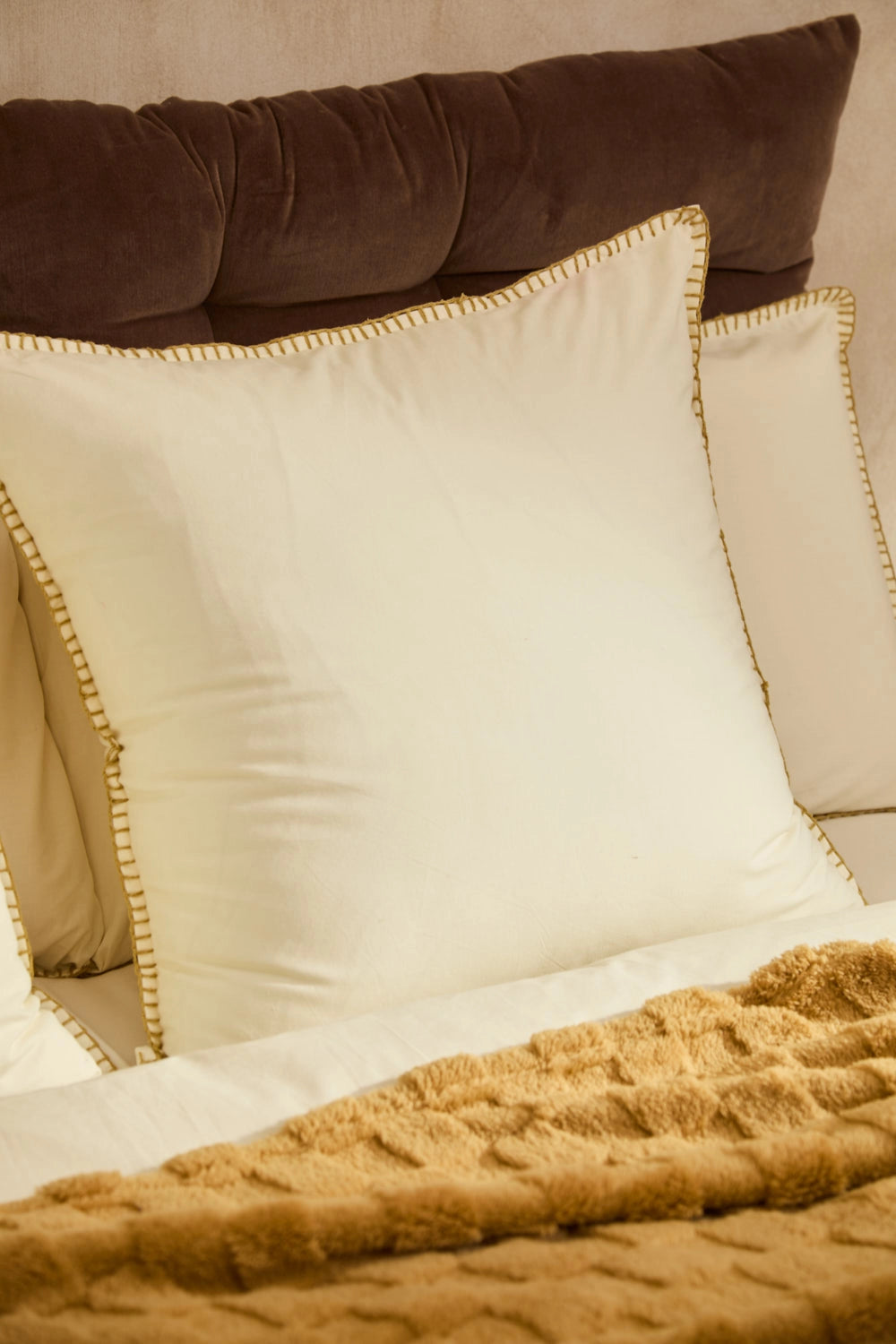 Cotton cushion cover with mustard stitching. Self-fabric back with concealed zipper flap. Each cushion may have slight color variations due to the dyeing process and screen display.
