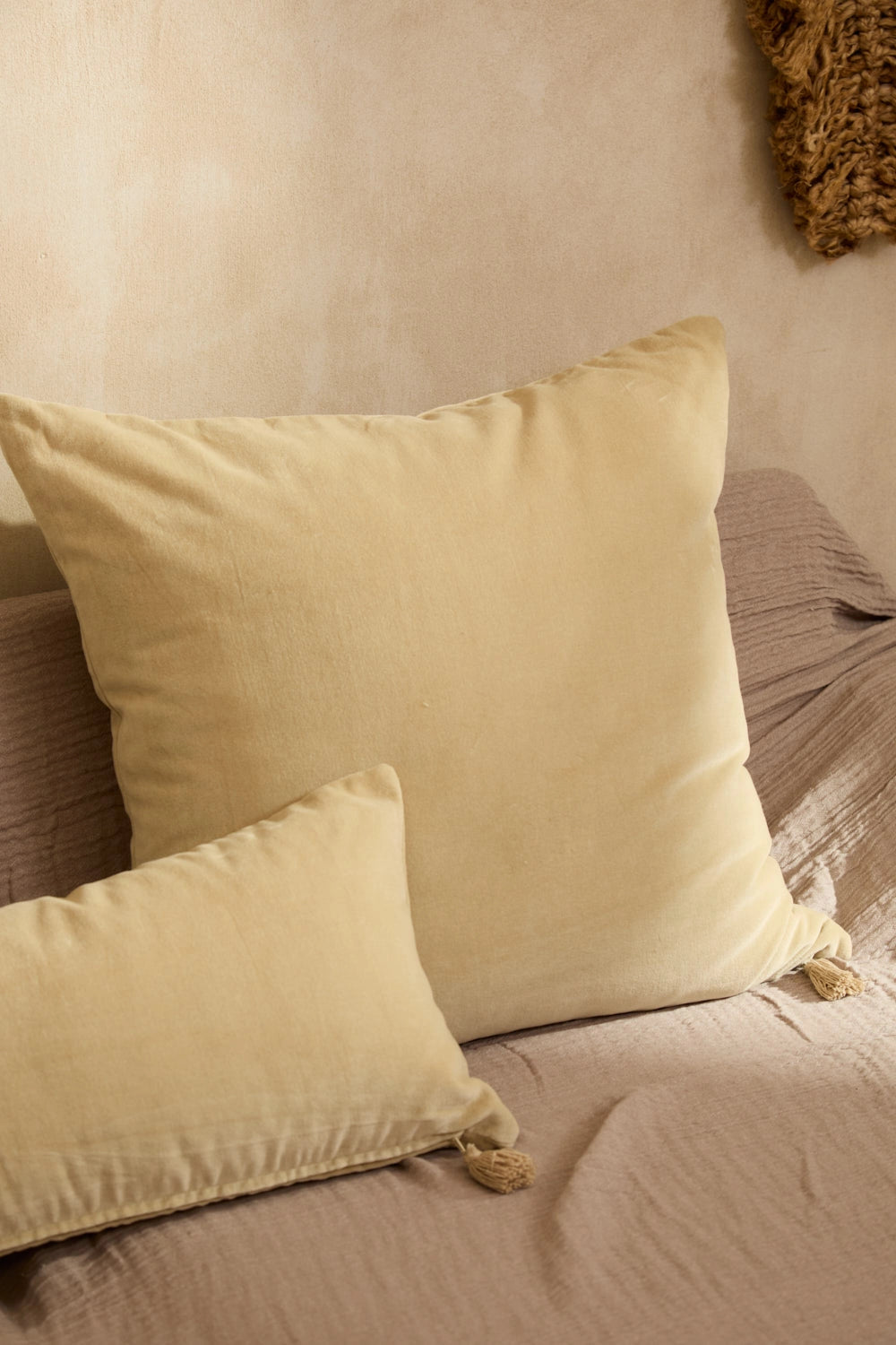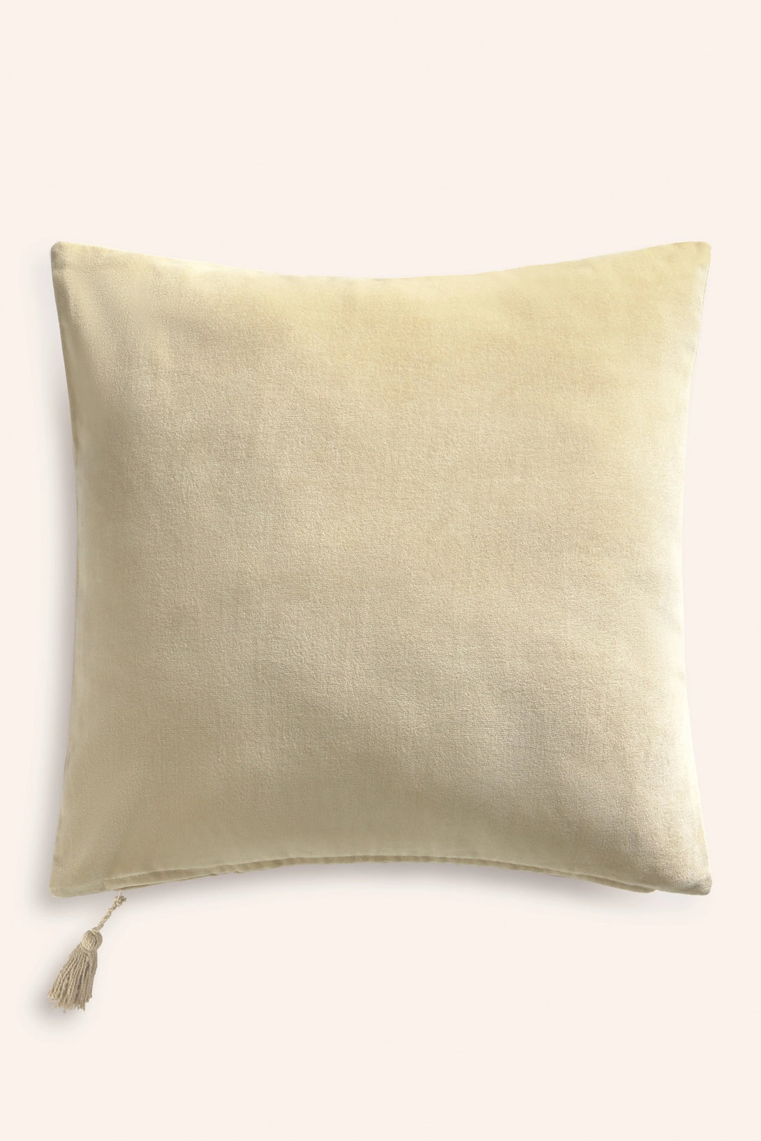 Square cushion cover in ecru cotton velvet. Identical back to front. Concealed bottom zipper closure with a pompom. Each cushion may have slight color variations due to the dyeing process and screen display.