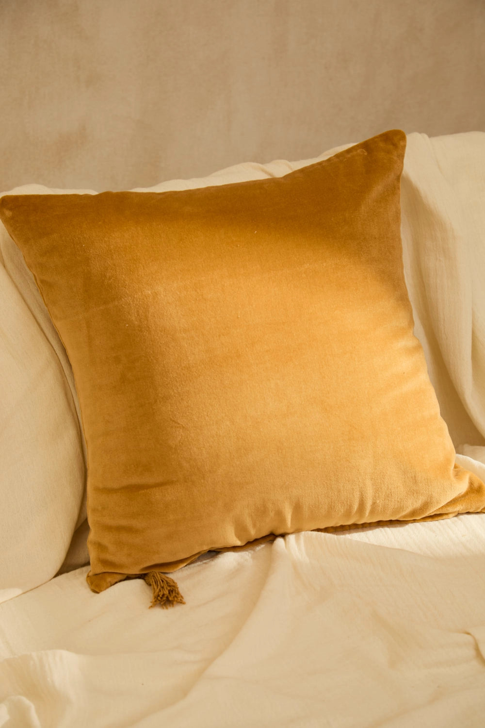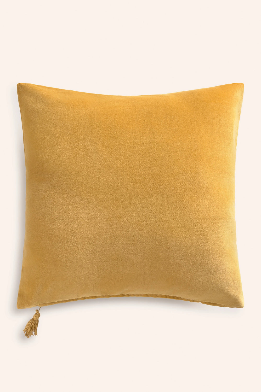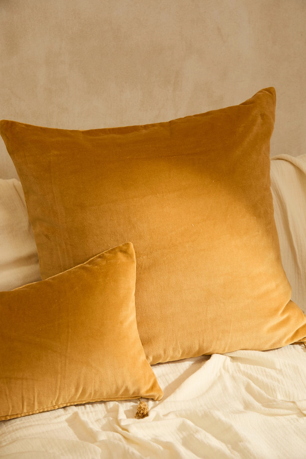 Mustard cotton velvet square cushion cover. Identical back to front. Concealed bottom zipper closure with a pompom. Each cushion may have slight color variations due to the dyeing process and screen display.