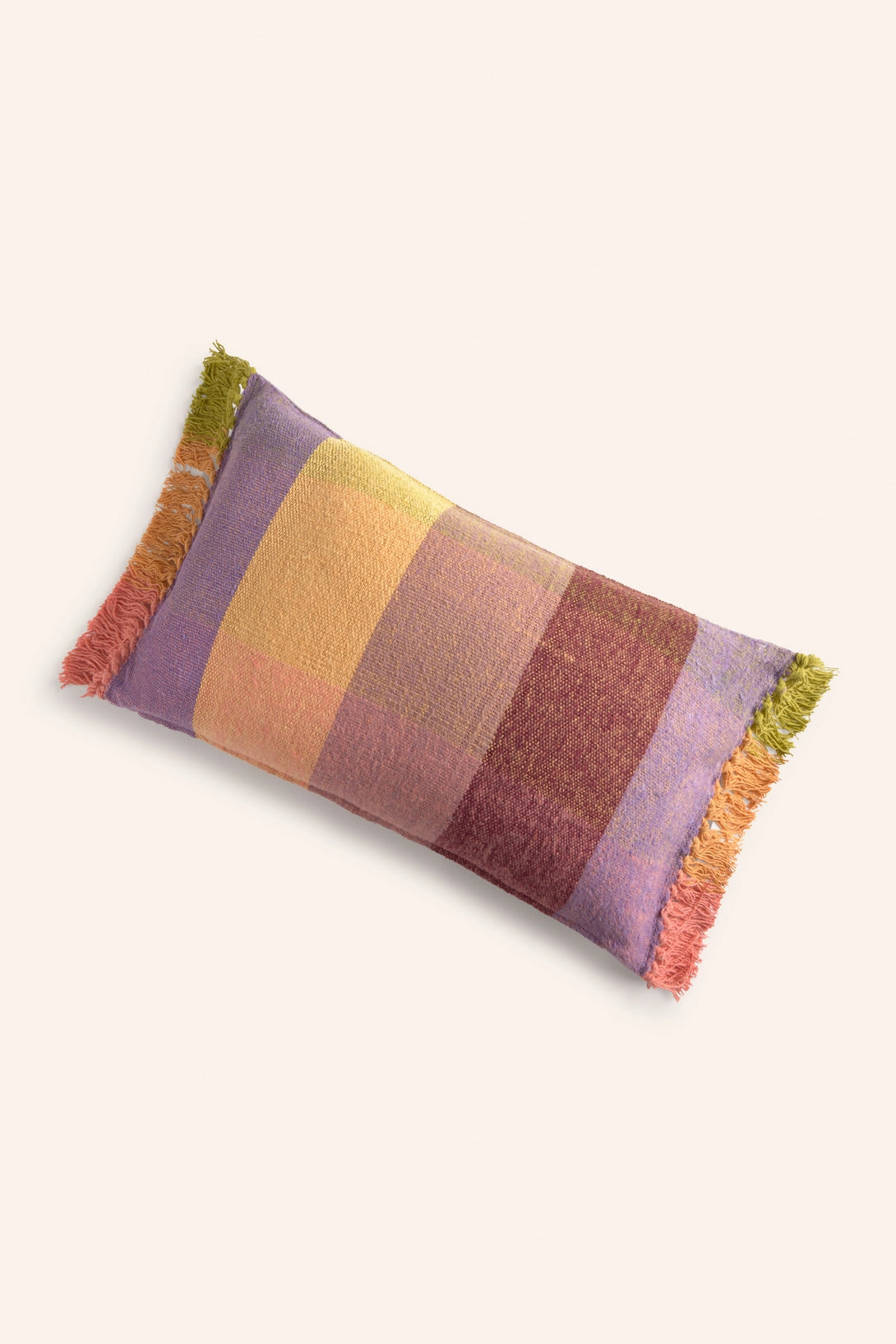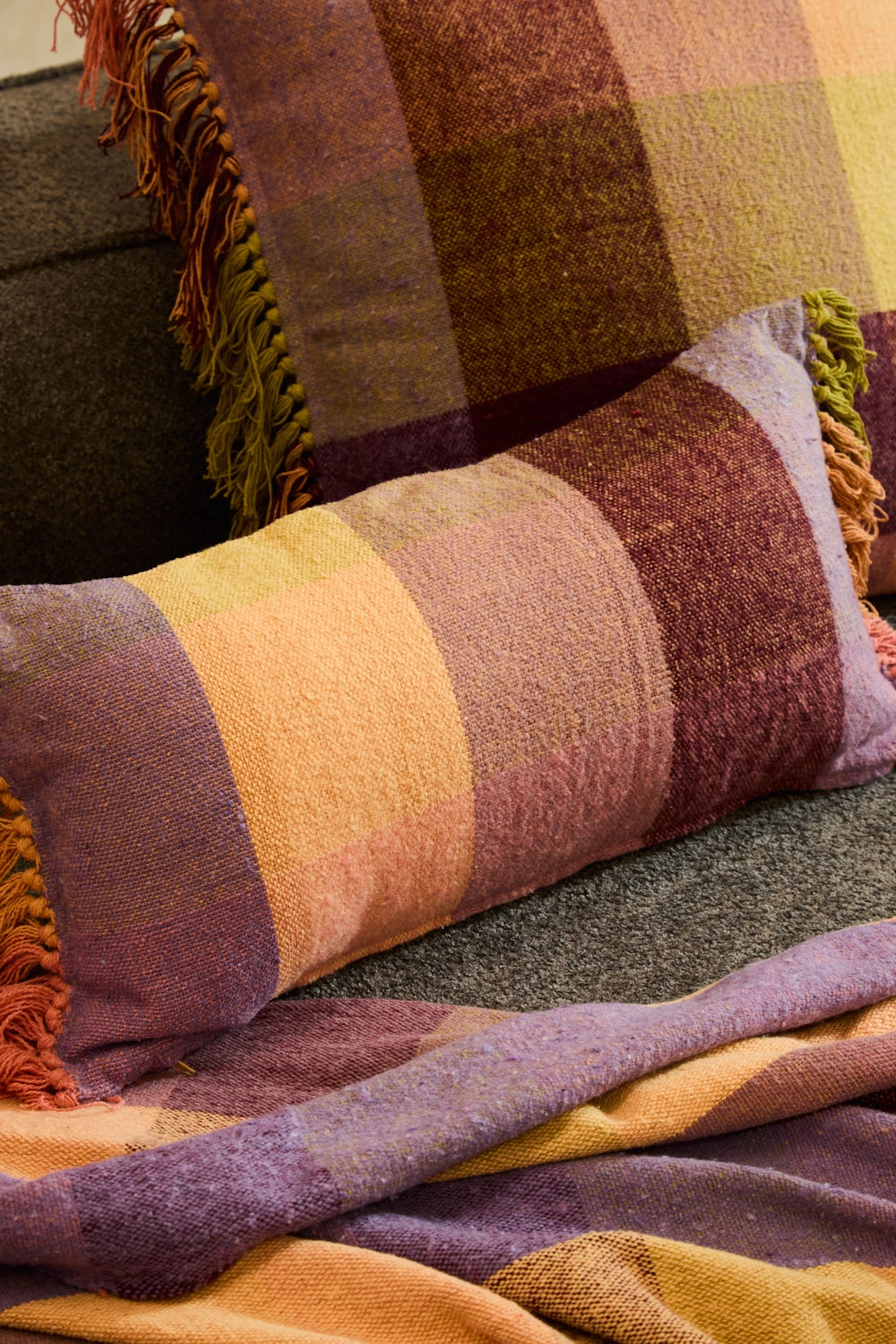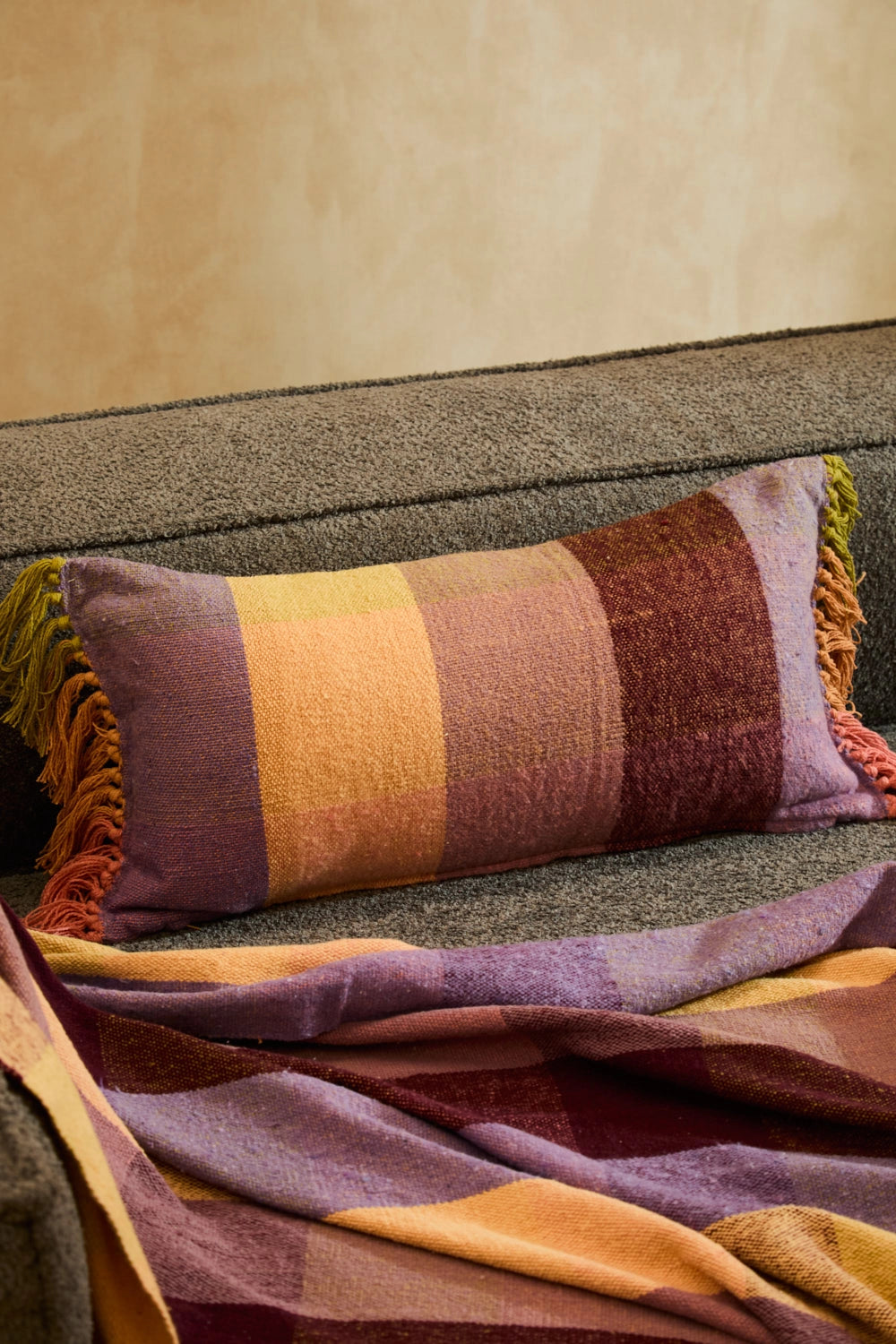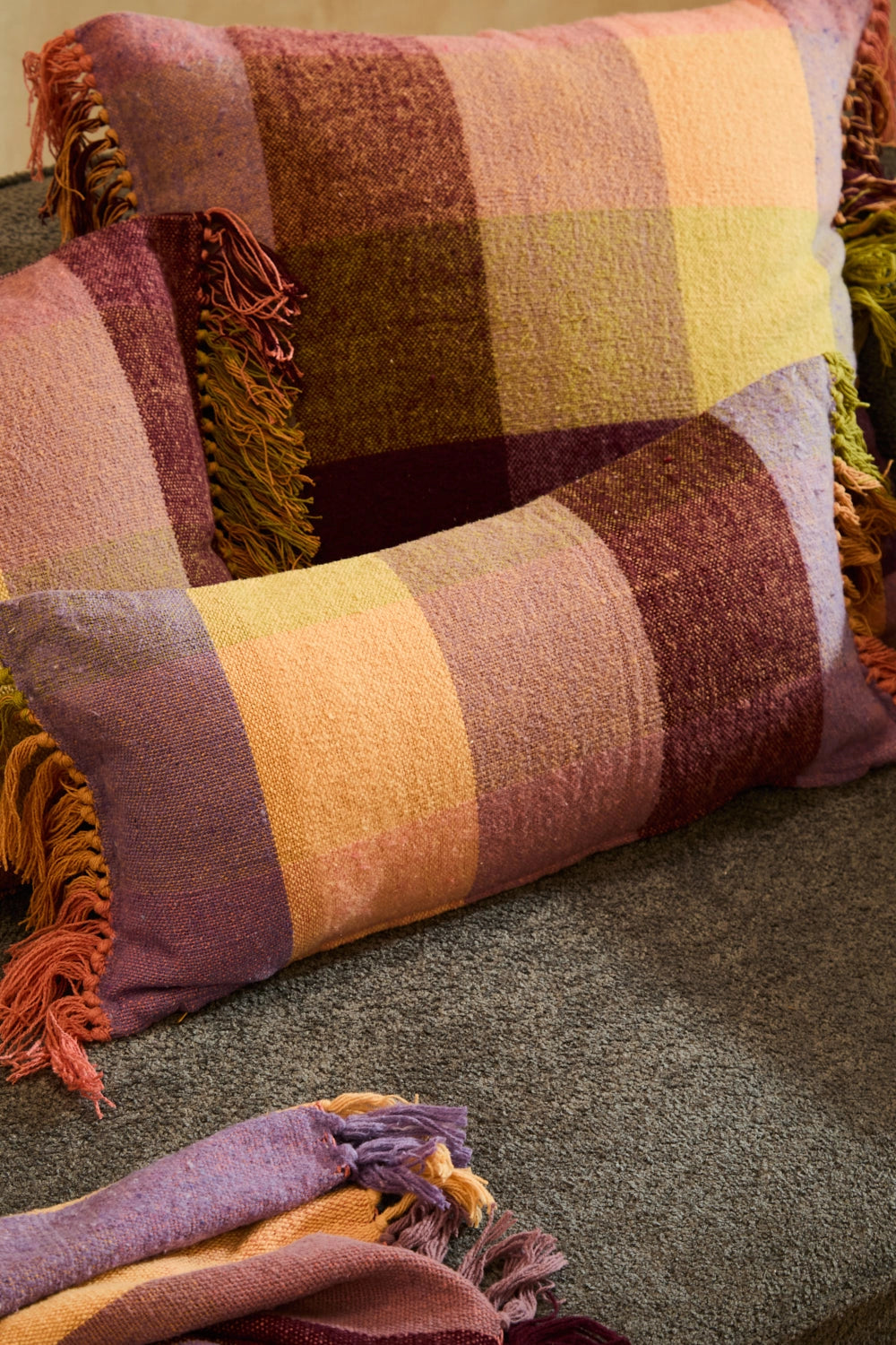 Rectangular flannel cotton cushion cover with a multi-color checkered design. Concealed bottom zipper closure. Back is identical to the front. Fringed trim. Each cushion may have slight color variations due to the dyeing process and screen display.