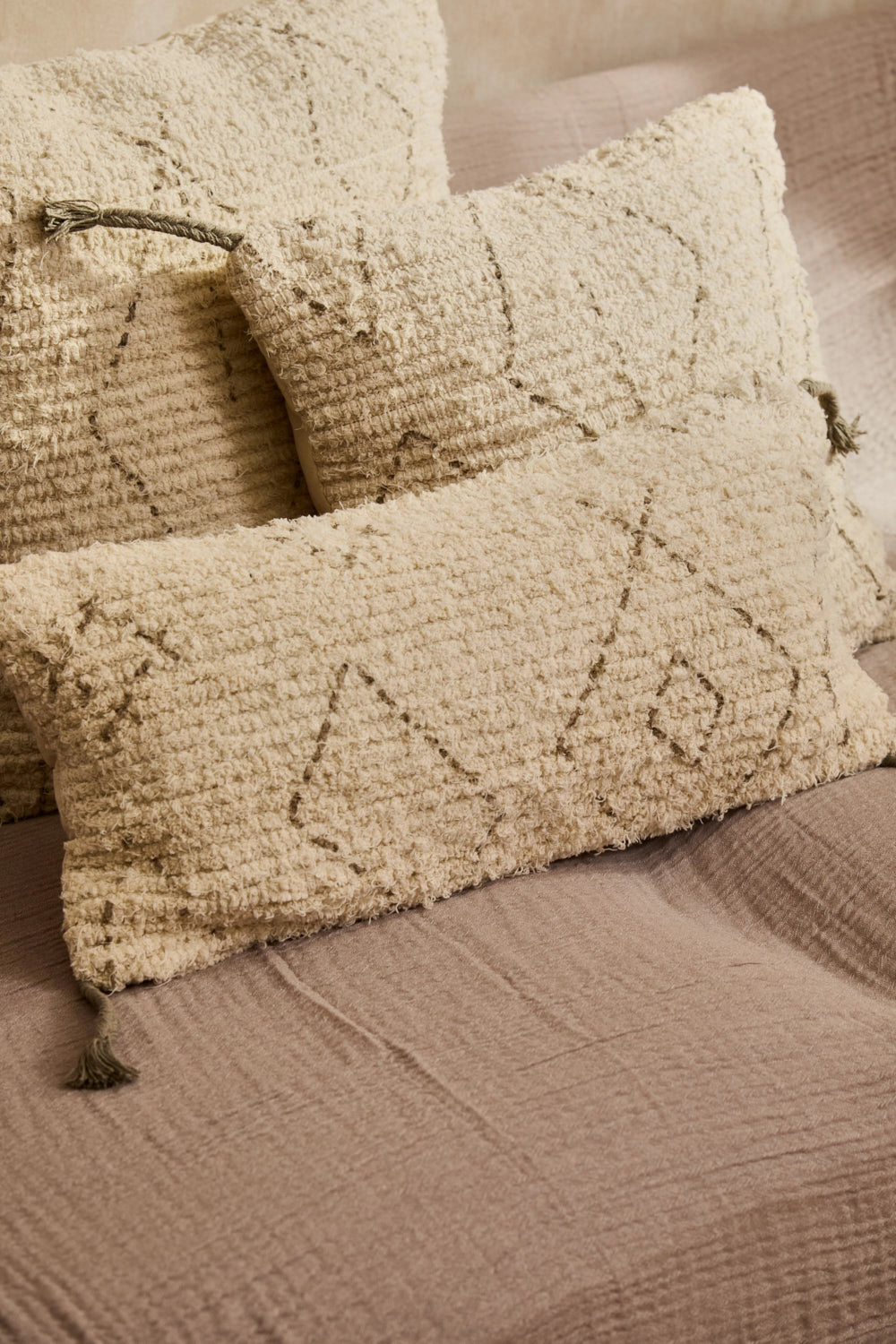 Rectangular slub cotton cushion cover with an ethnic print in earth tones. Plain canvas back. Concealed zipper closure with a mid-height flap. Braided trim. Each cushion may show slight color variations due to the dyeing process and screen display.