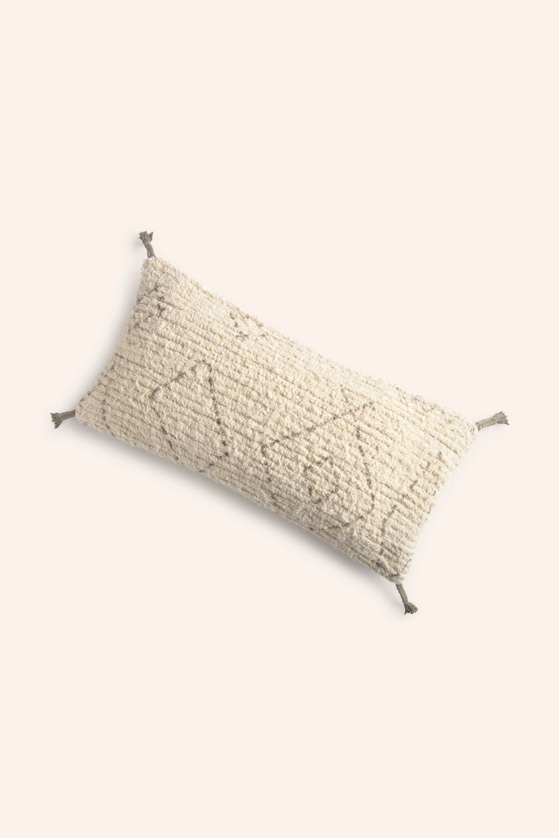 Rectangular cushion cover made of flame-treated cotton with an ethnic motif in a stone tone.