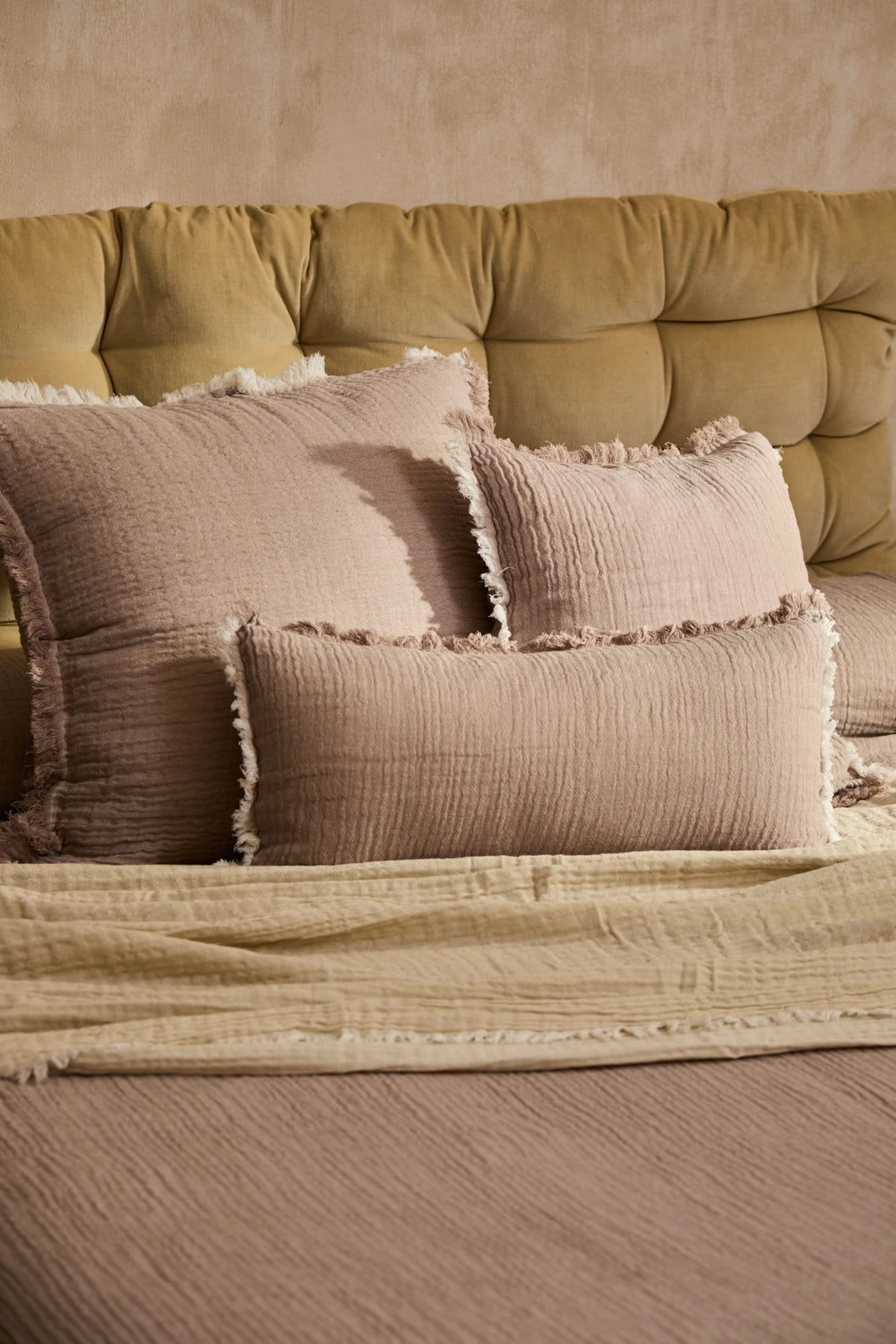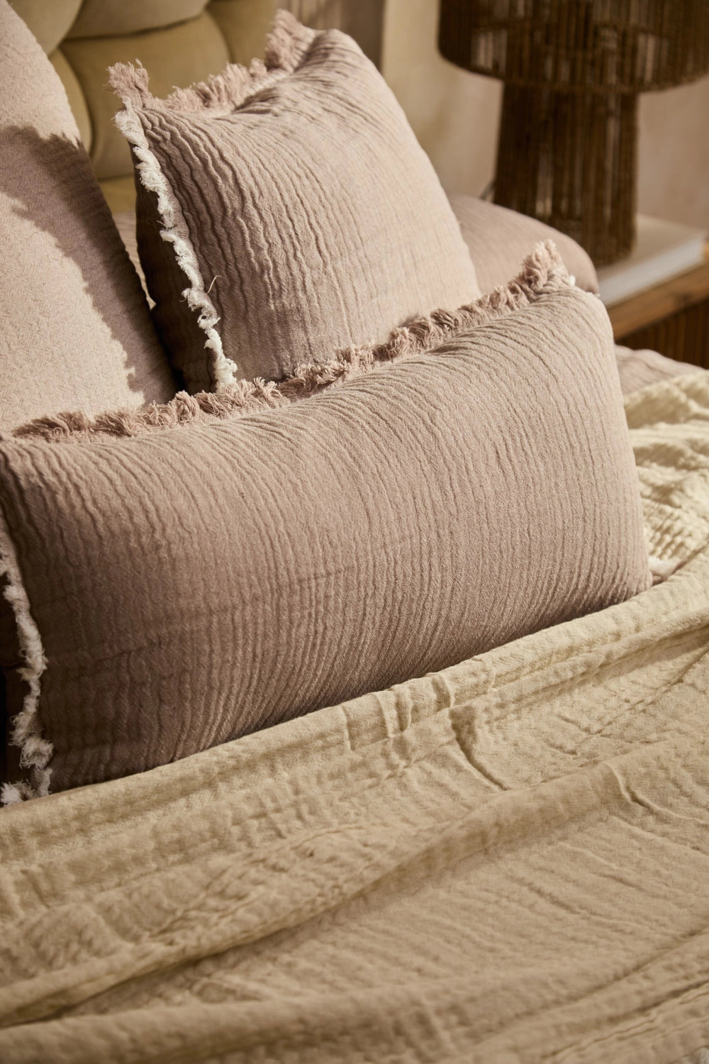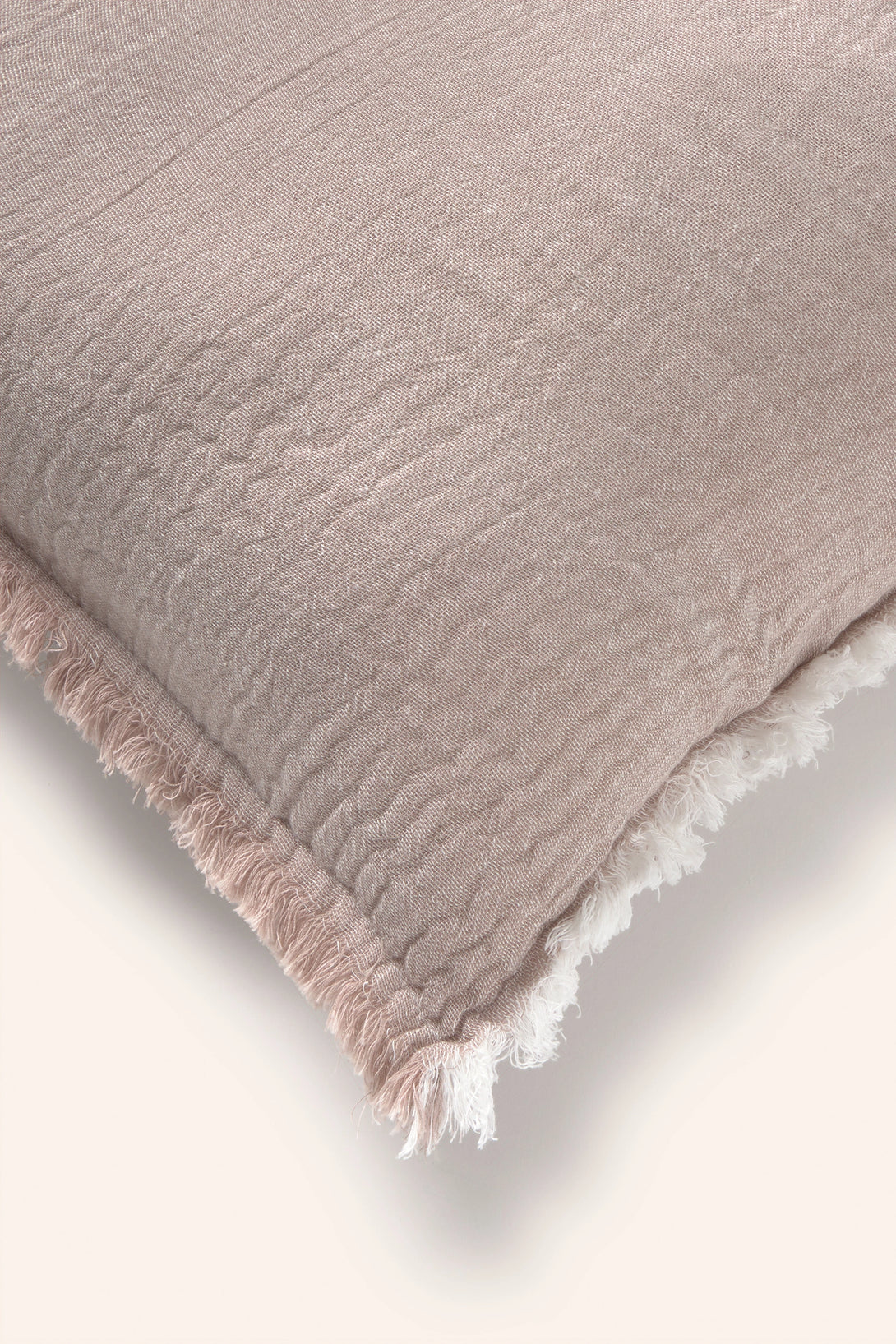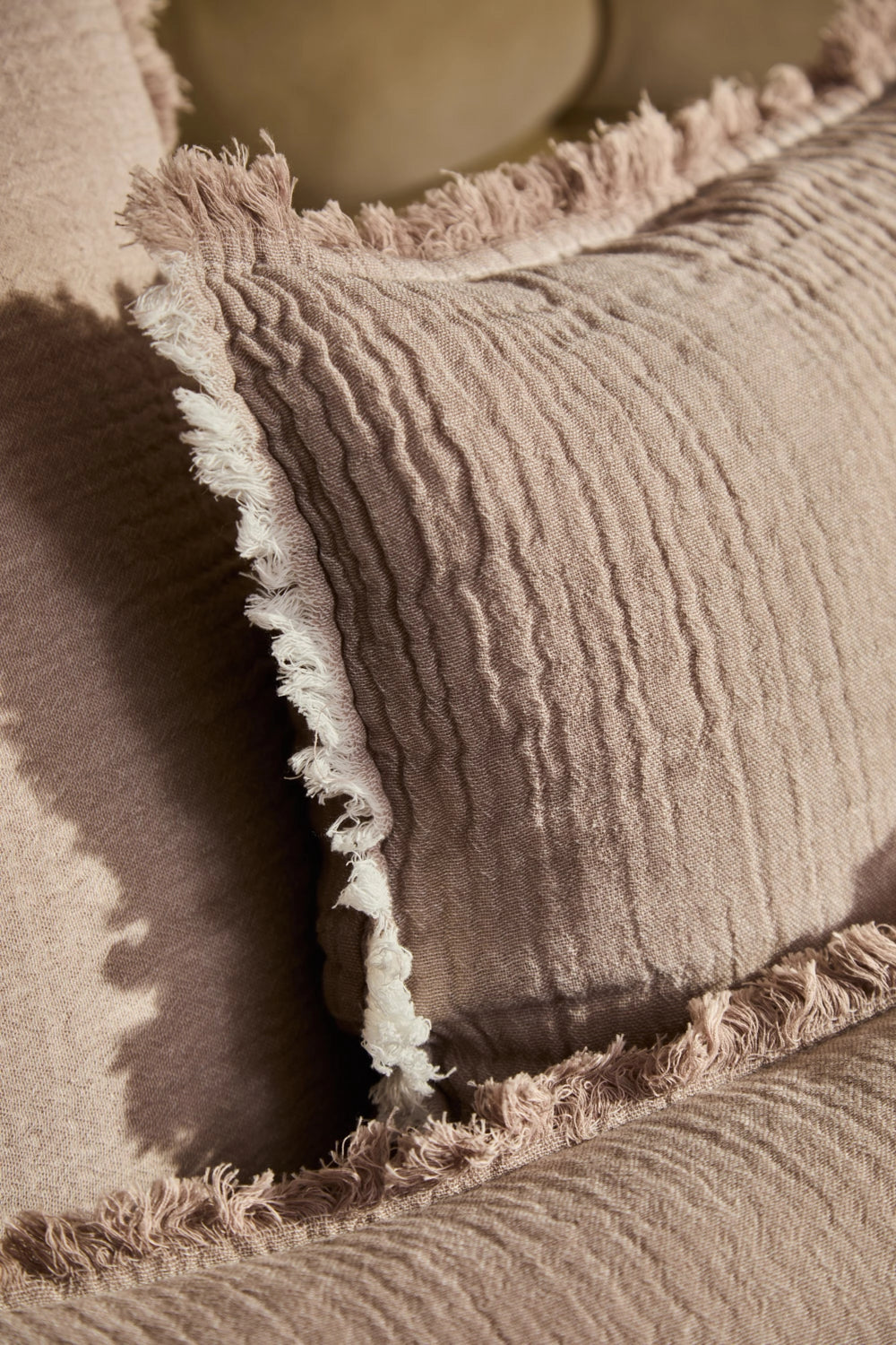 Rectangular cotton muslin cushion cover in a stone tone. The back is identical to the front, with a concealed zipper closure and a mid-height flap. Fringed trim. Each cushion may have slight color variations due to the dyeing process and screen display.