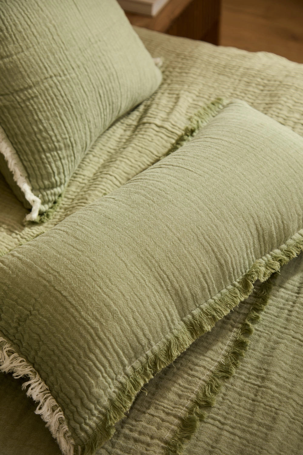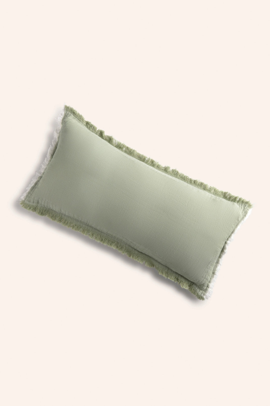 Rectangular cotton muslin cushion cover in green. The back is identical to the front, with a concealed zipper closure and a mid-height flap. Fringed trim. Each cushion may have slight color variations due to the dyeing process and screen display.
