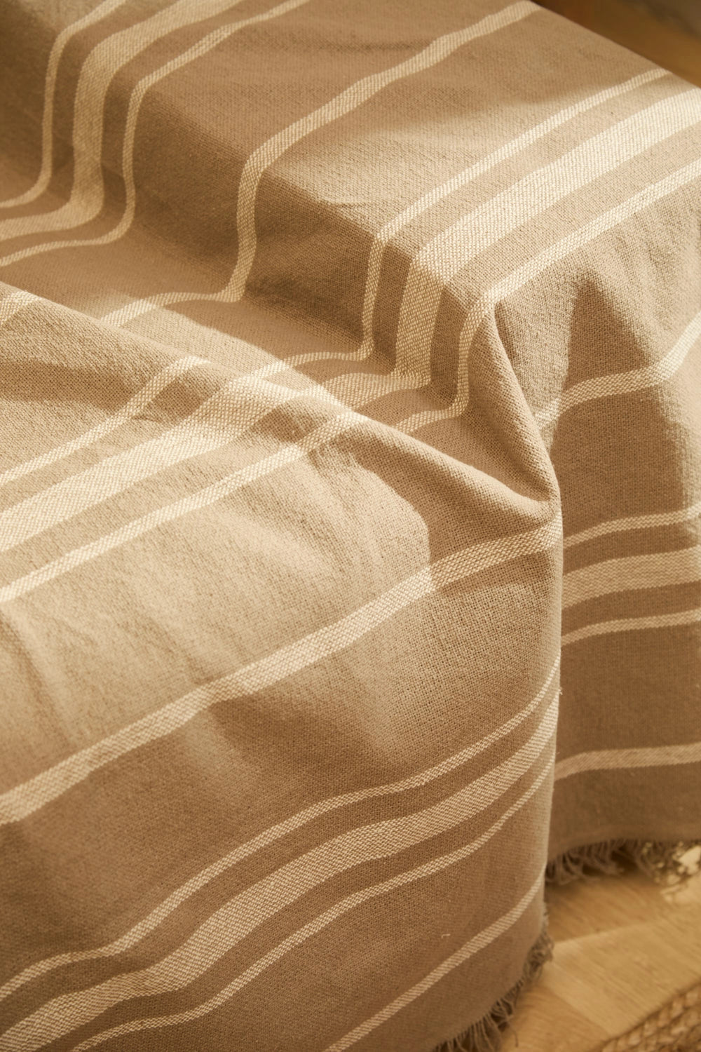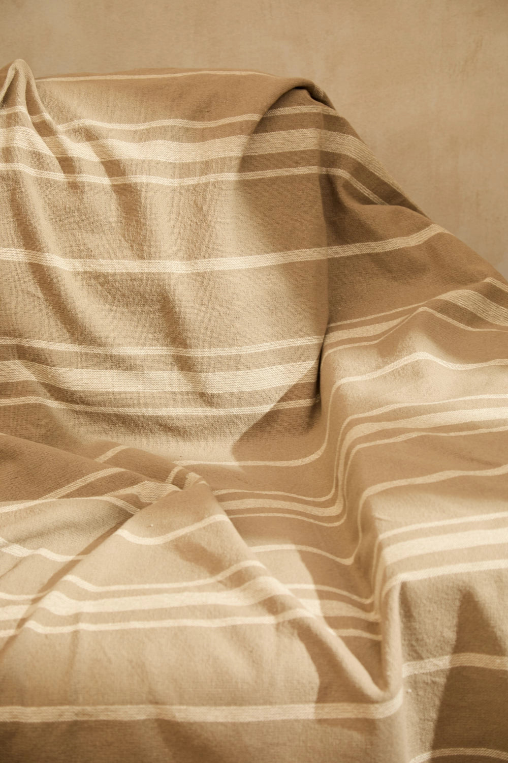 heavyweight cotton bedspread with woven ecru stripes on a stone-tone background. Fringed finish.
