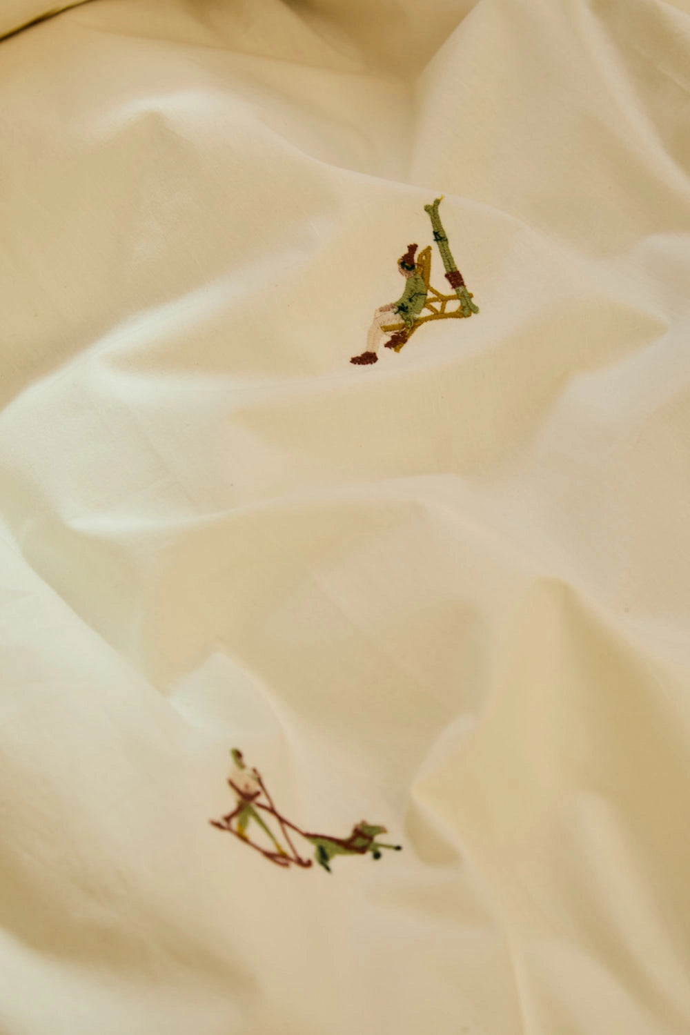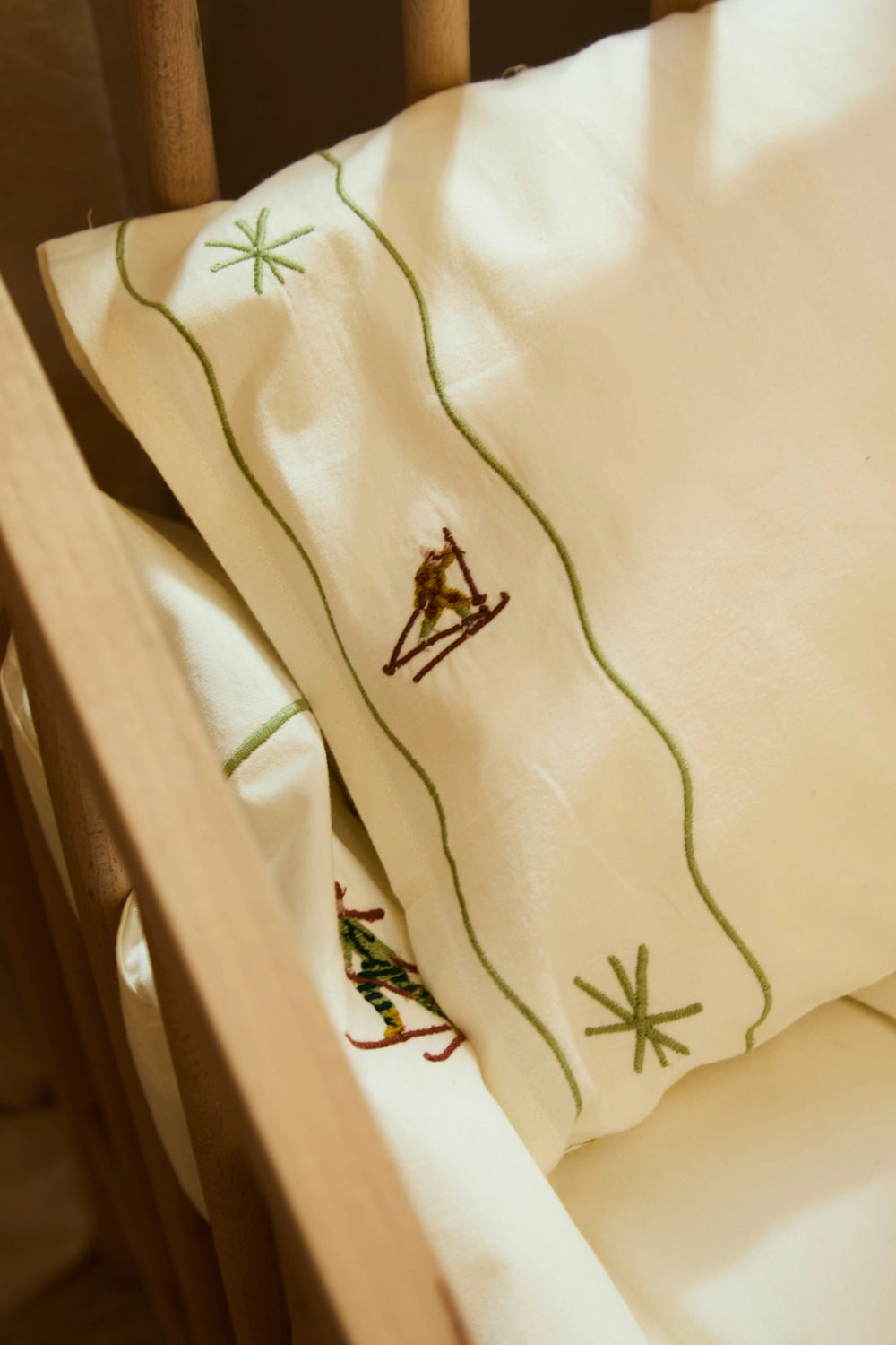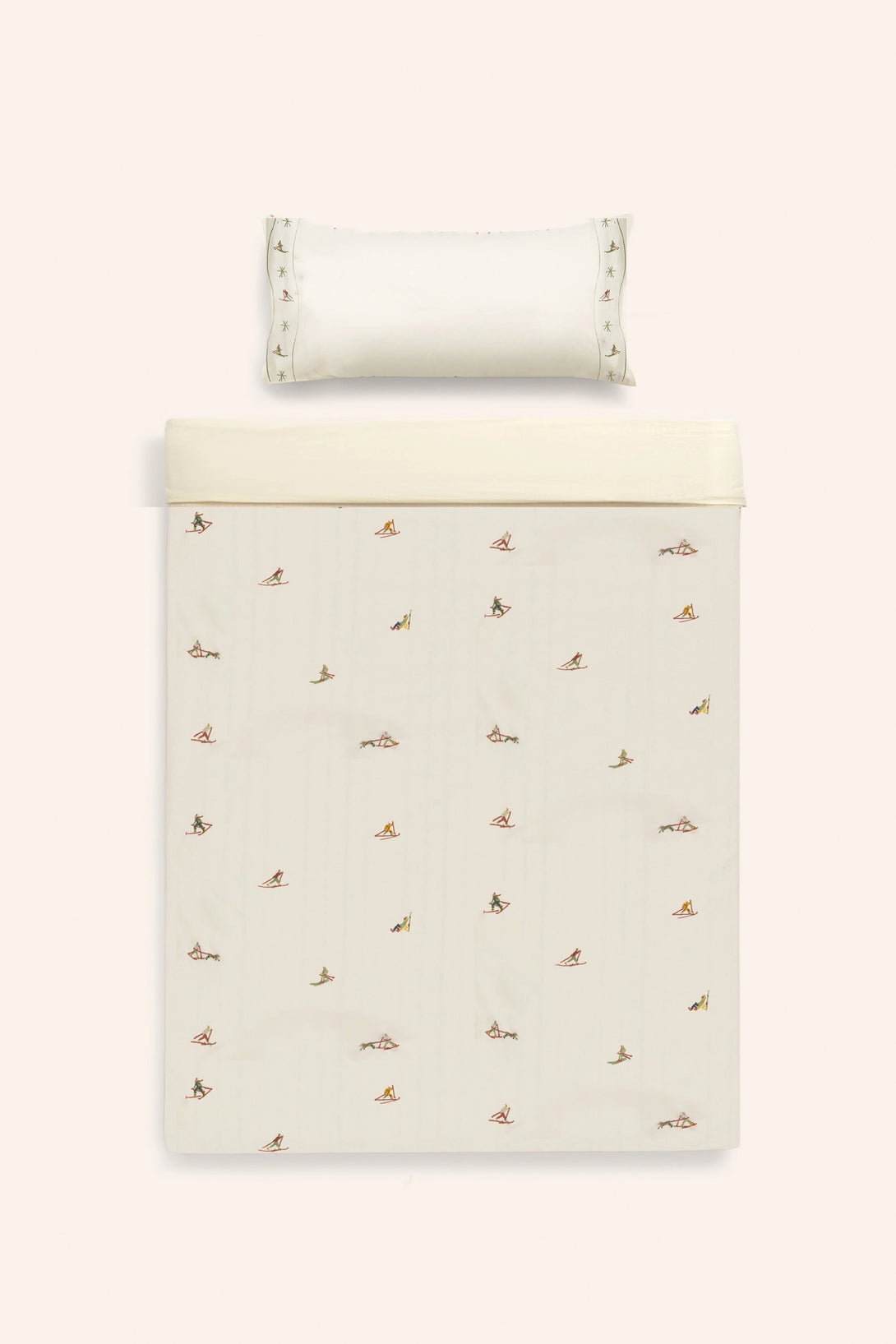 Cotton crib duvet cover and pillowcase set with embroidered skier details. Flap closure.