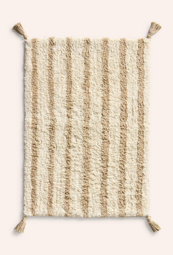 The Helios bath mat, available in two colors, features a beach-inspired design full of character and freshness. With its pom-poms, it adds a touch of freshness to the environment. This bath mat is the perfect complement to welcome your footsteps after a shower or when getting out of bed. Its design makes it a key piece in any room. Additionally, it is machine washable for added convenience.