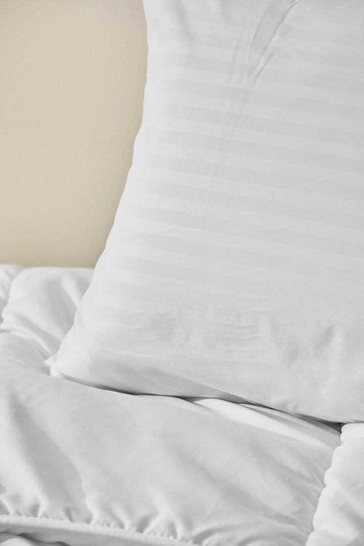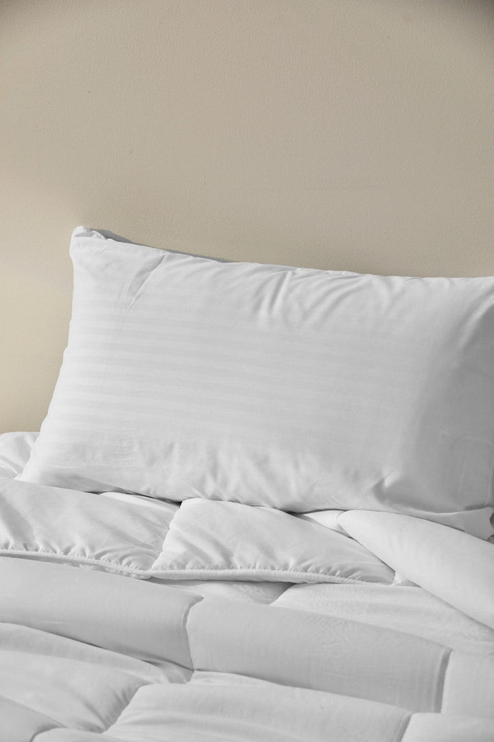 The Eco white pillow is made from recycled polyester fiber, making it an environmentally friendly product. Its filling is composed of 100% siliconized conjugated hollow recycled polyester fiber, while its outer cover is made of very soft polyester microfiber. This product is certified by the Global Recycled Standard, ensuring its quality and sustainability. Additionally, the recycled polyester used in its manufacturing consumes 80% less energy than virgin polyester fiber, making it a more eco-friendly option.