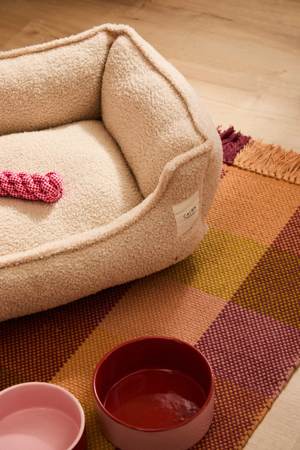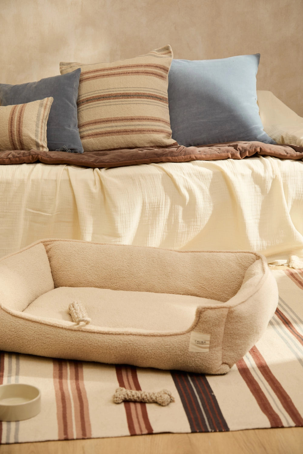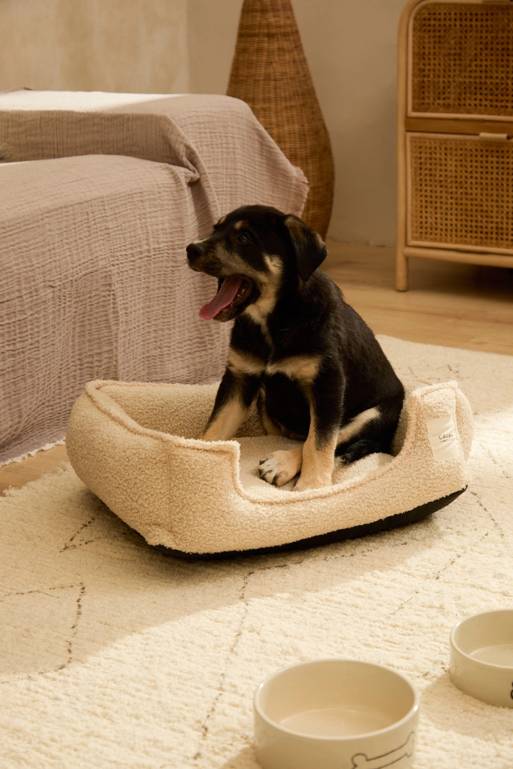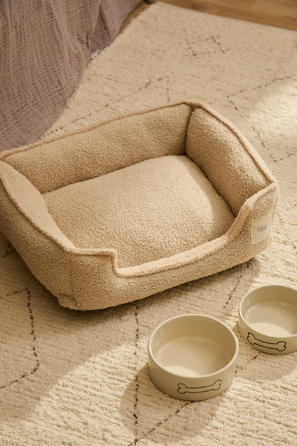 Removable cover pet bed in ecru. Blanket fabric. The inner cushion is removable. Zipper closure. Non-slip bottom.