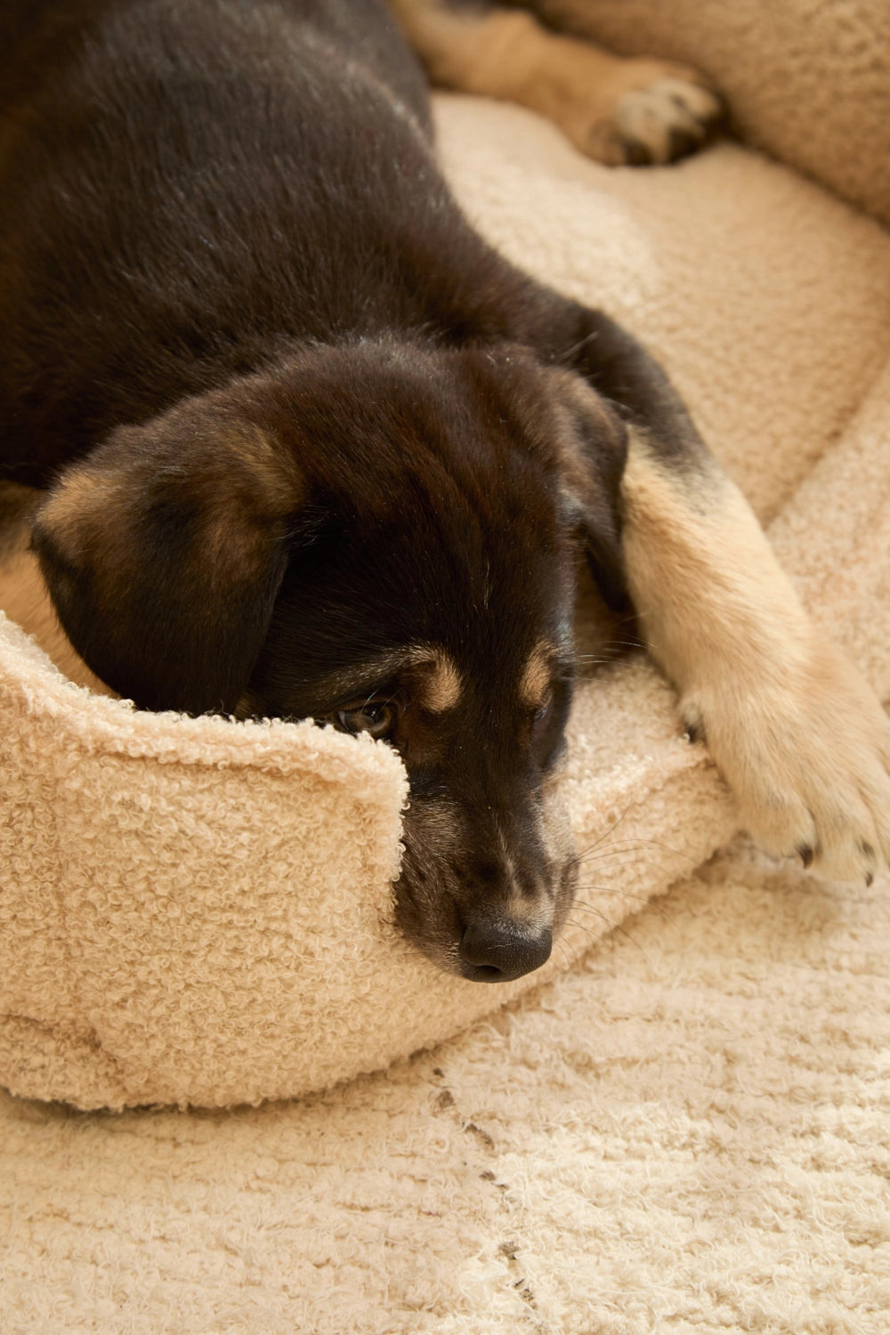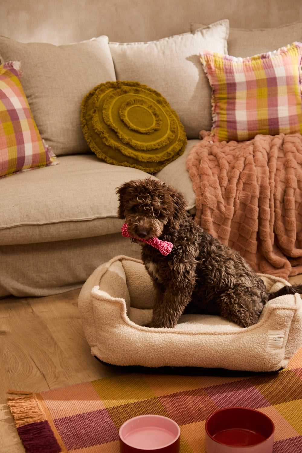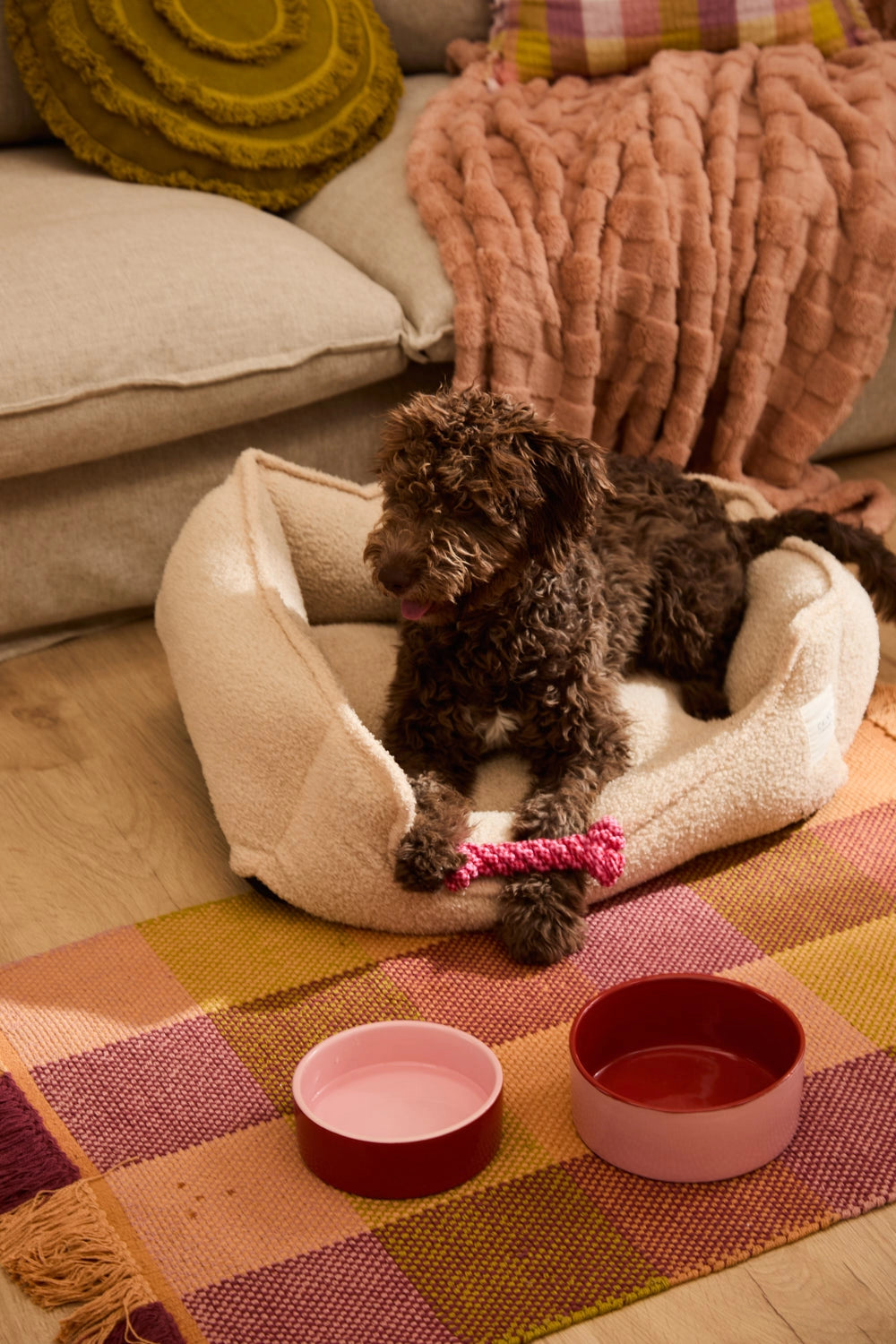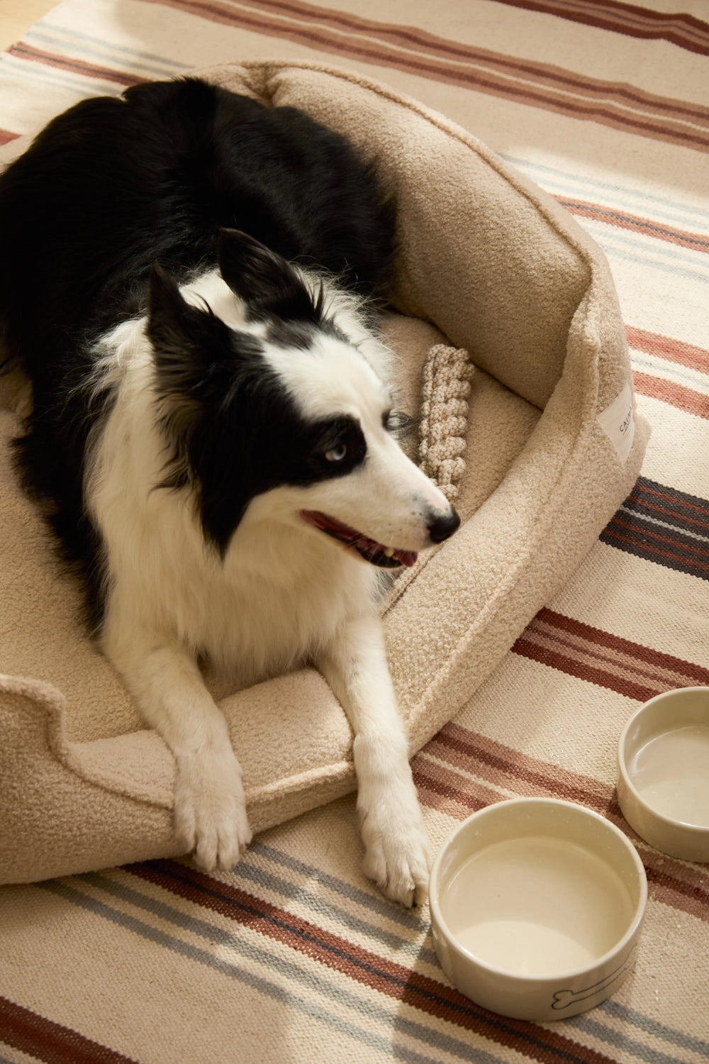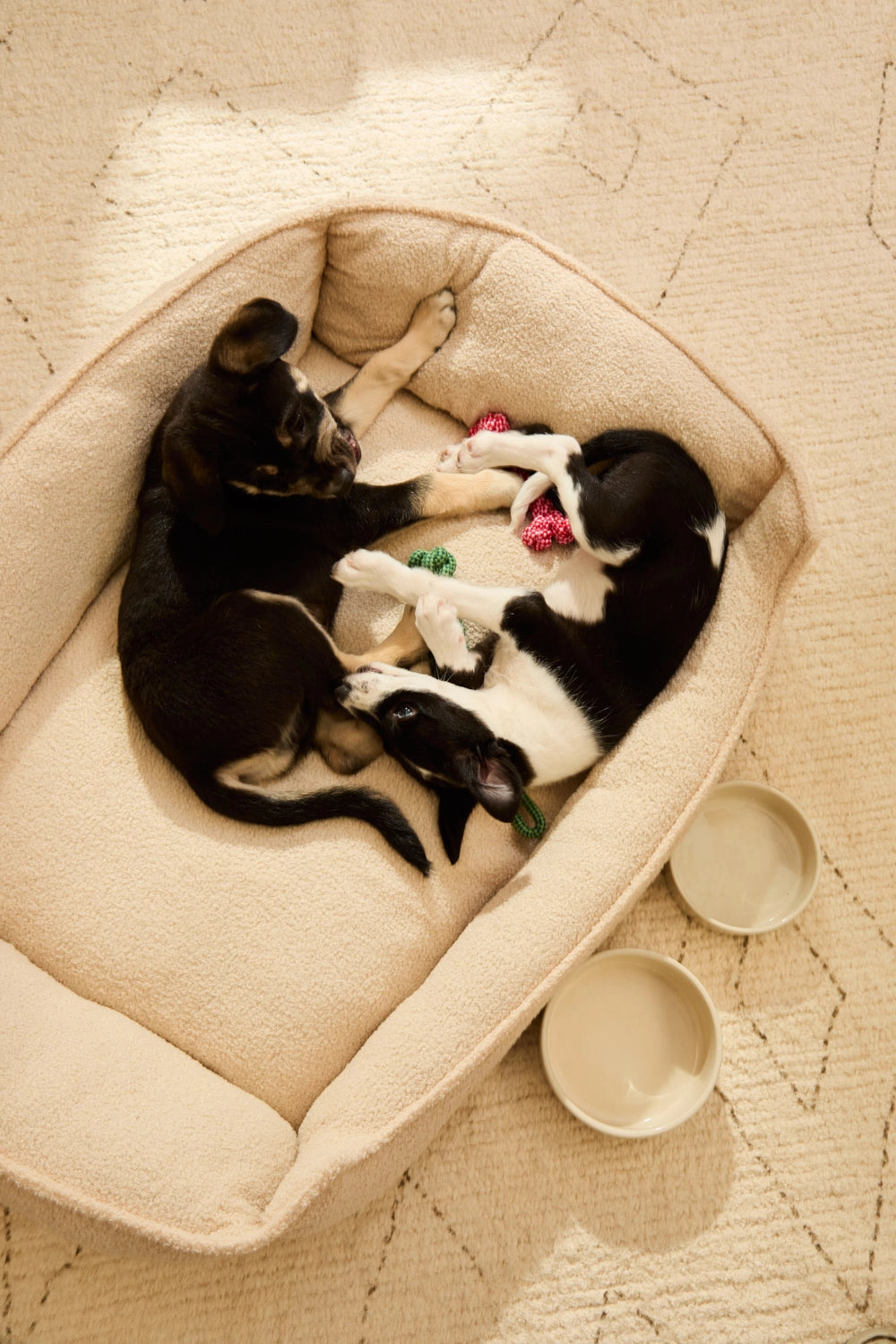 Removable cover pet bed in ecru. Blanket fabric. The inner cushion is removable. Zipper closure. Non-slip bottom.