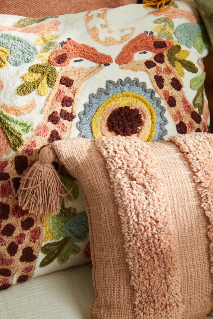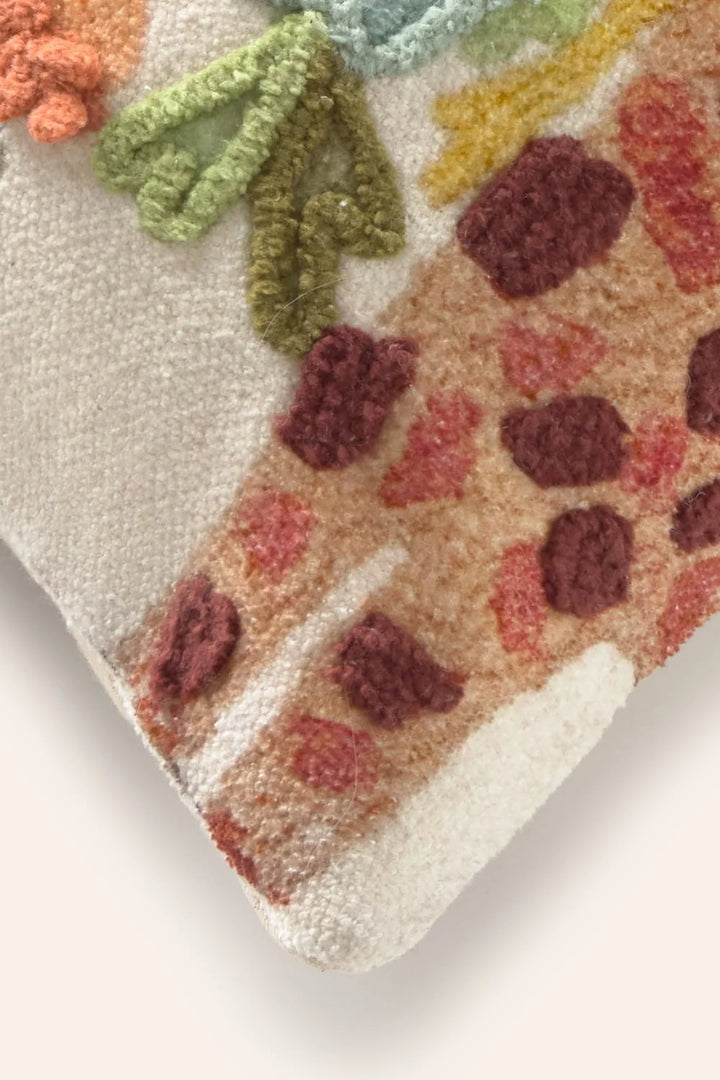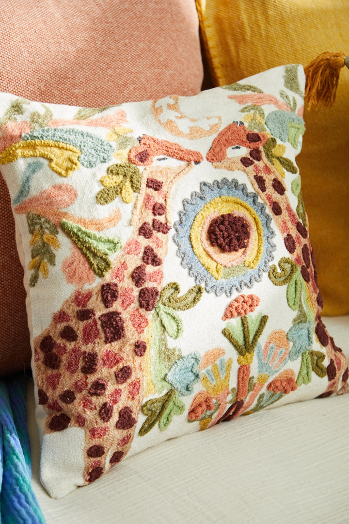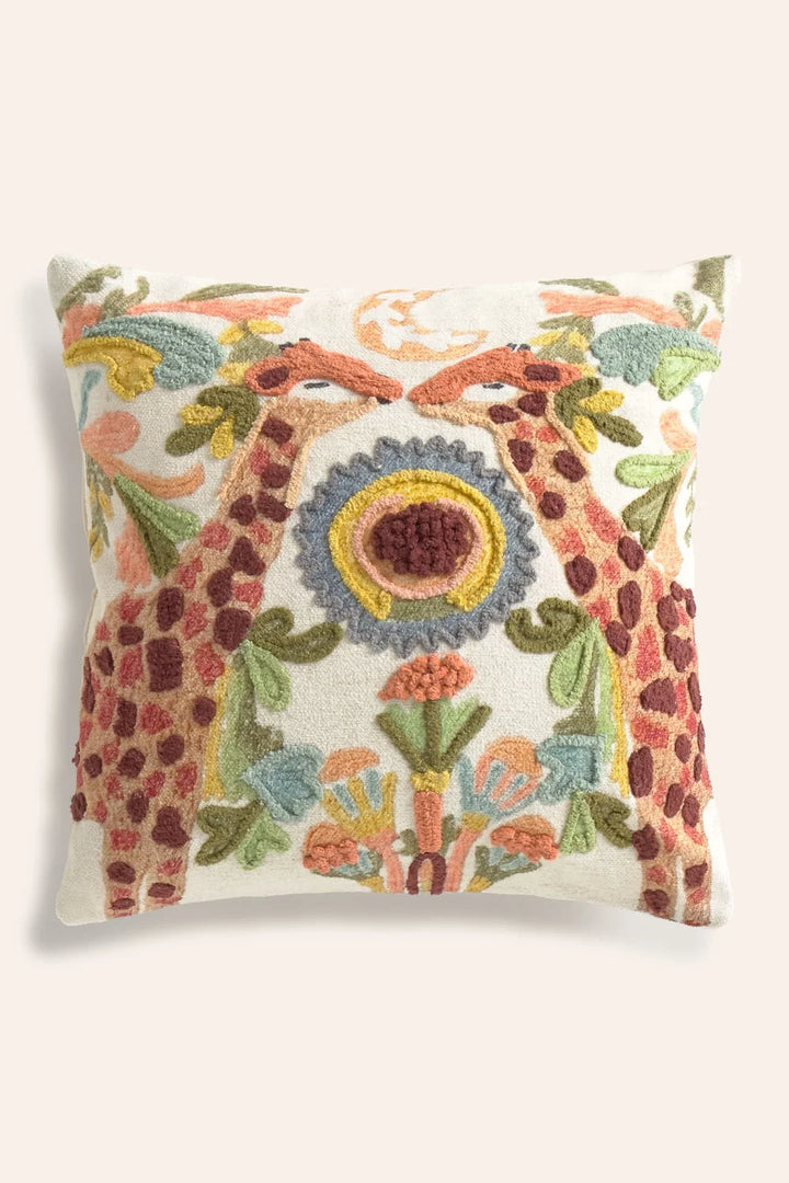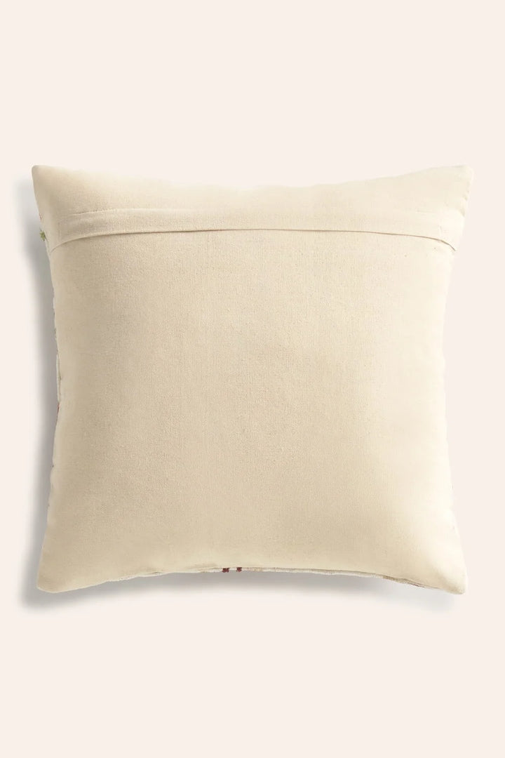 Hand-embroidered cotton cushion cover that combines with the printing technique. Plain canvas back with zipper halfway hidden in flap.