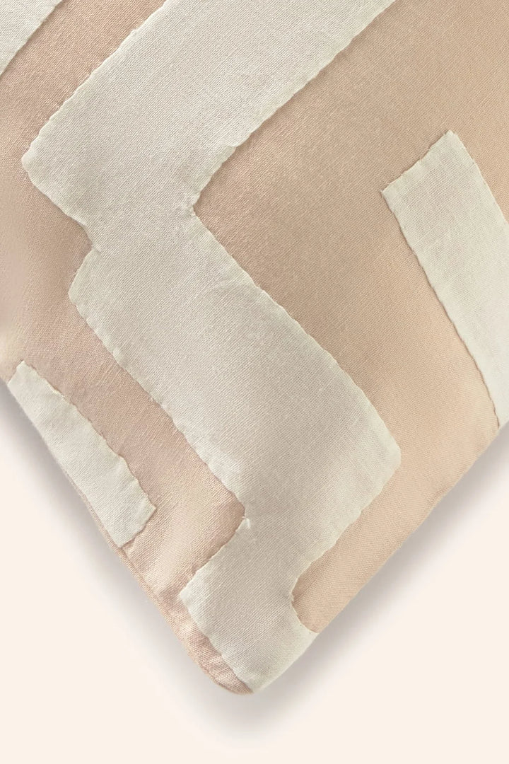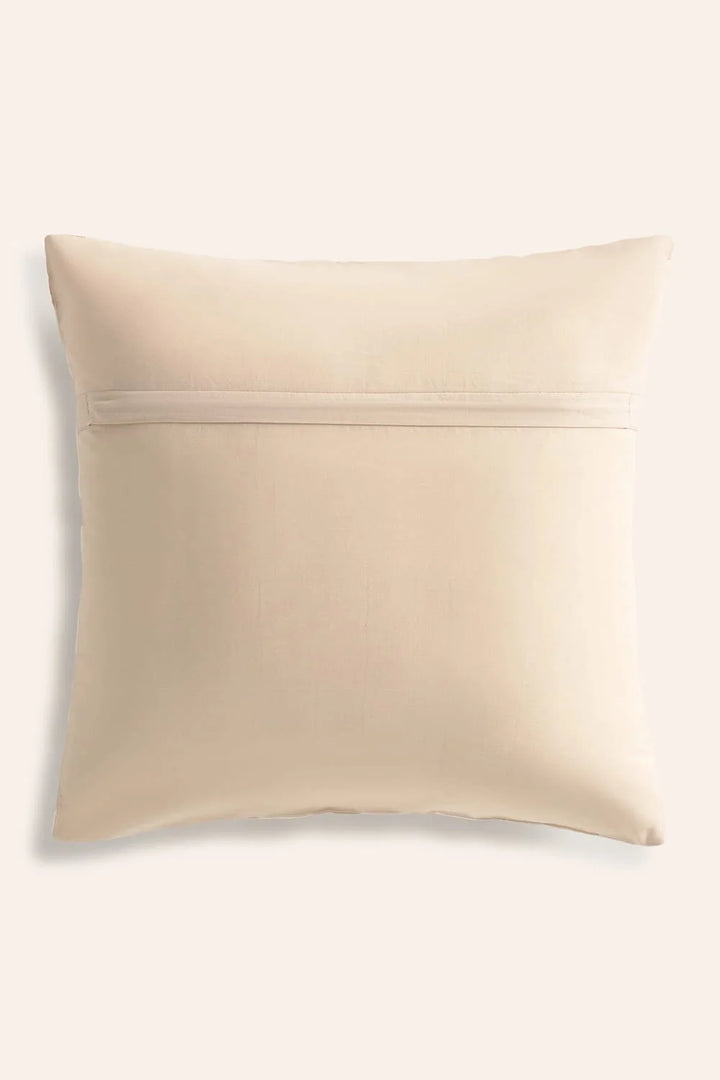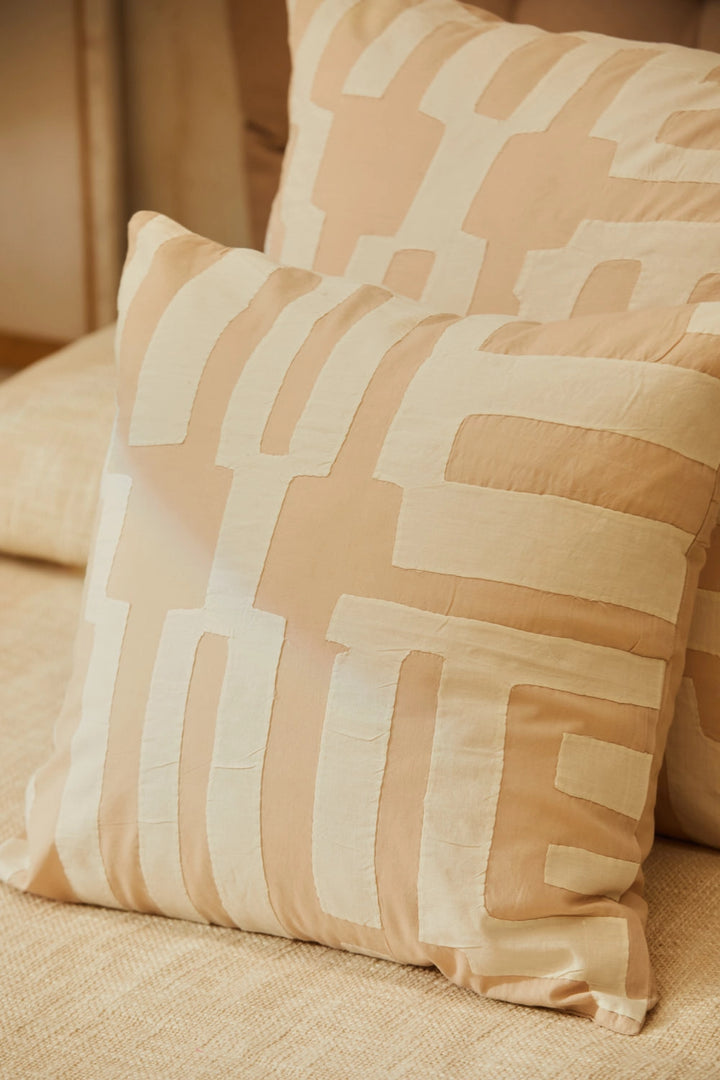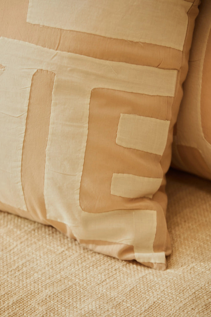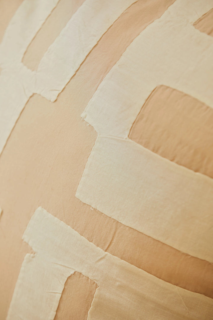 Stone-coloured cotton cushion cover with ecru fabric mosaic sewn on the front. Plain stone-coloured back with concealed mid-height zip with flap.