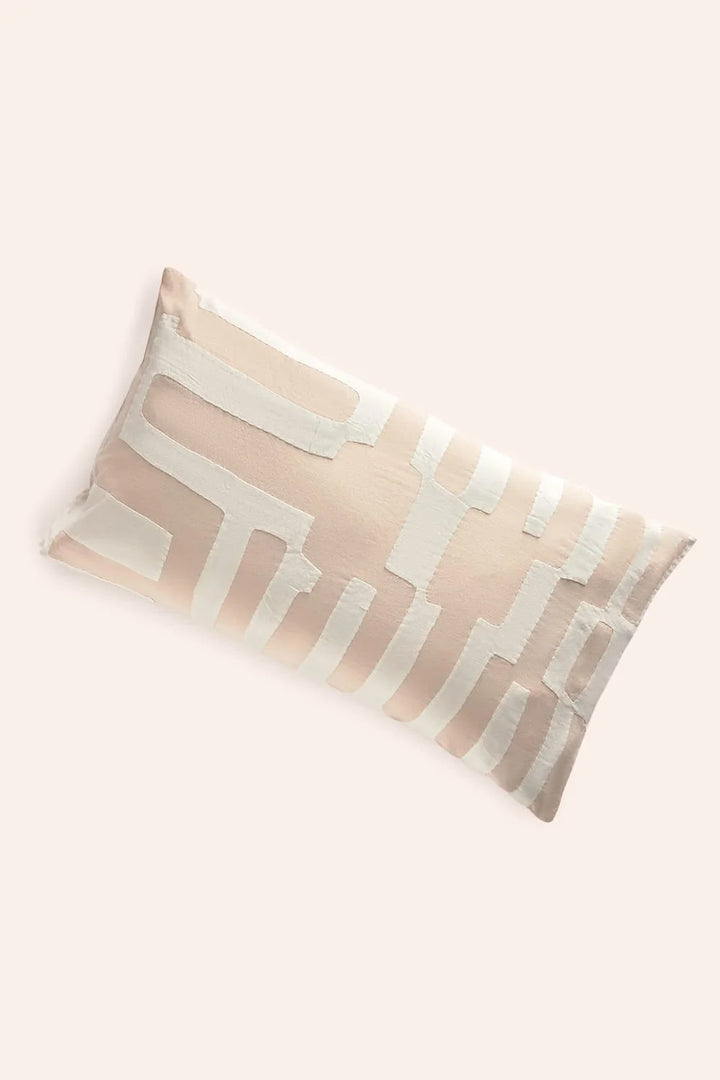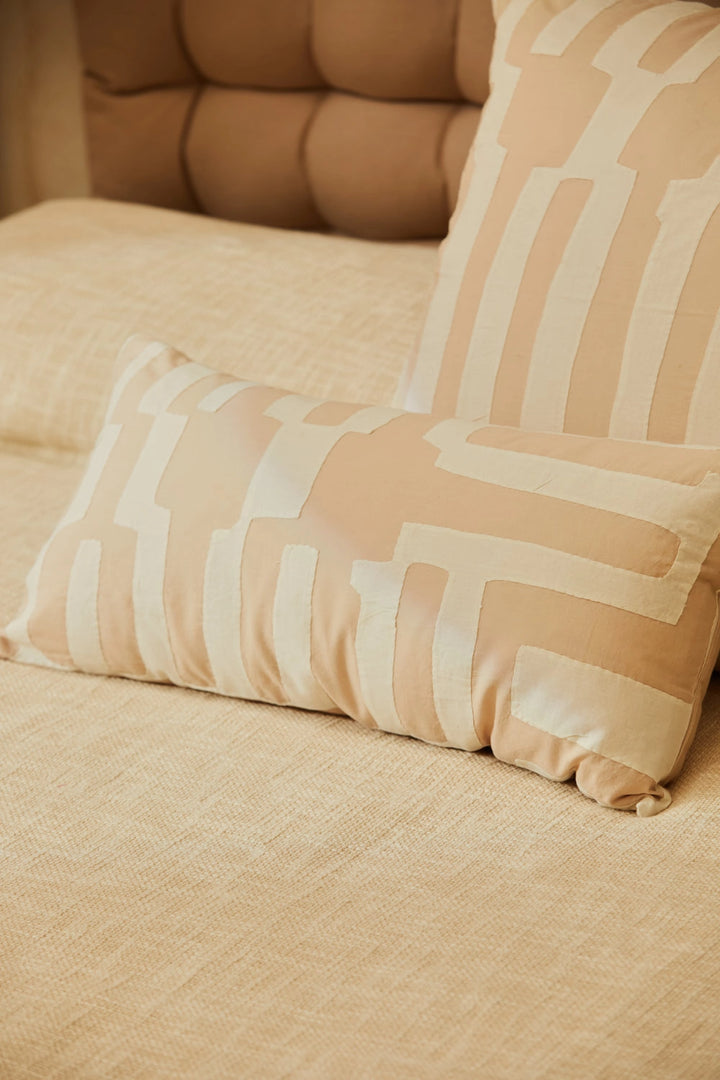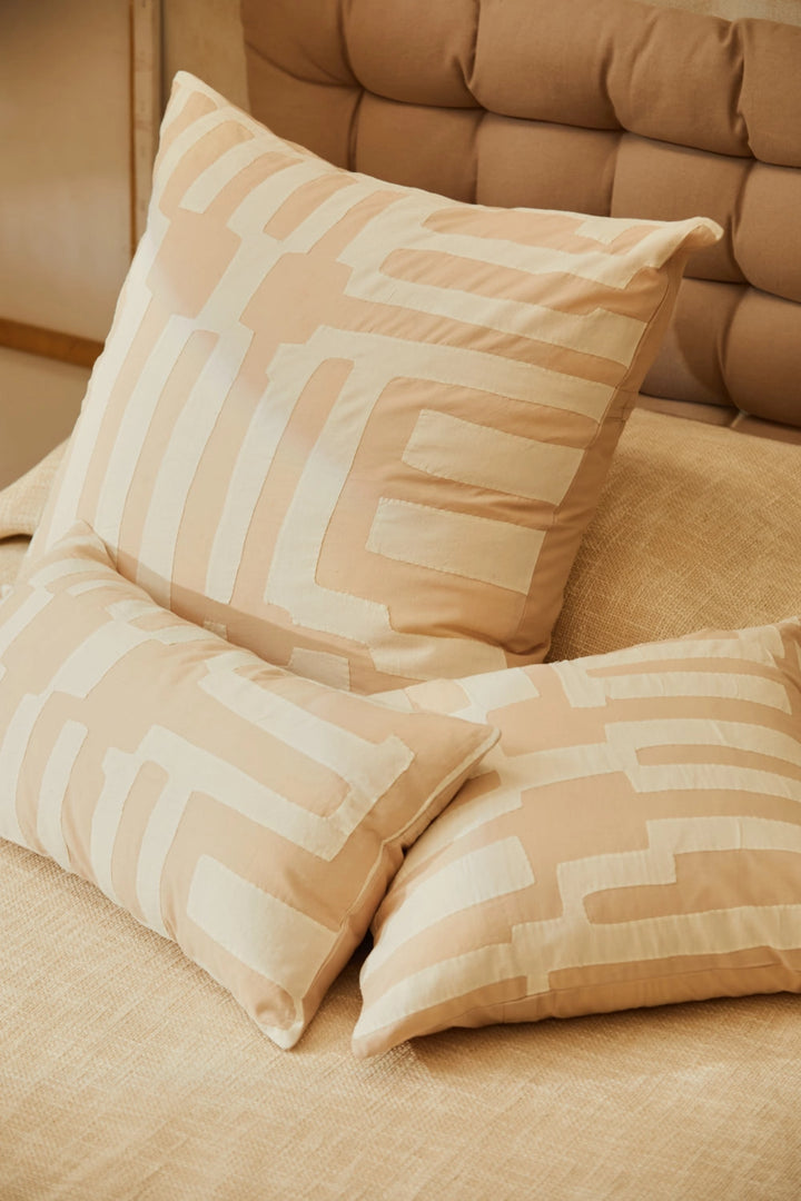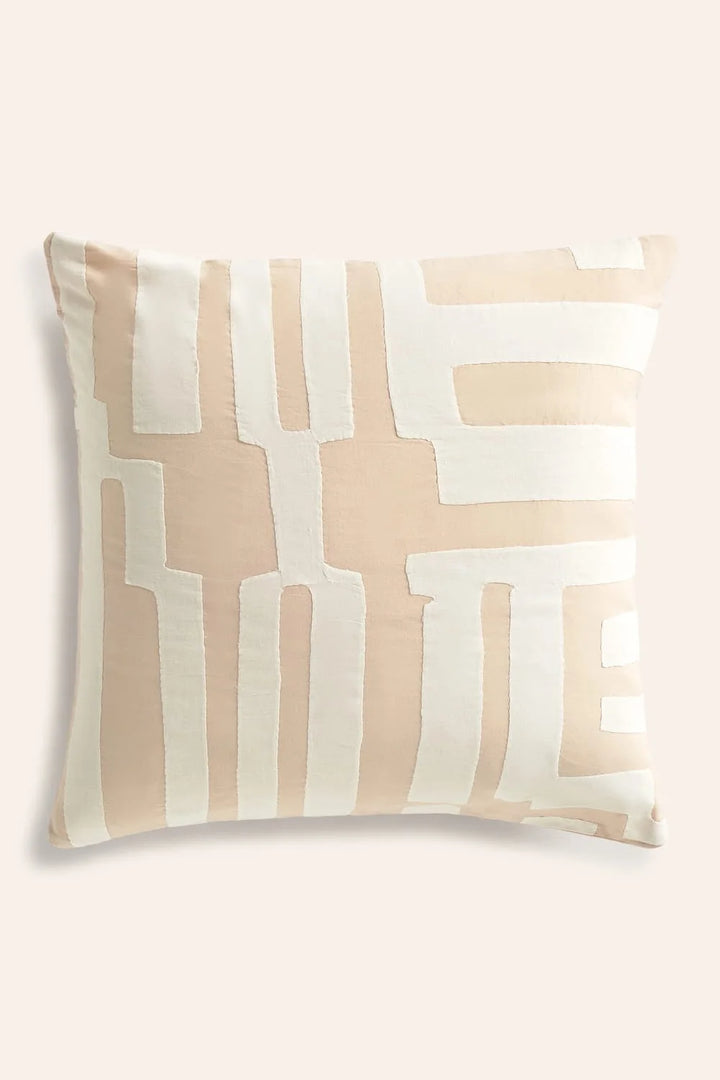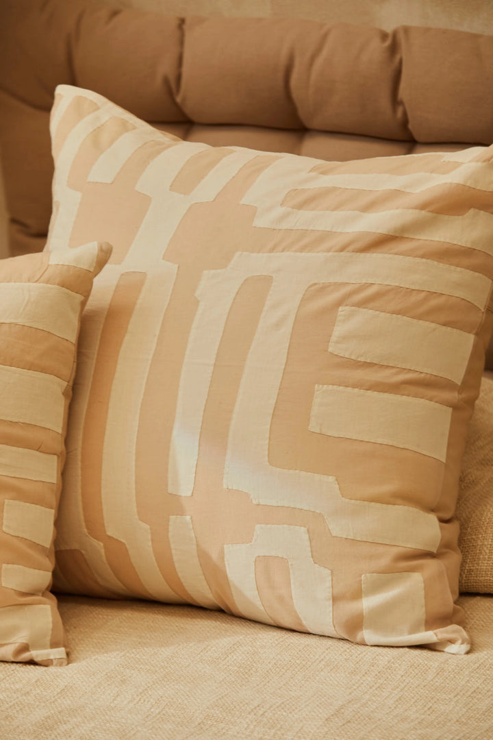 Stone-coloured cotton cushion cover with ecru fabric mosaic sewn on the front. Plain stone-coloured back with concealed mid-height zip with flap.