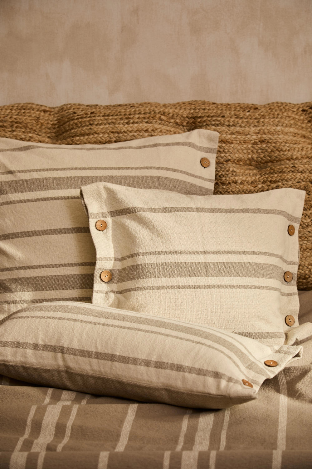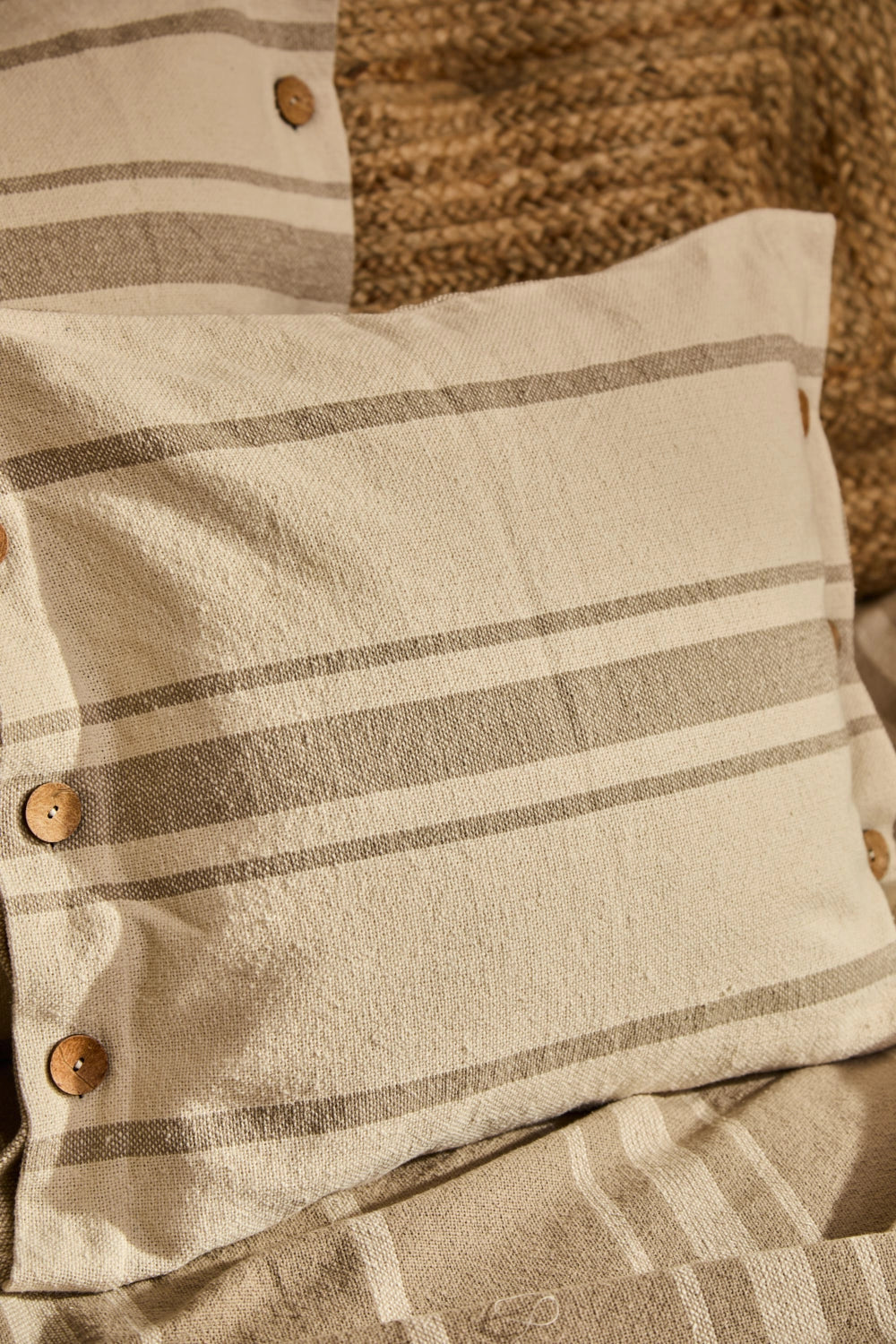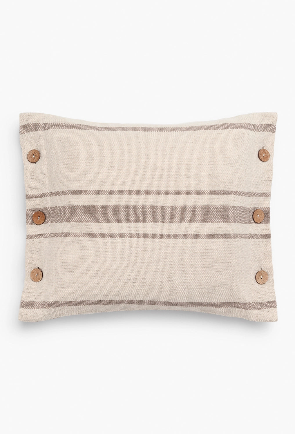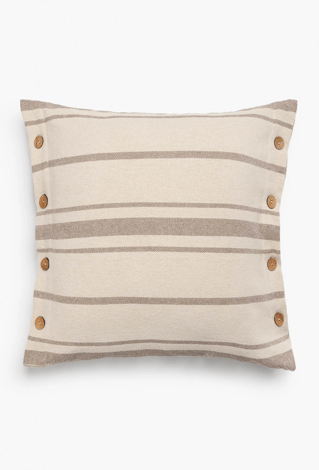 Square cushion cover with beige stripes on an ecru background. Coconut button closure. The back is identical to the front. Each cushion may have slight color variations due to the dyeing process and screen display.