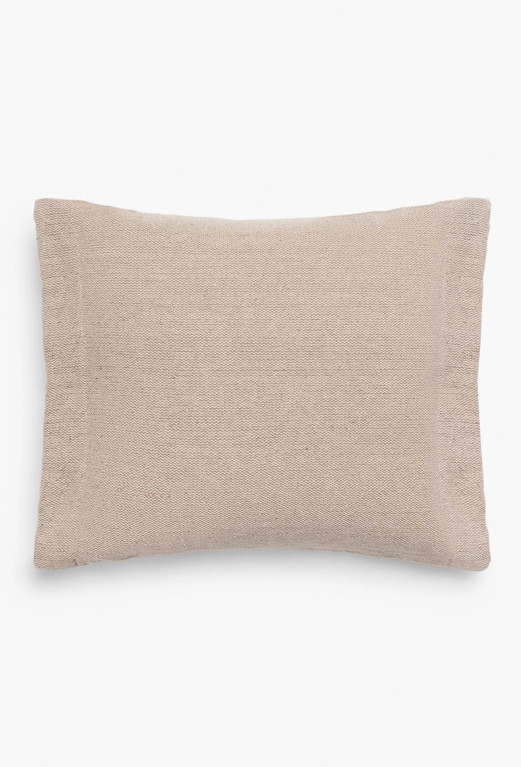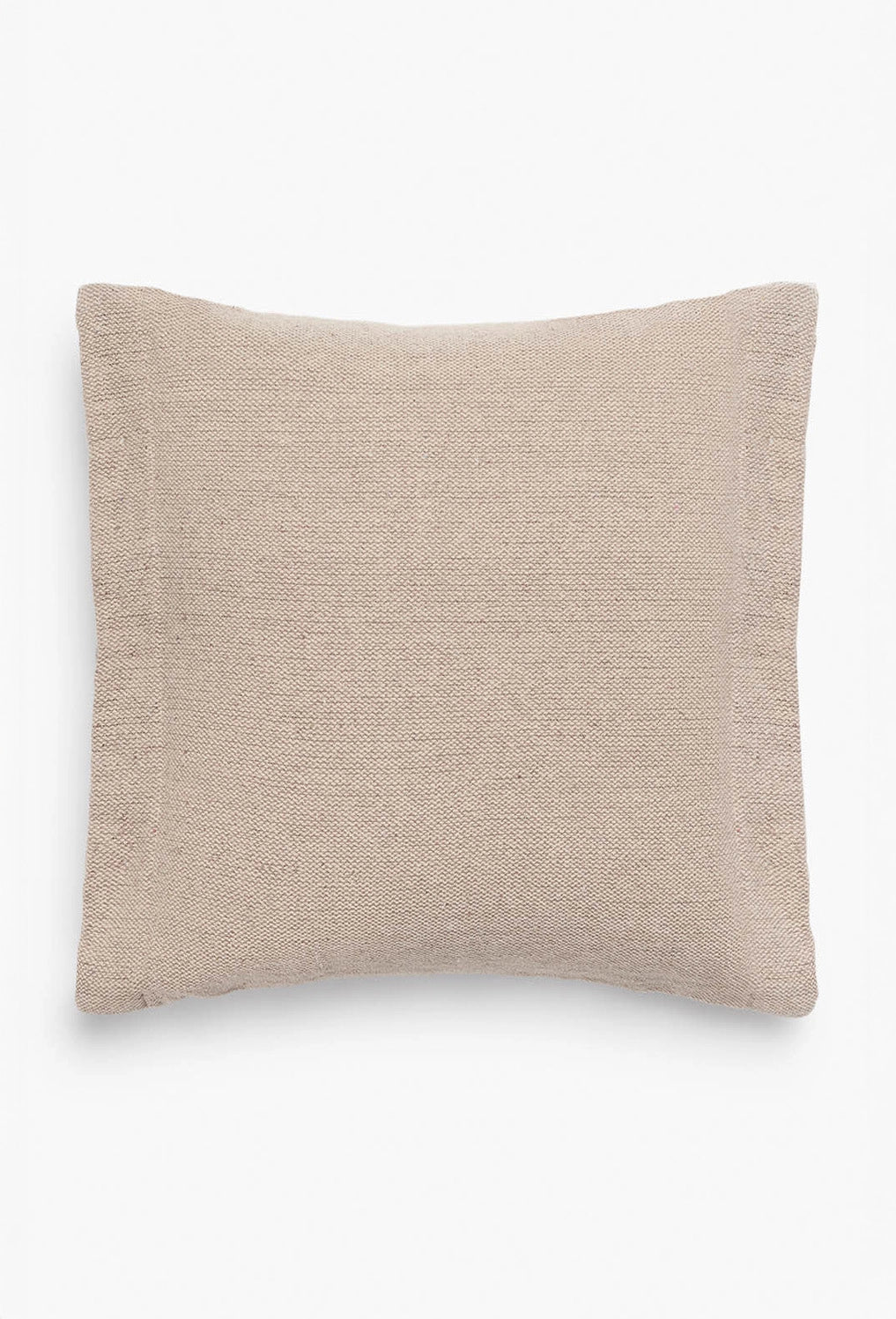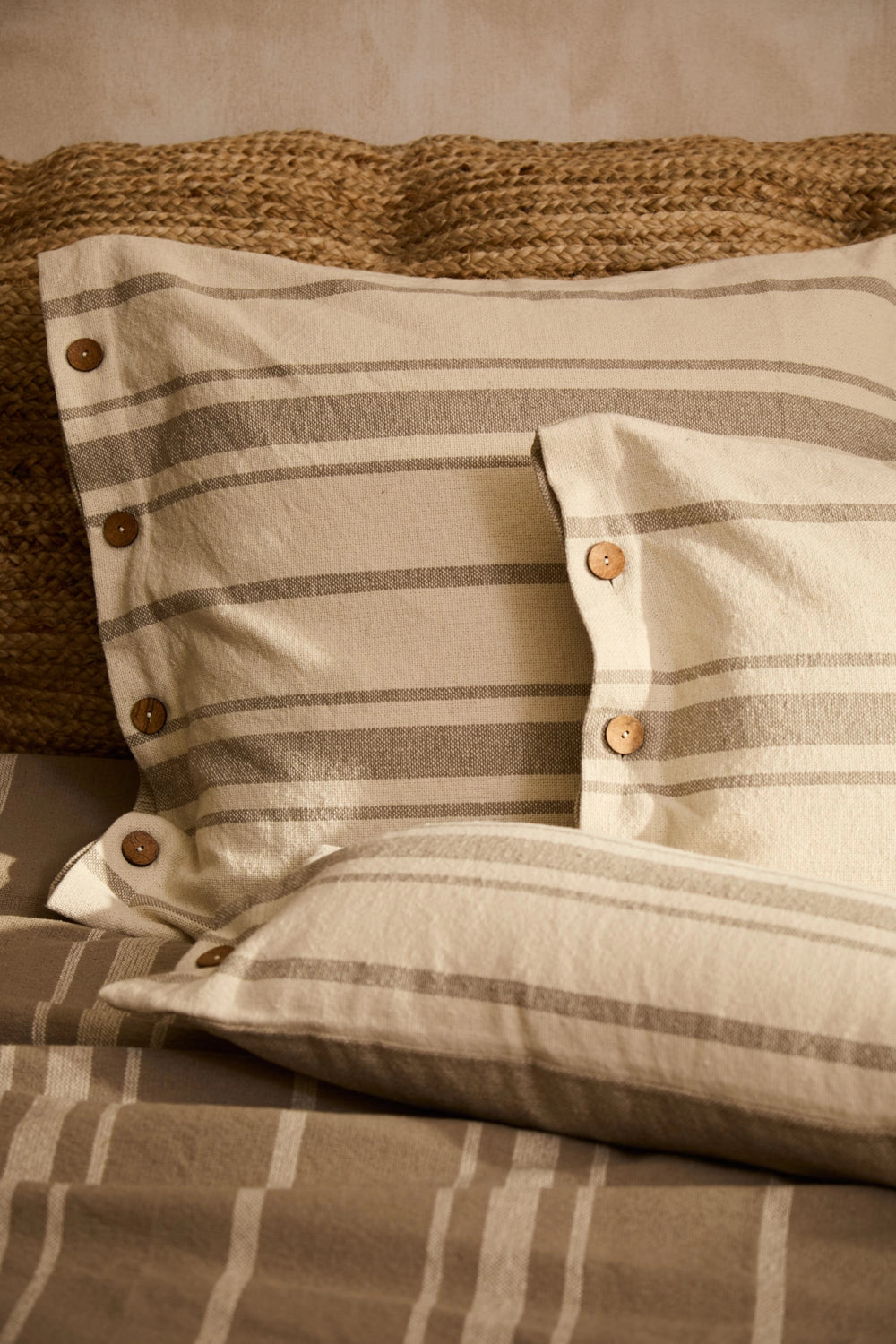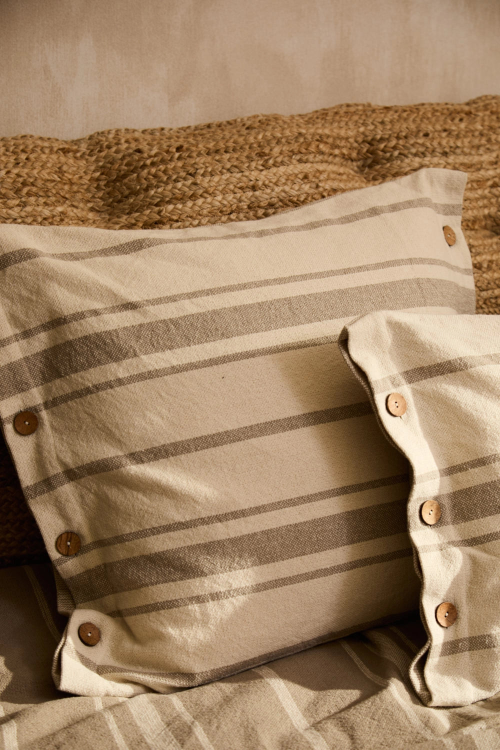 Square cushion cover with beige stripes on an ecru background. Coconut button closure. The back is identical to the front. Each cushion may have slight color variations due to the dyeing process and screen display.
