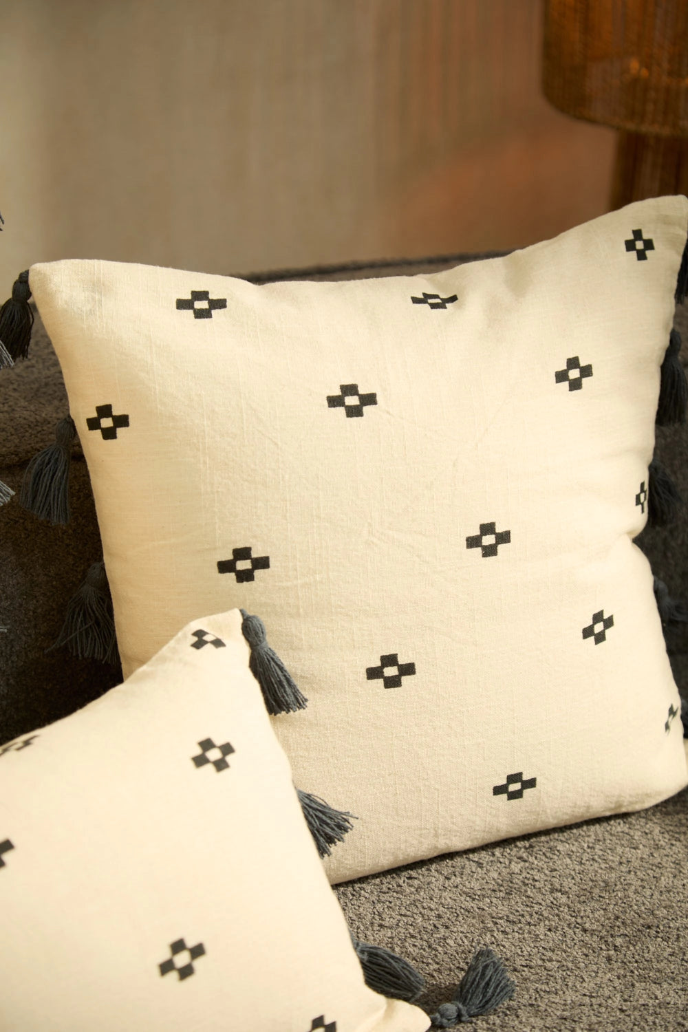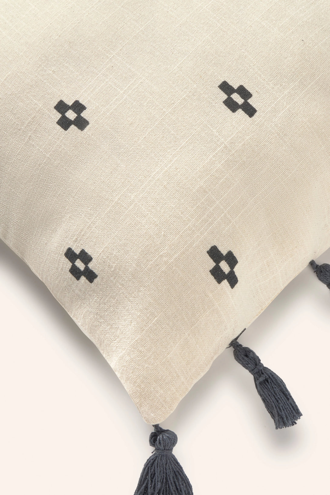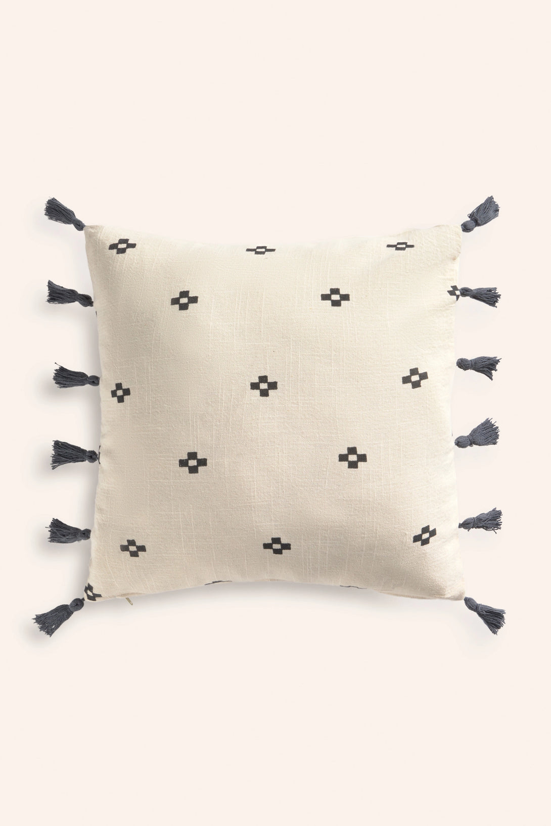 Square cotton cushion cover with geometric motifs on an ecru background. Pompom trim. The back is identical to the front. It closes with a hidden zipper at the bottom. Each cushion may have slight color variations due to the dyeing process and screen display.