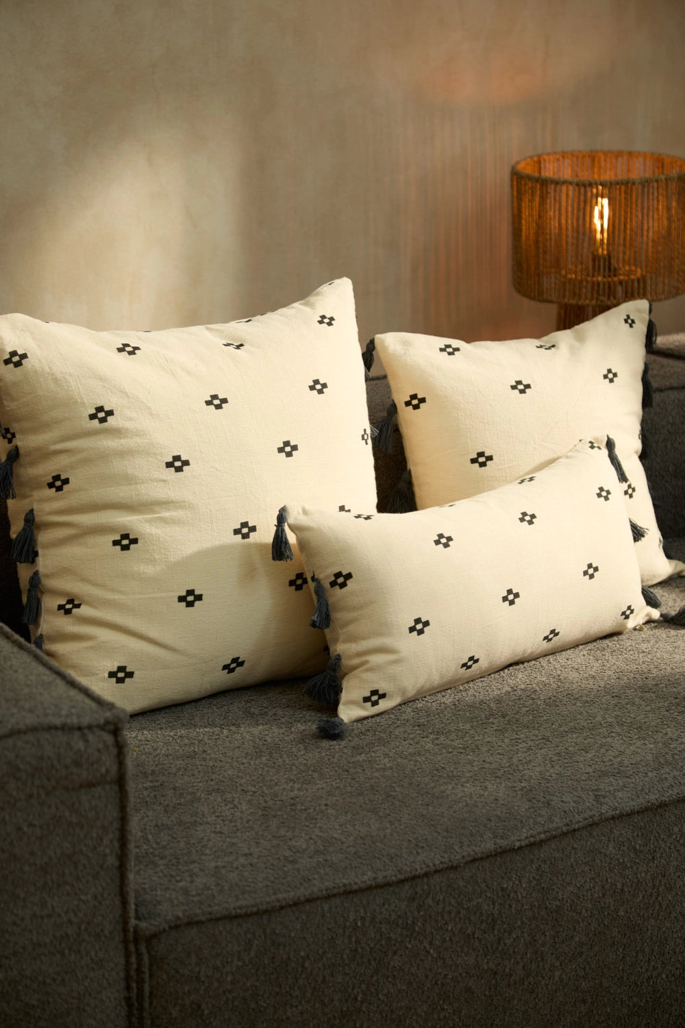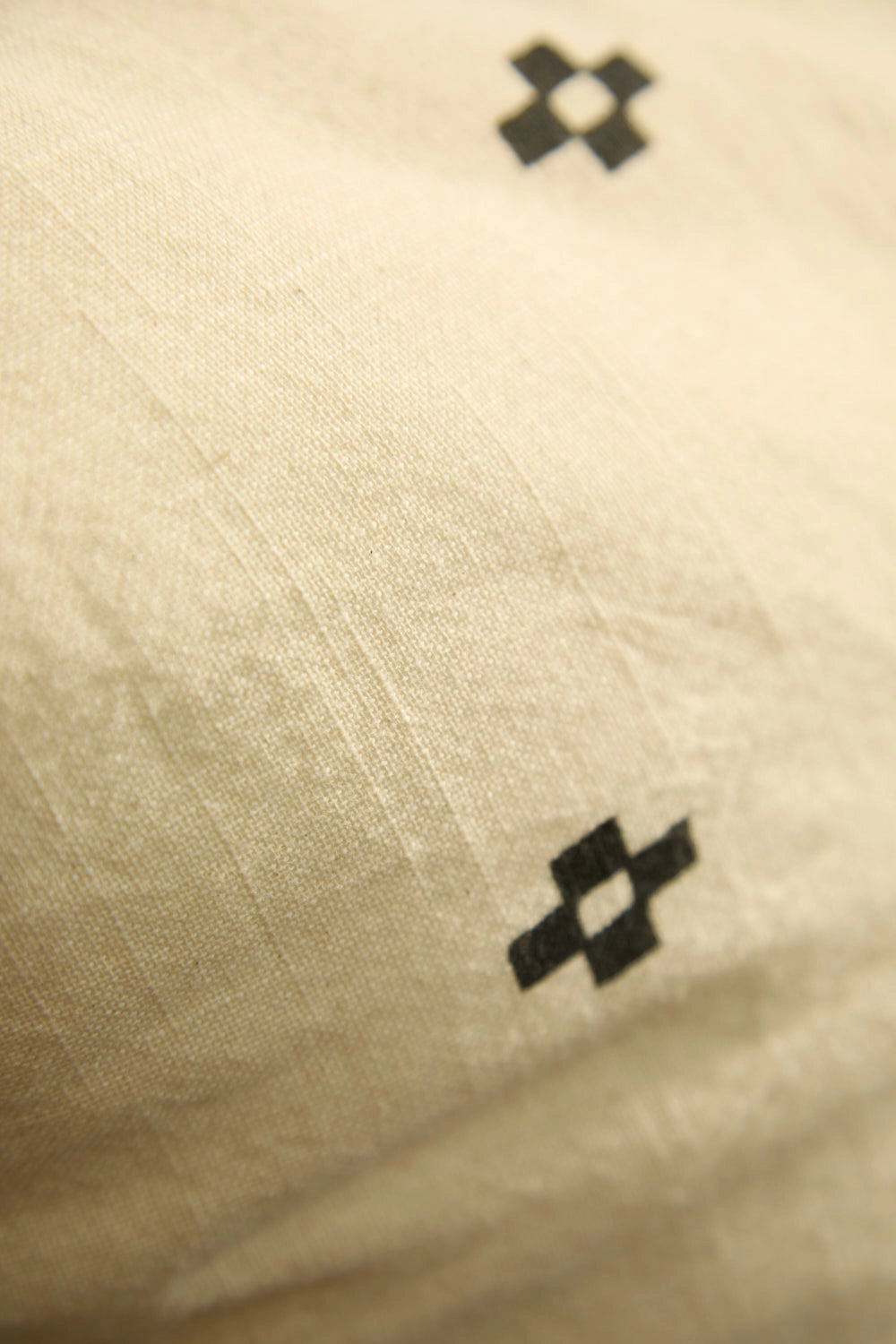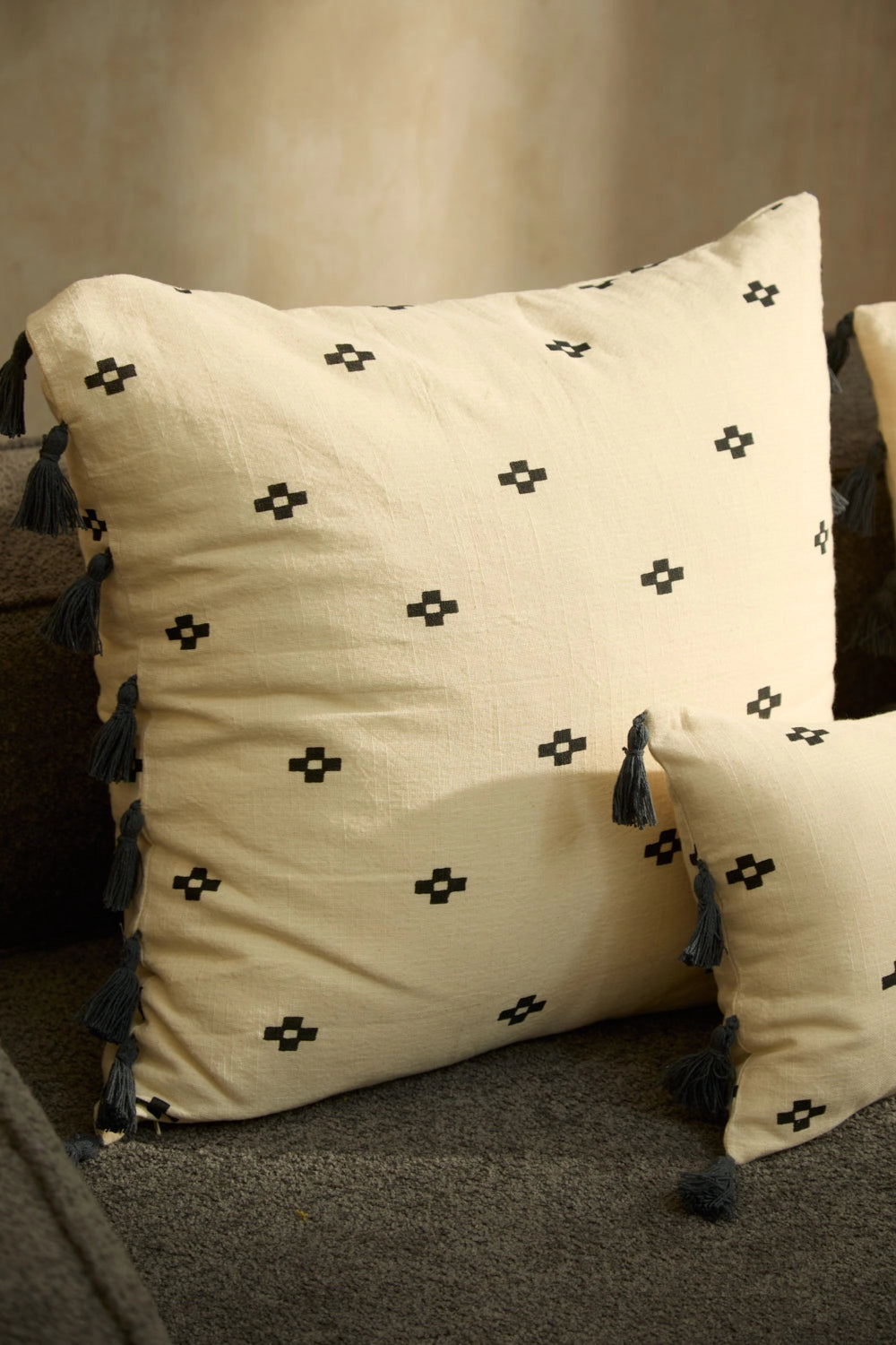 Square cotton cushion cover with geometric motifs on an ecru background. Pompom trim. The back is identical to the front. It closes with a hidden zipper at the bottom. Each cushion may have slight color variations due to the dyeing process and screen display.