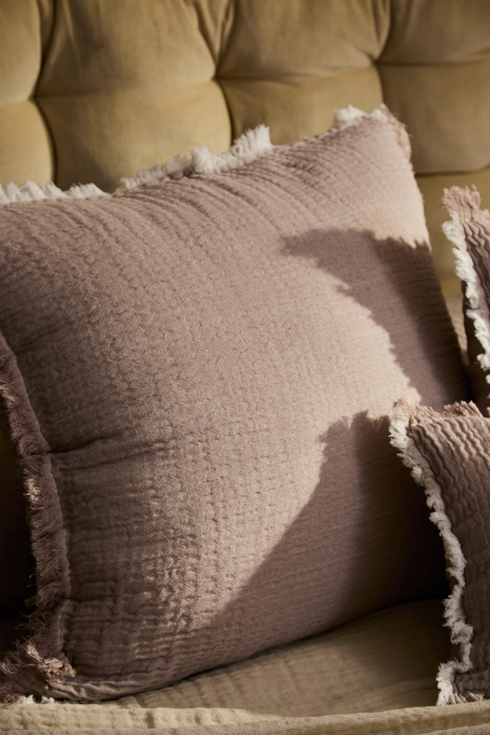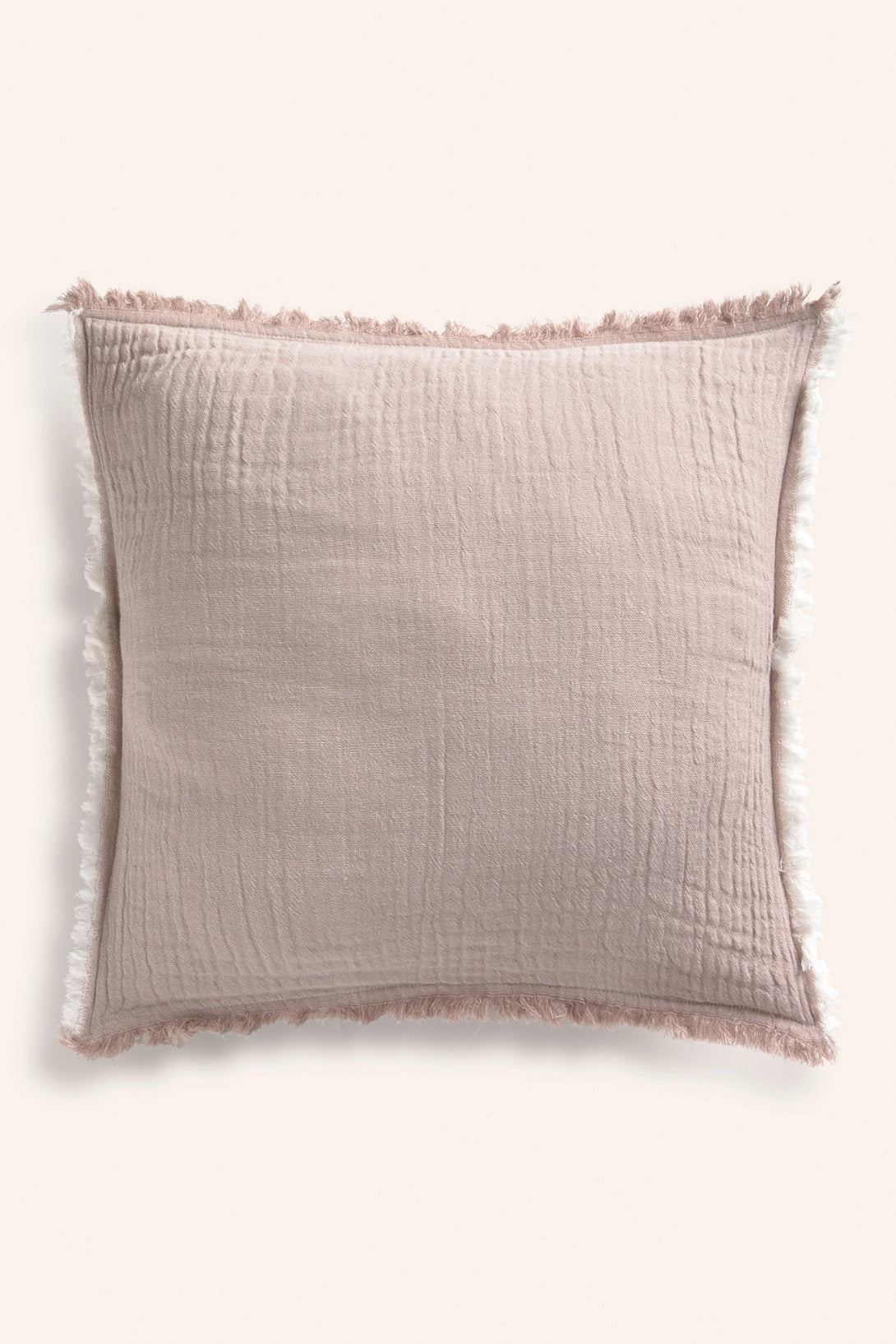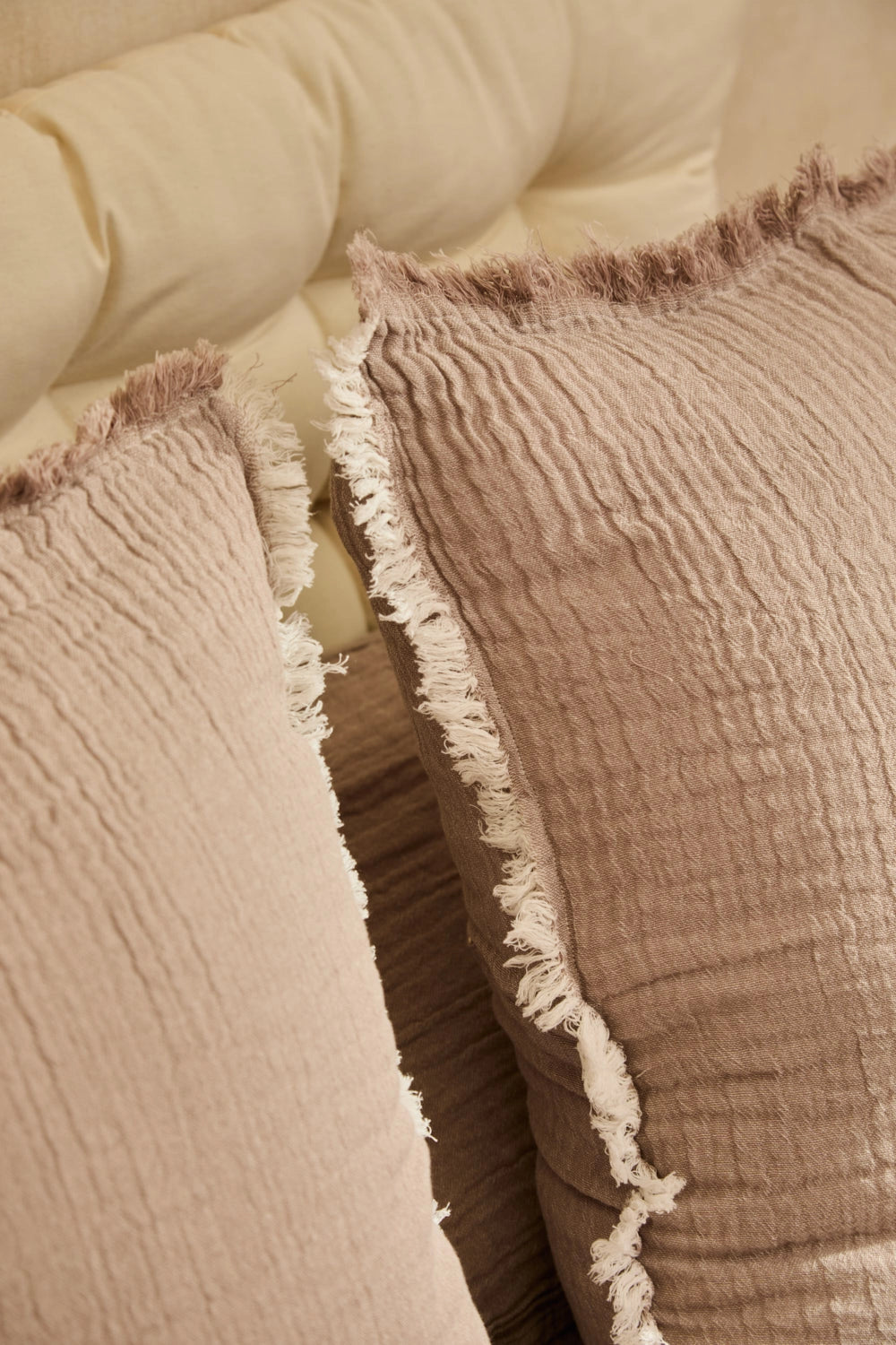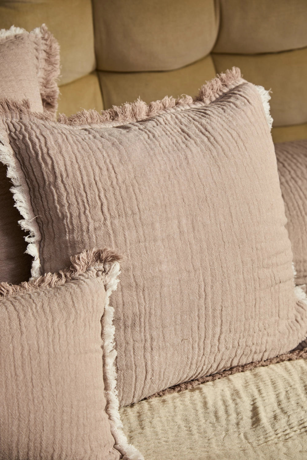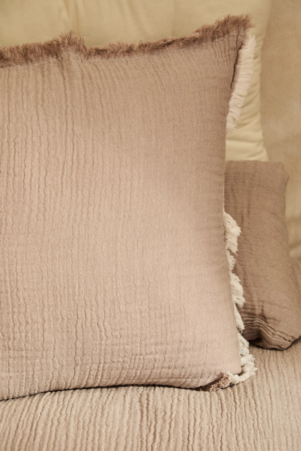 Square cotton muslin cushion cover in a stone tone. The back is identical to the front, with a concealed zipper closure and a mid-height flap. Fringed trim. Each cushion may have slight color variations due to the dyeing process and screen display.