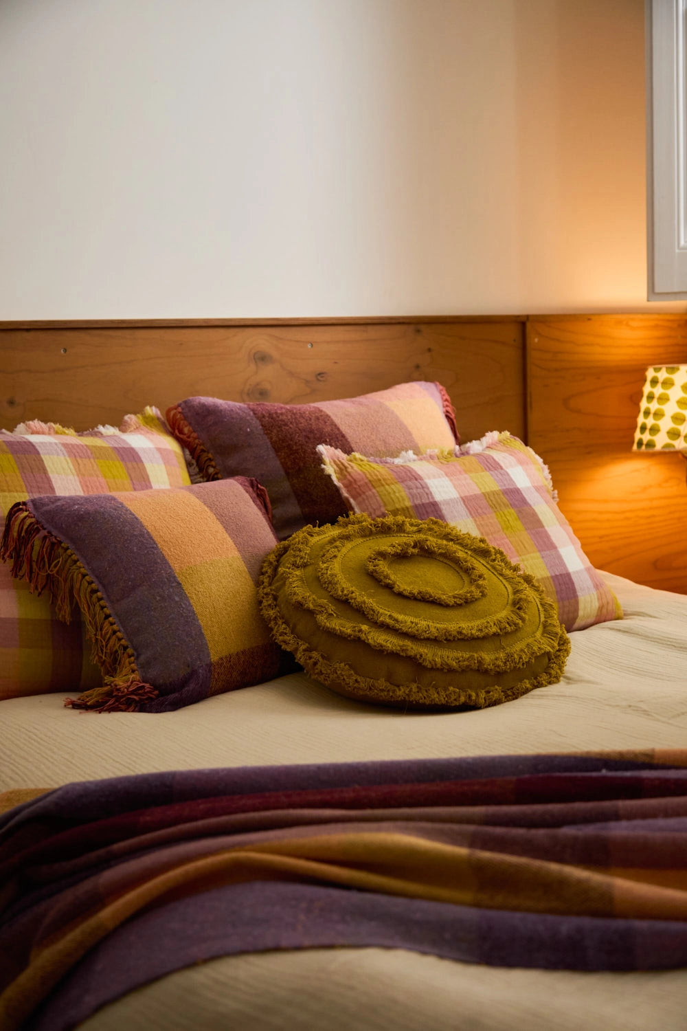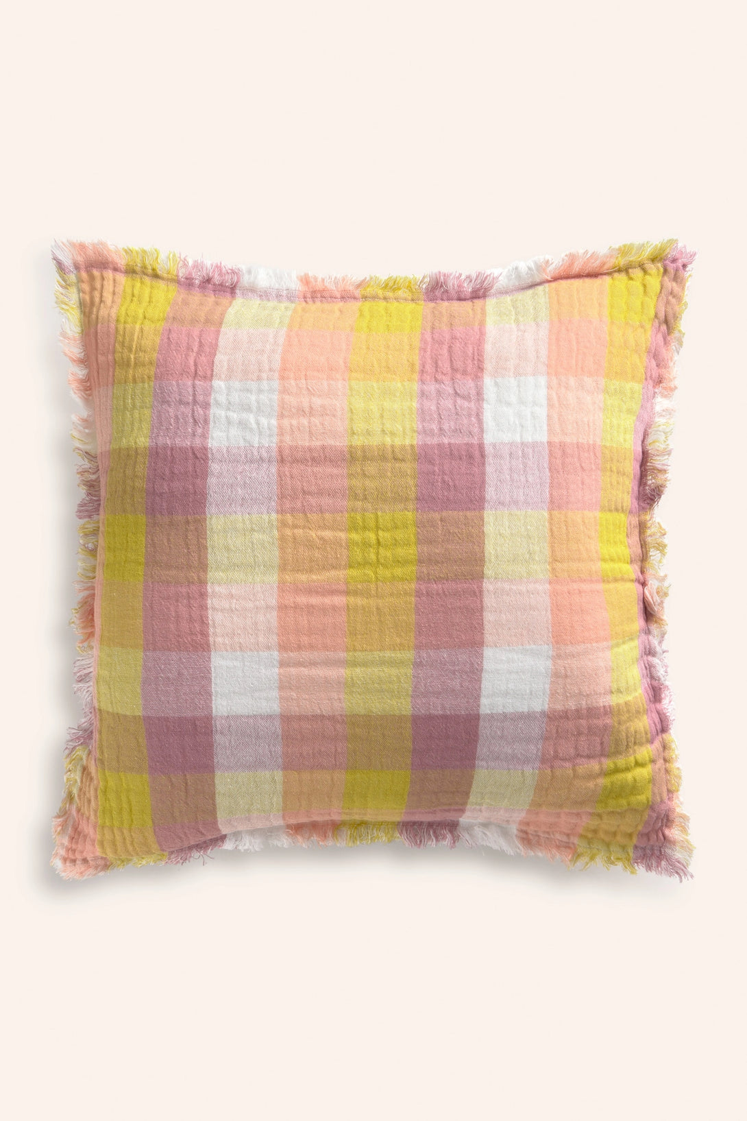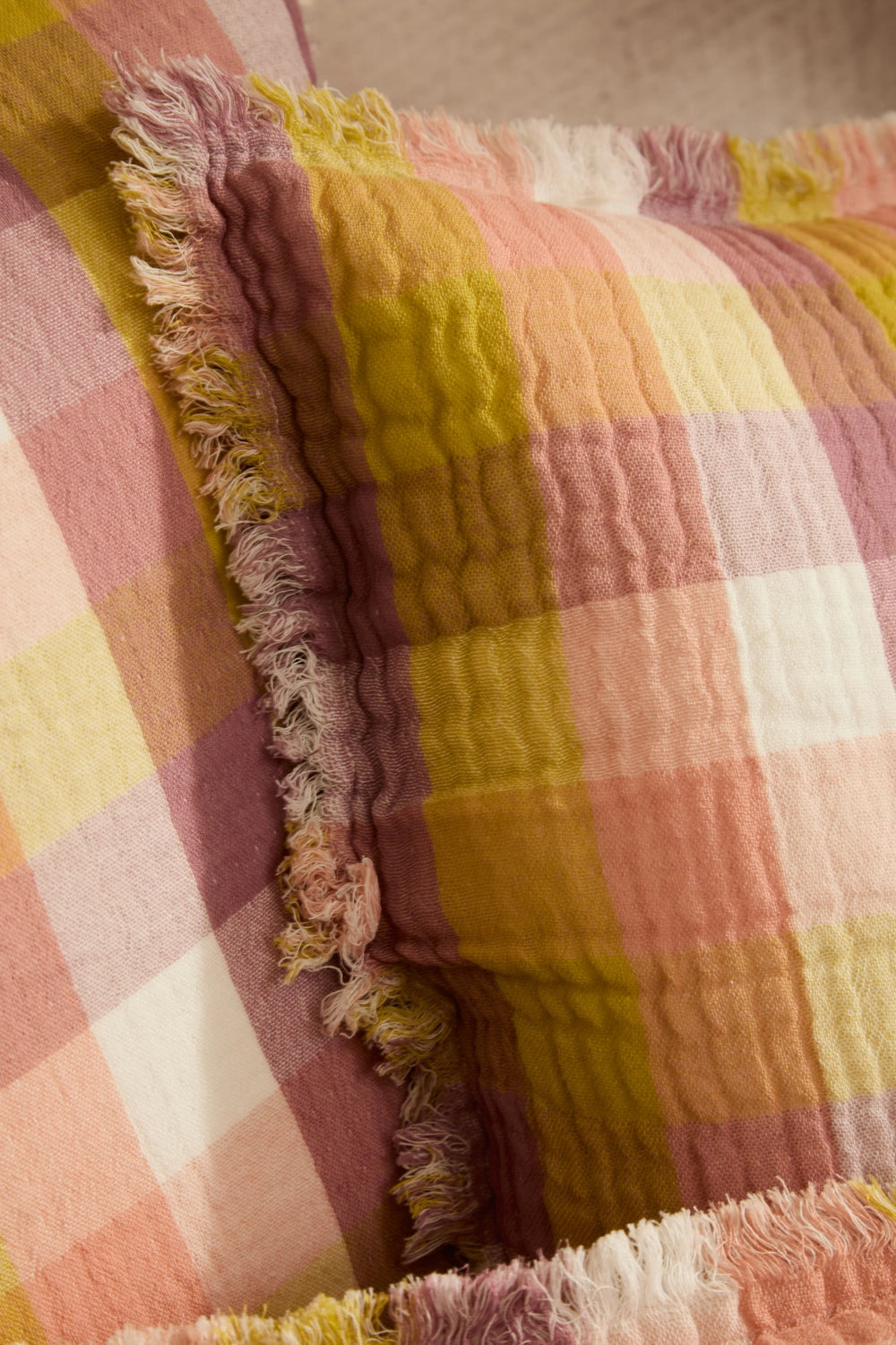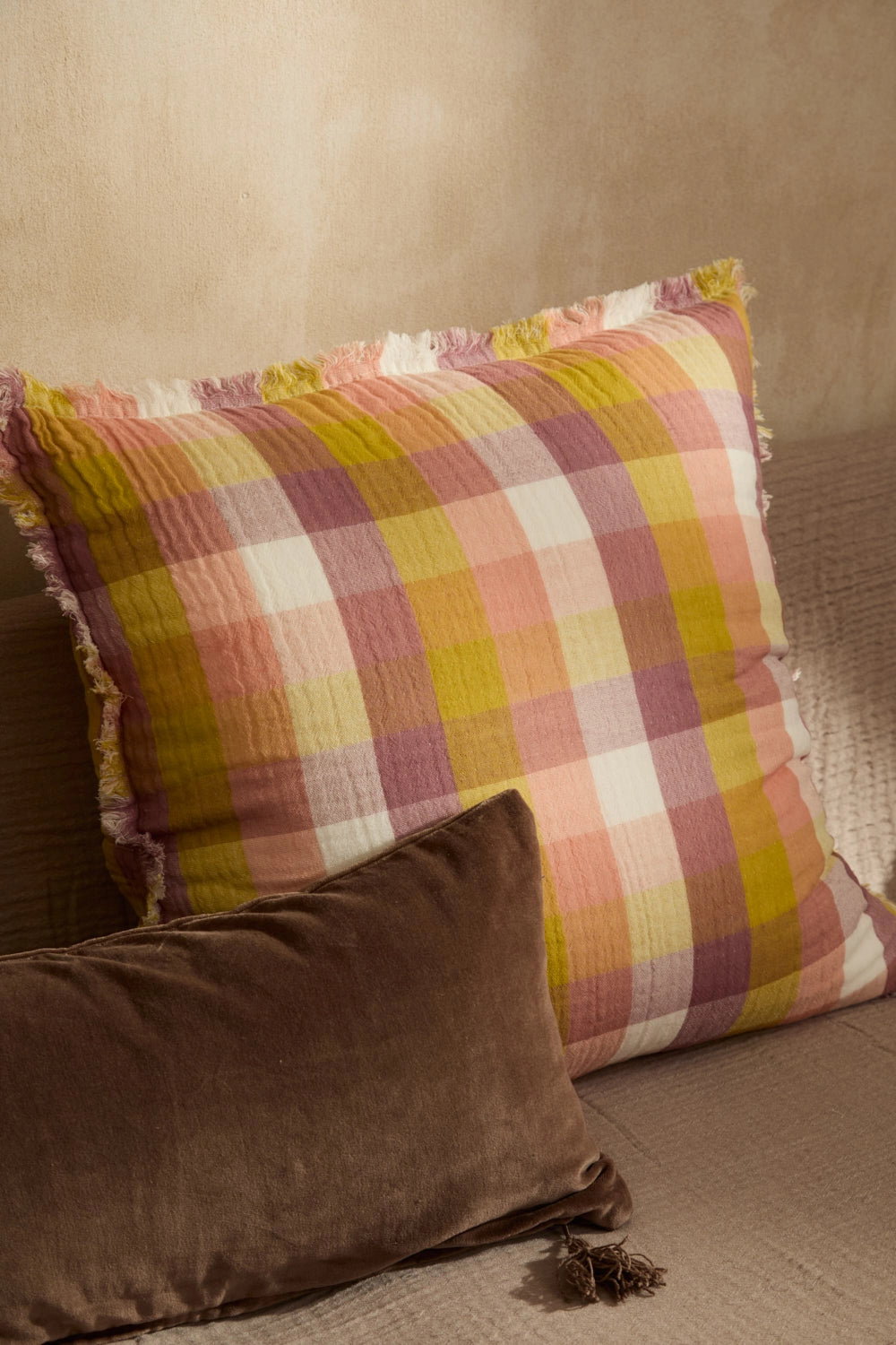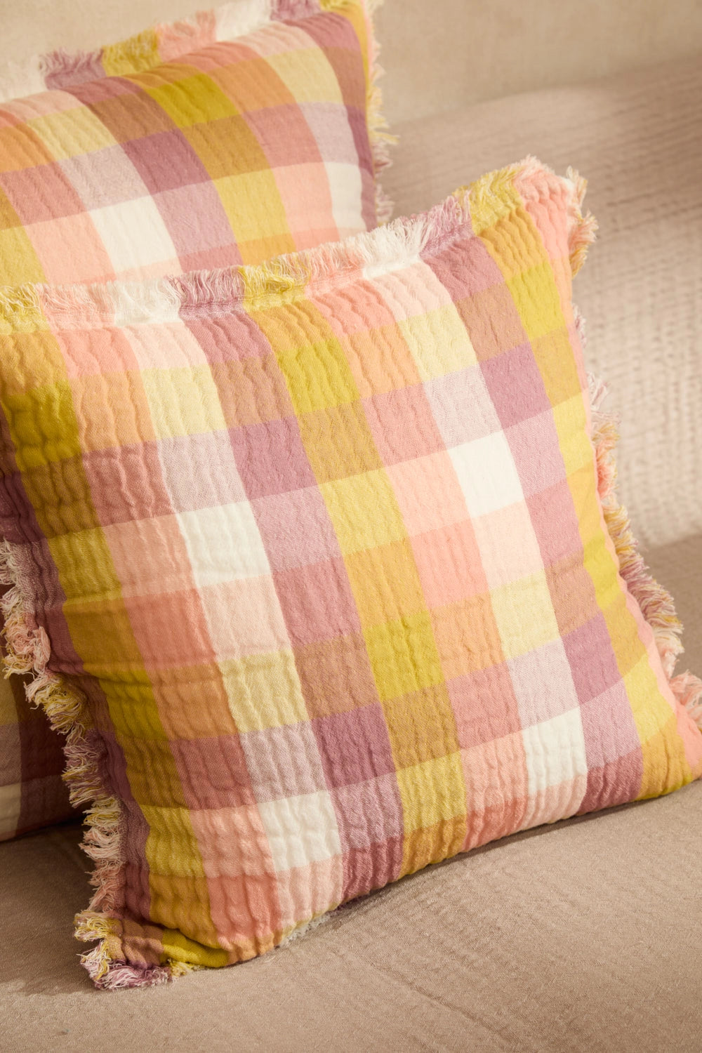 Square cotton muslin cushion cover with a gingham design in shades of purple and green. Fringed trim. The back is identical to the front, with a concealed half-length zipper and flap. Each cushion may have slight color variations due to the dyeing process and screen display.