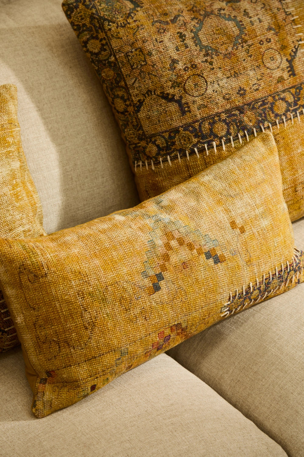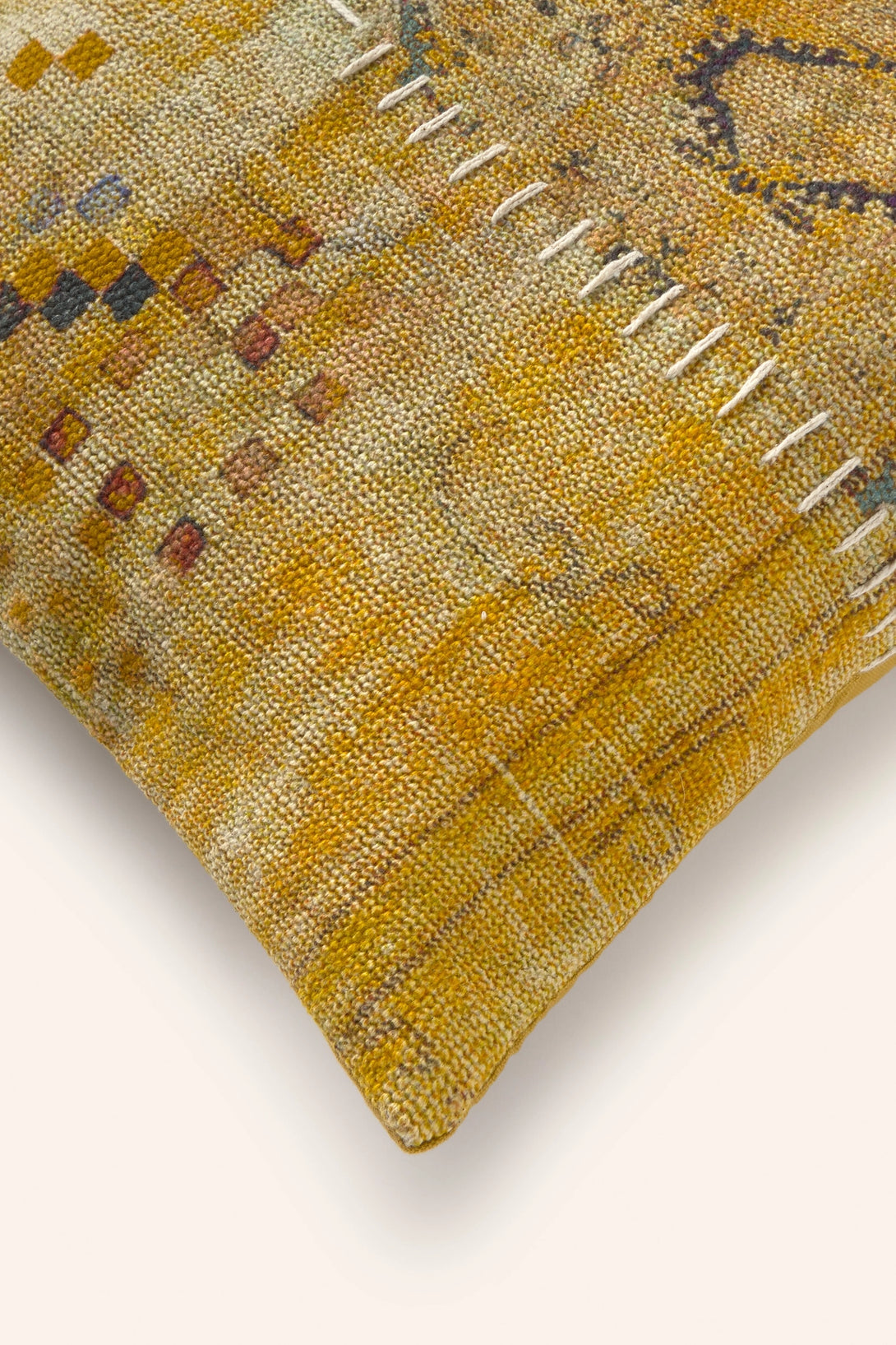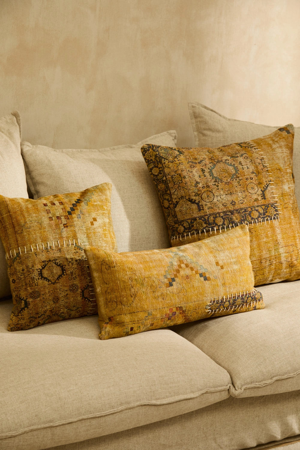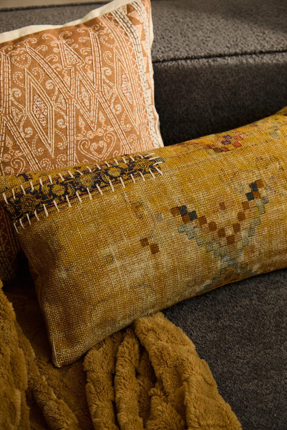 Rectangular cotton dhurrie cushion cover with a mustard print and embroidery on the front. Plain mustard canvas back. Bottom zipper closure. Each cushion may have slight color variations due to the dyeing process and screen display.