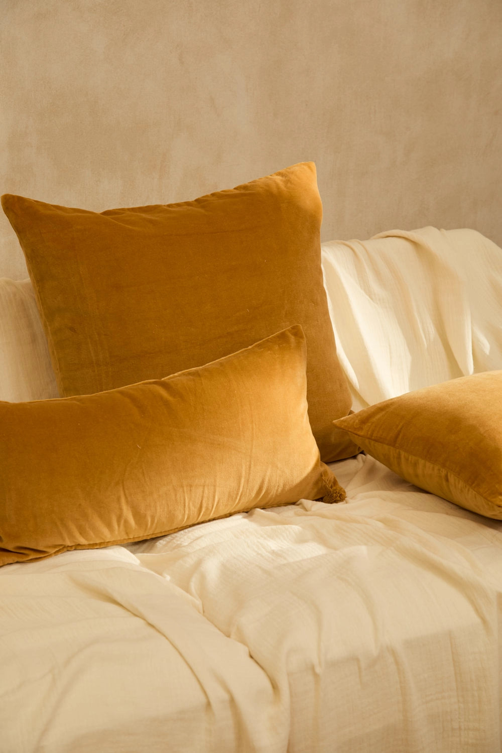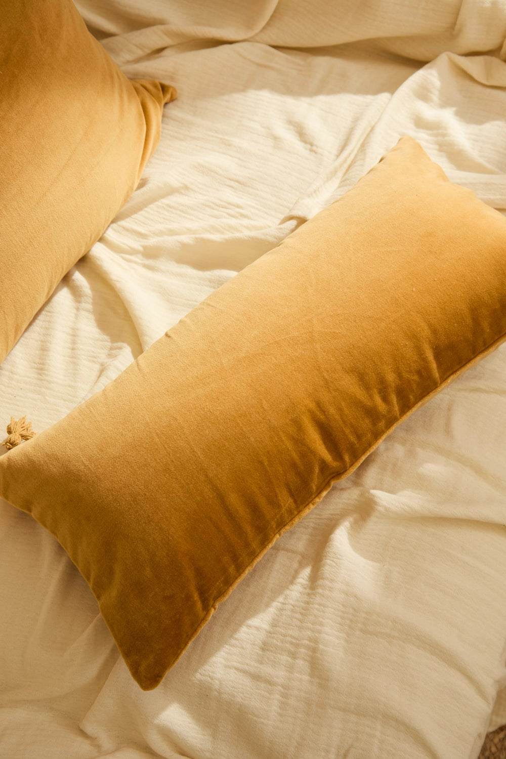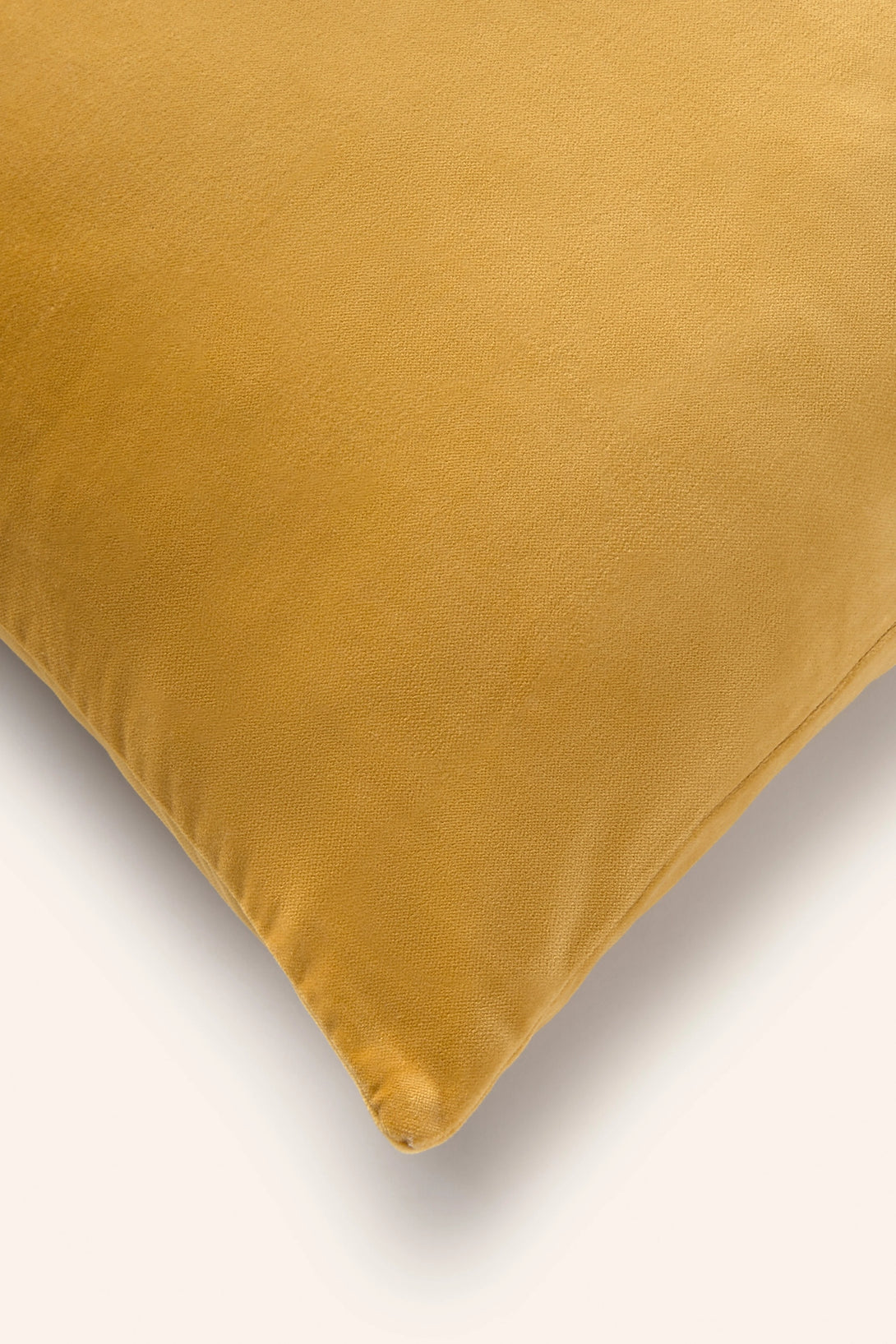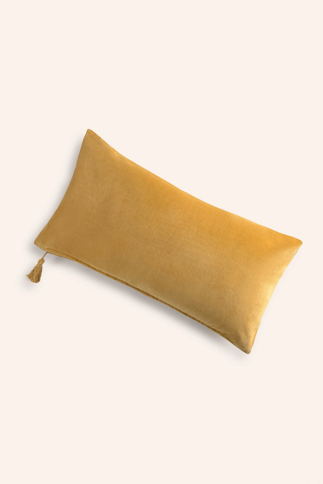 Rectangular mustard cotton velvet cushion cover. Same back as front. Concealed bottom zipper closure with a pompom. Each cushion may have slight color variations due to the dyeing process and screen display.