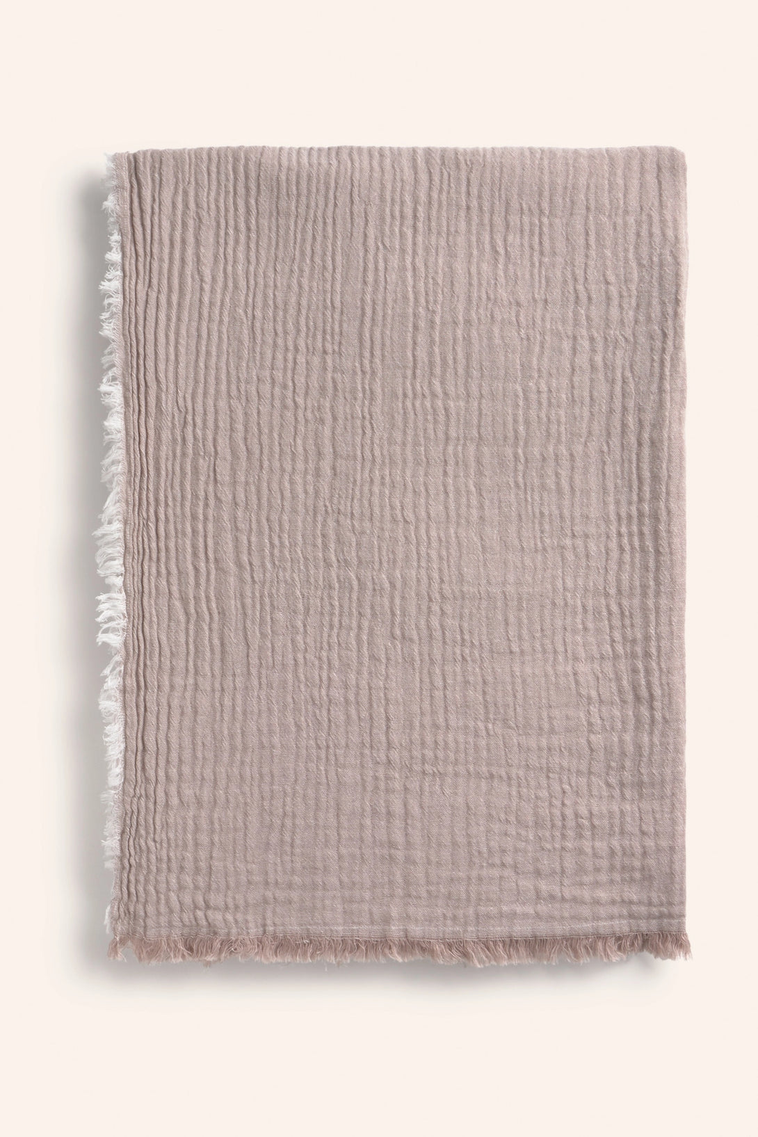 Stone-toned cotton muslin tablecloth with fringed trim.