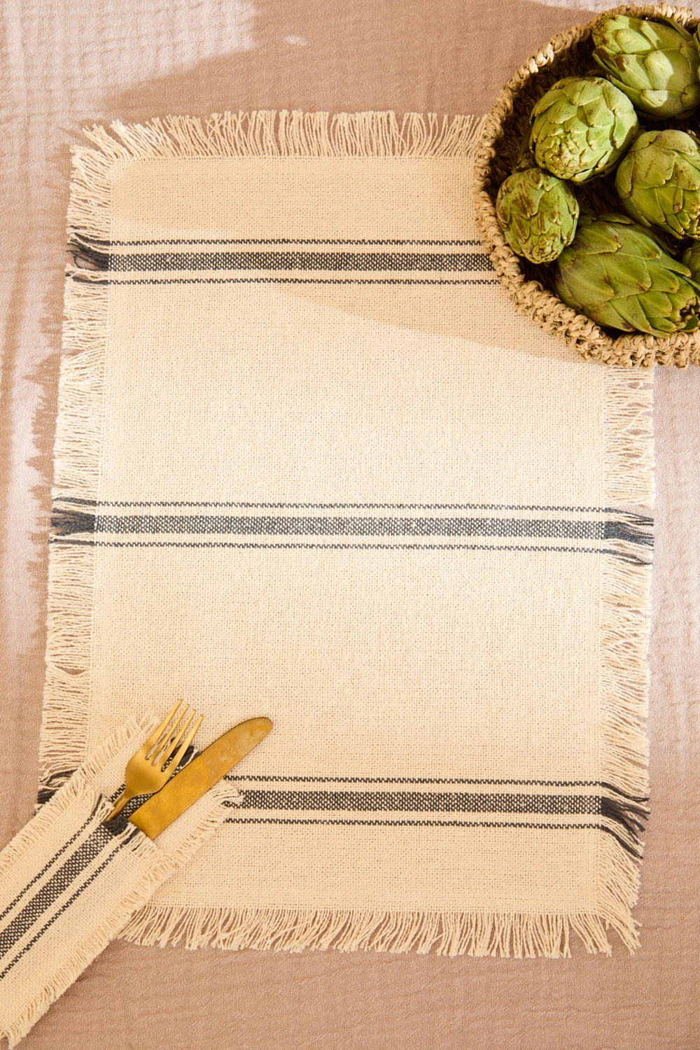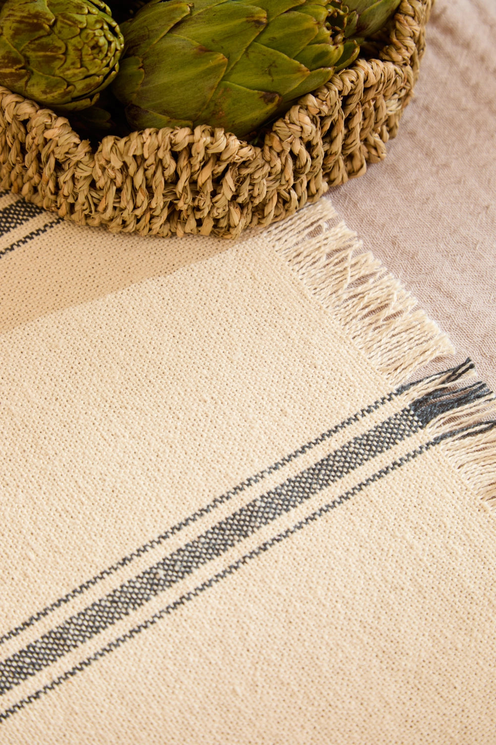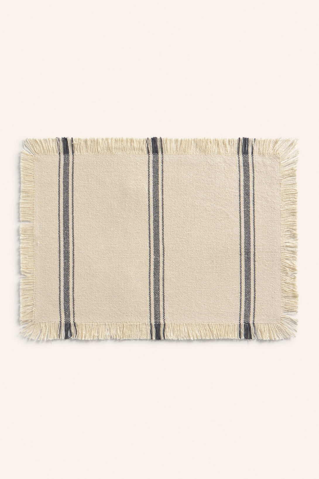 Heavyweight cotton placemat with a woven dark gray stripe. Fringed finish.