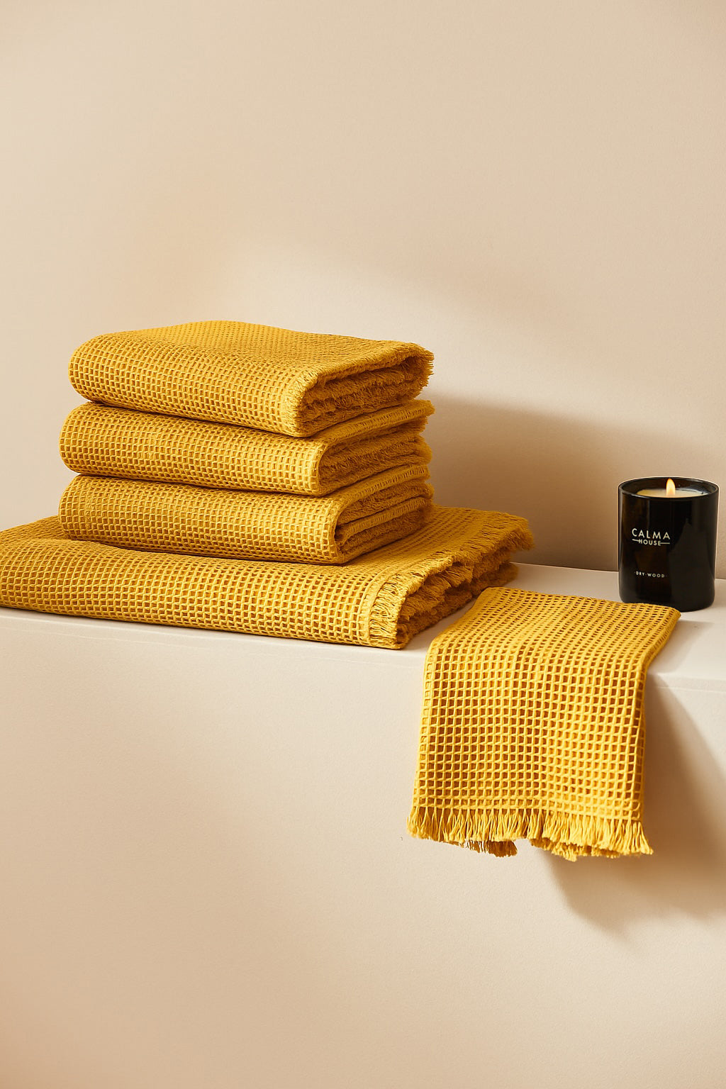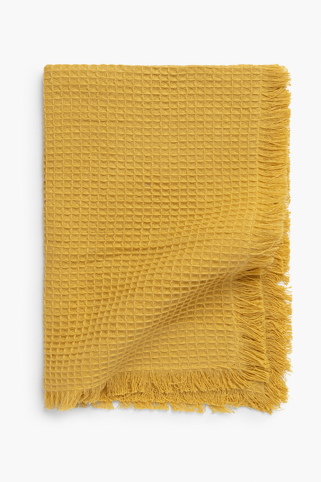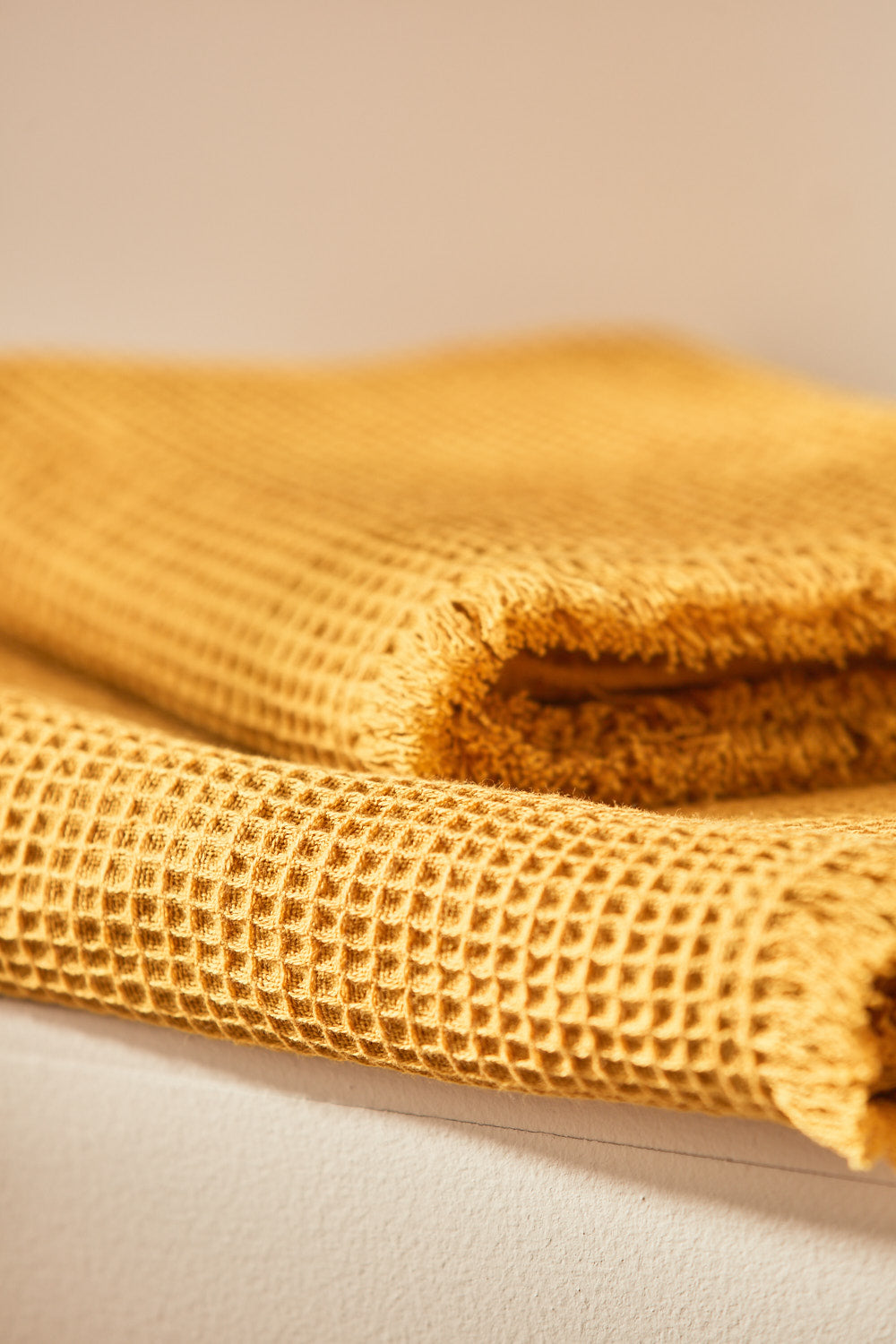 Pack of 4 same-size 50x100 cm mustard-colored washcloths in a honeycomb weave. Fringed finish.