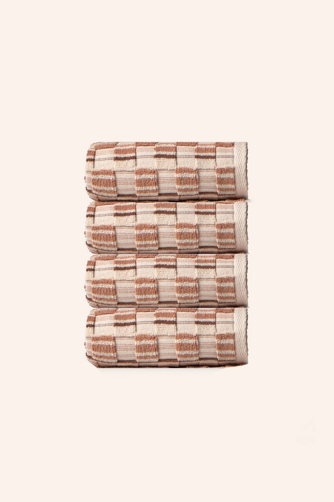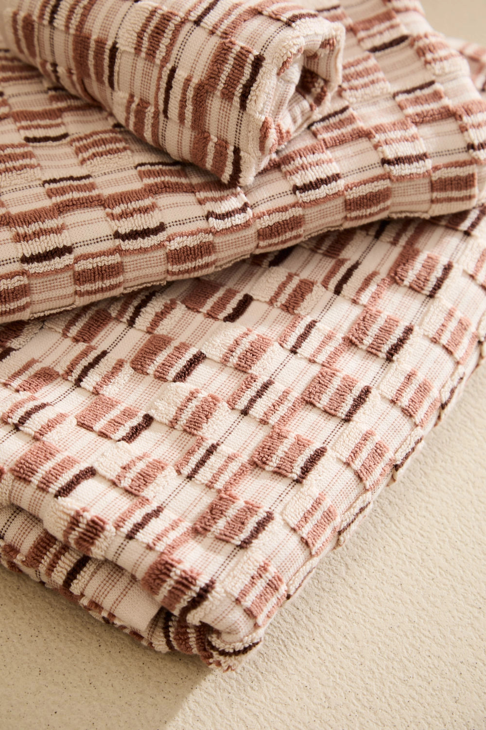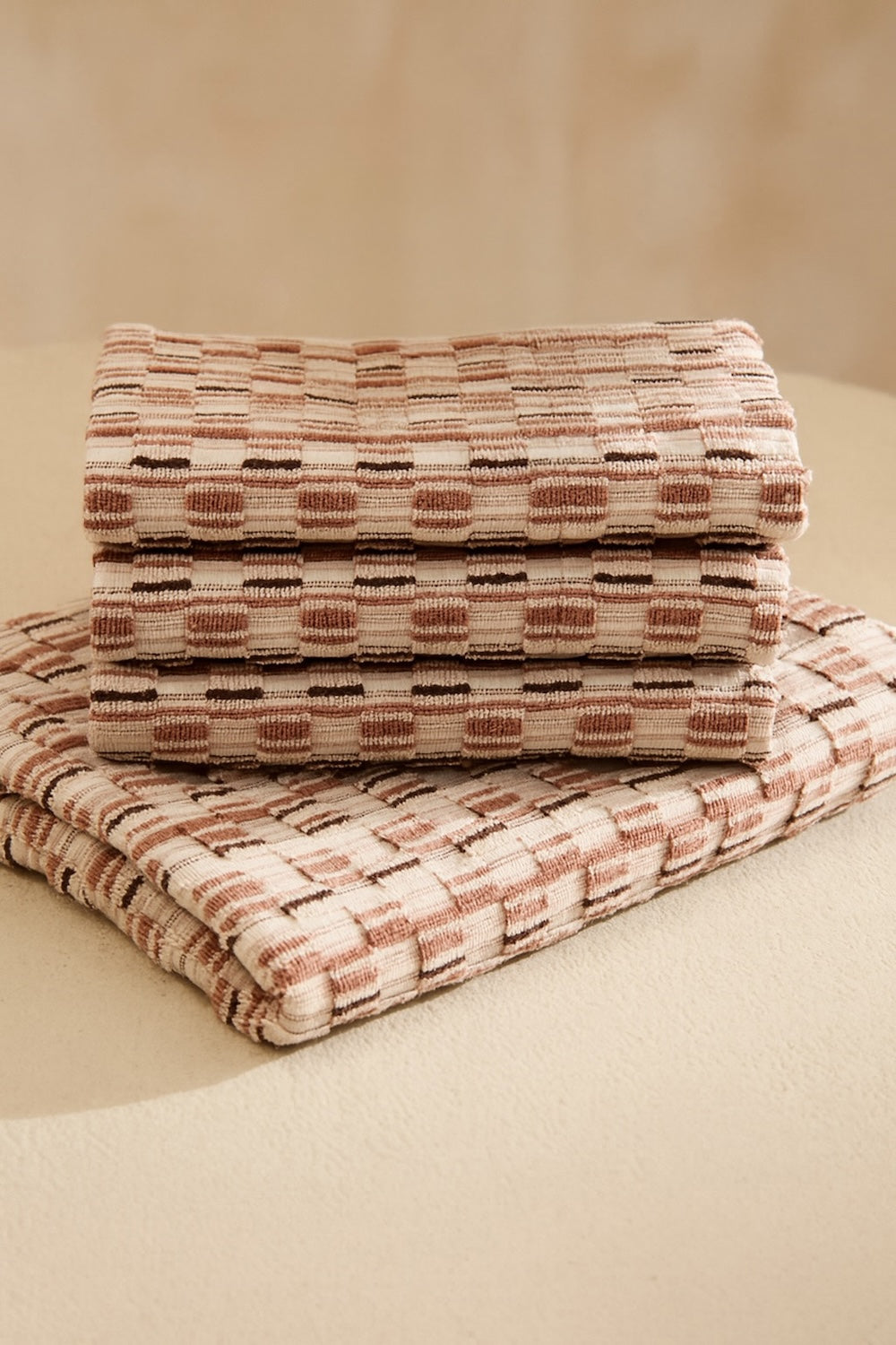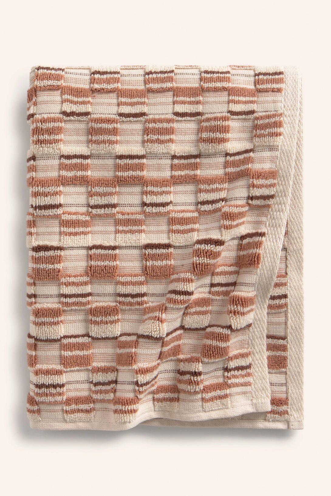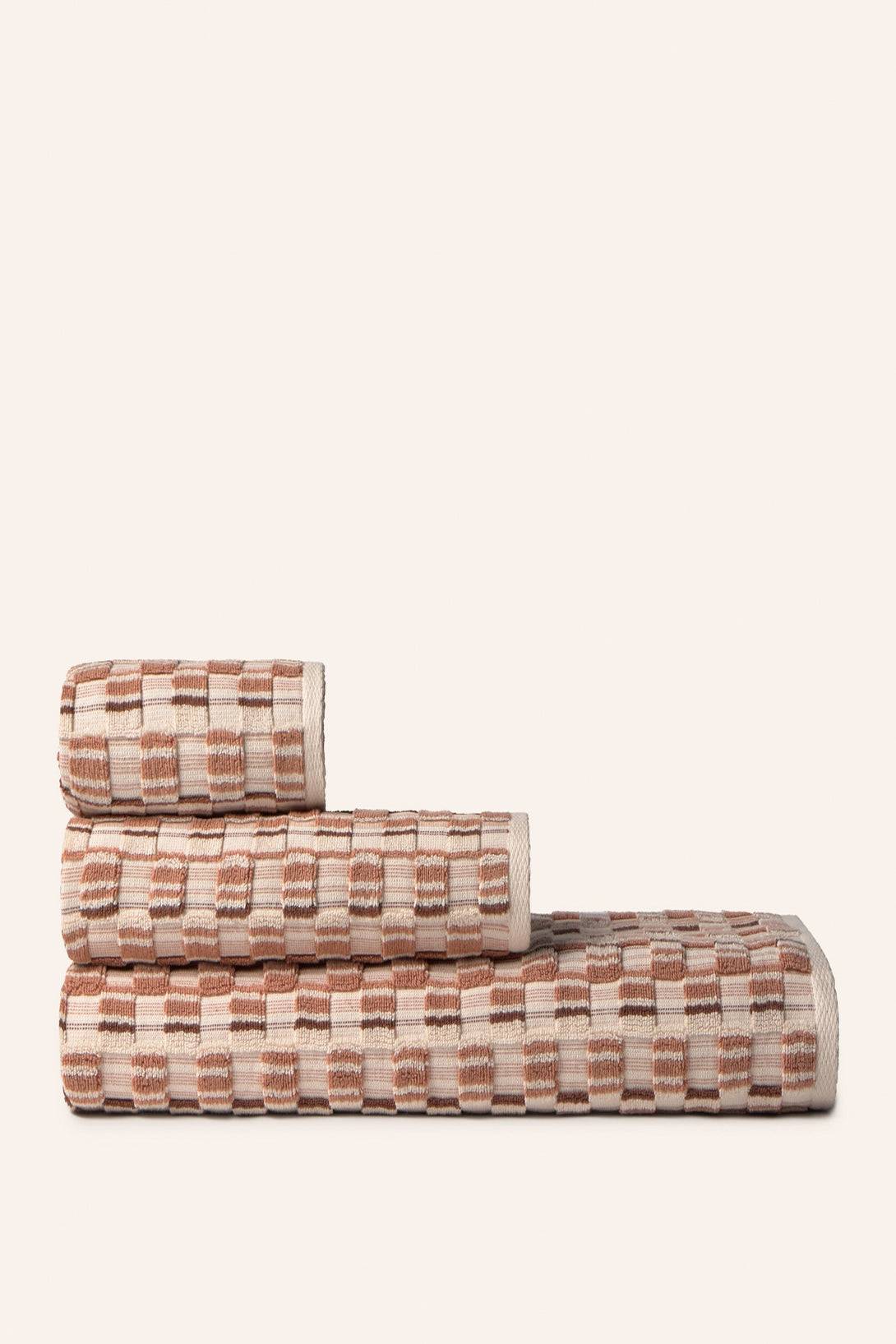 560-gram jacquard-woven terry cotton bath towel in earthy and ecru tones.