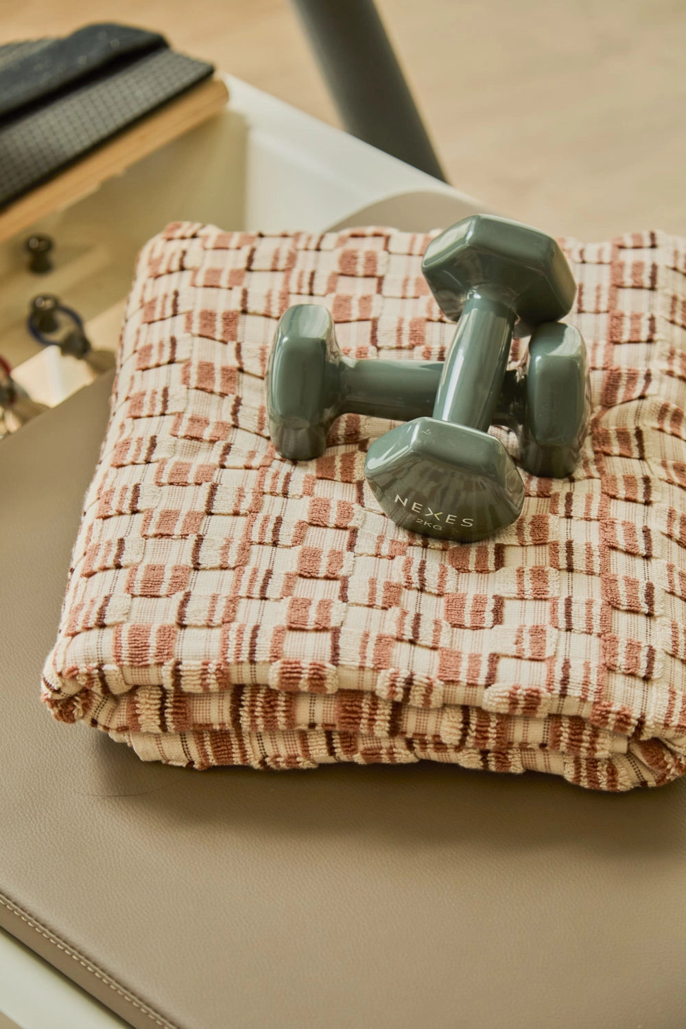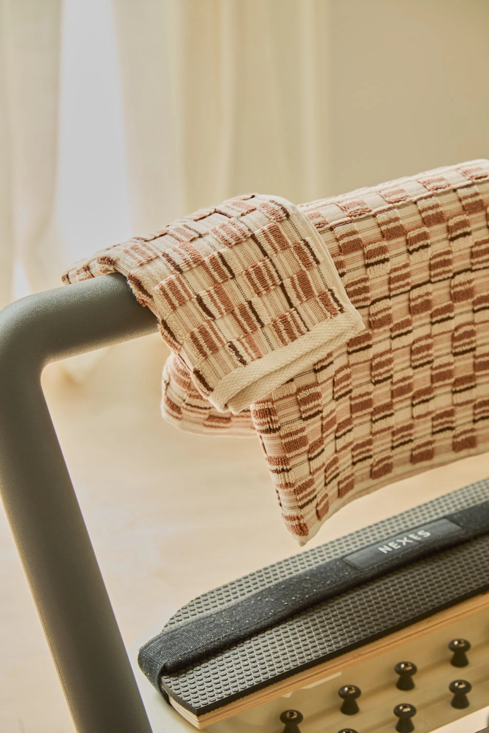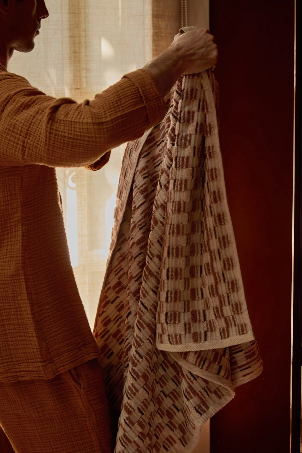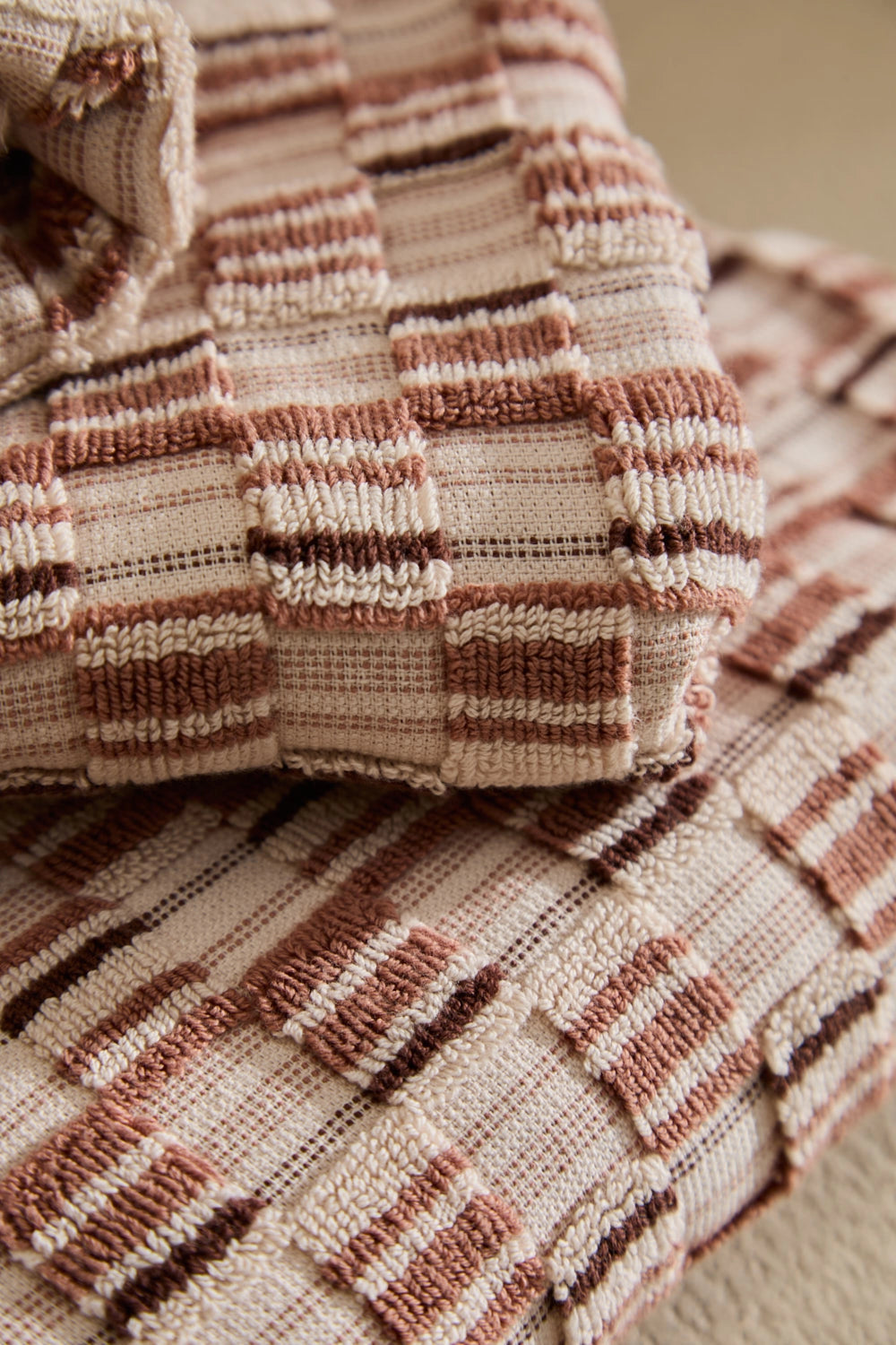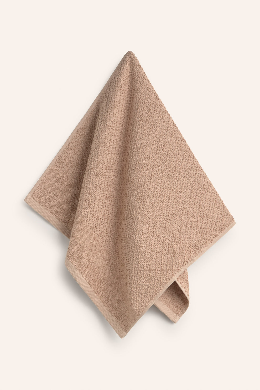 560-gram jacquard-woven terry cotton bath towel in earthy and ecru tones.