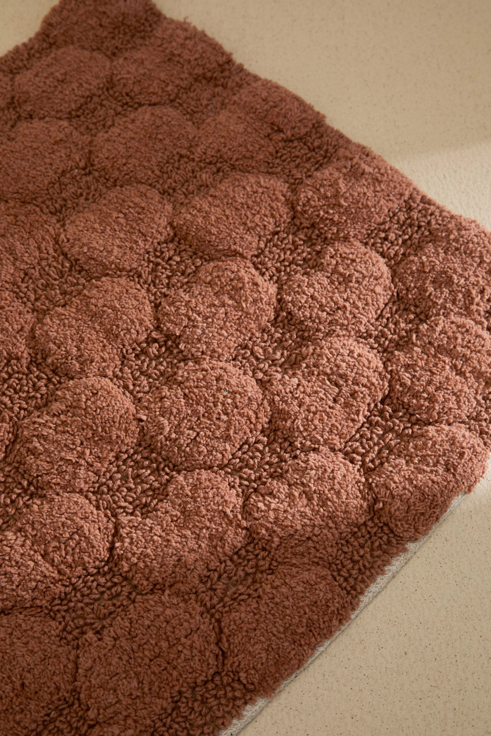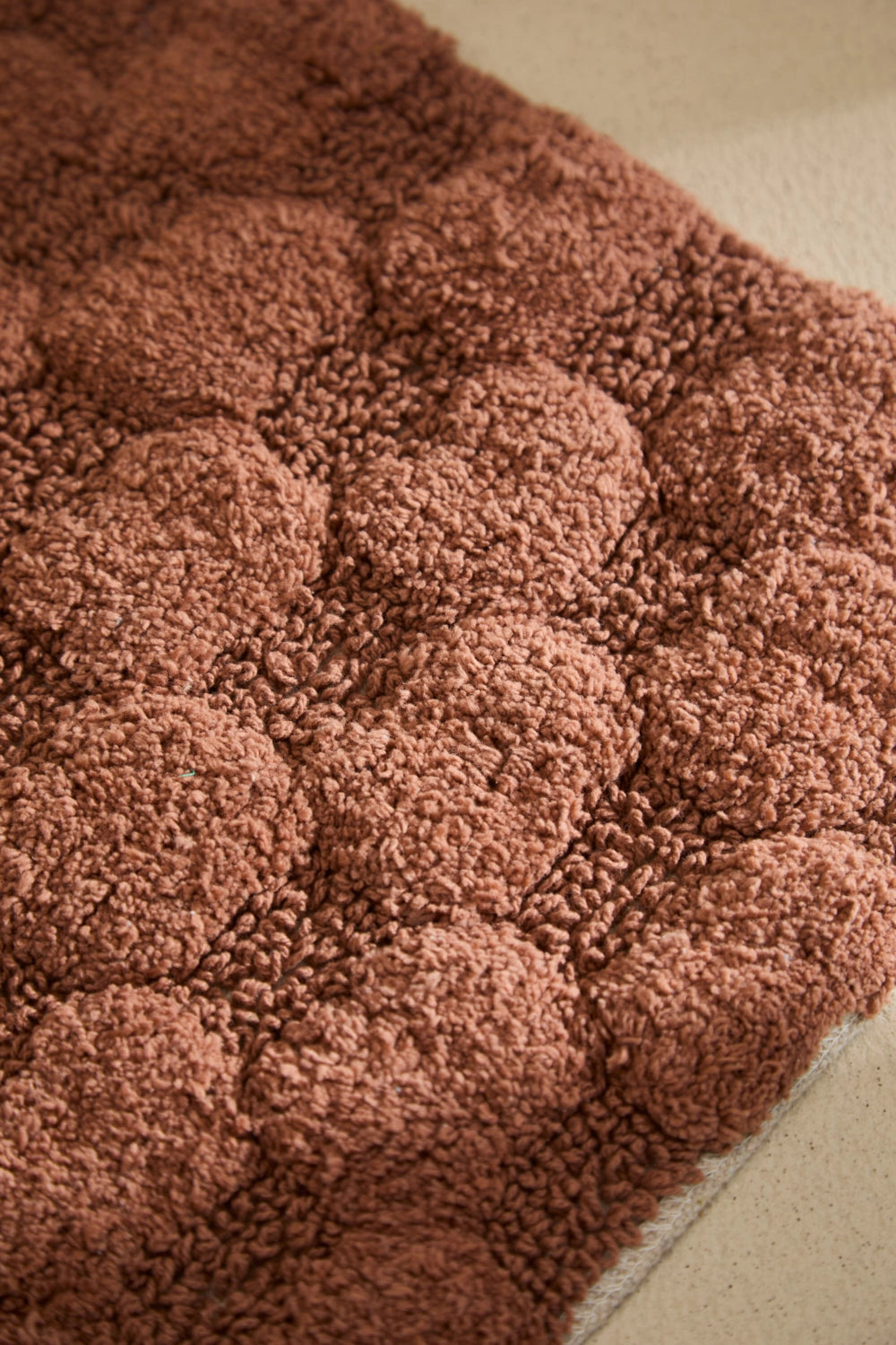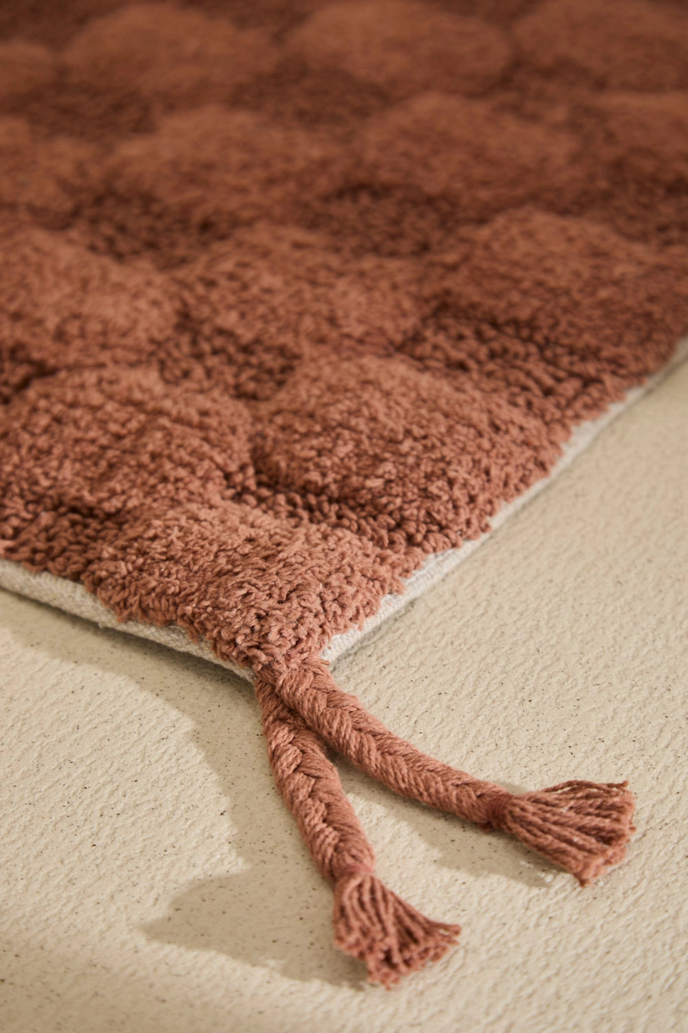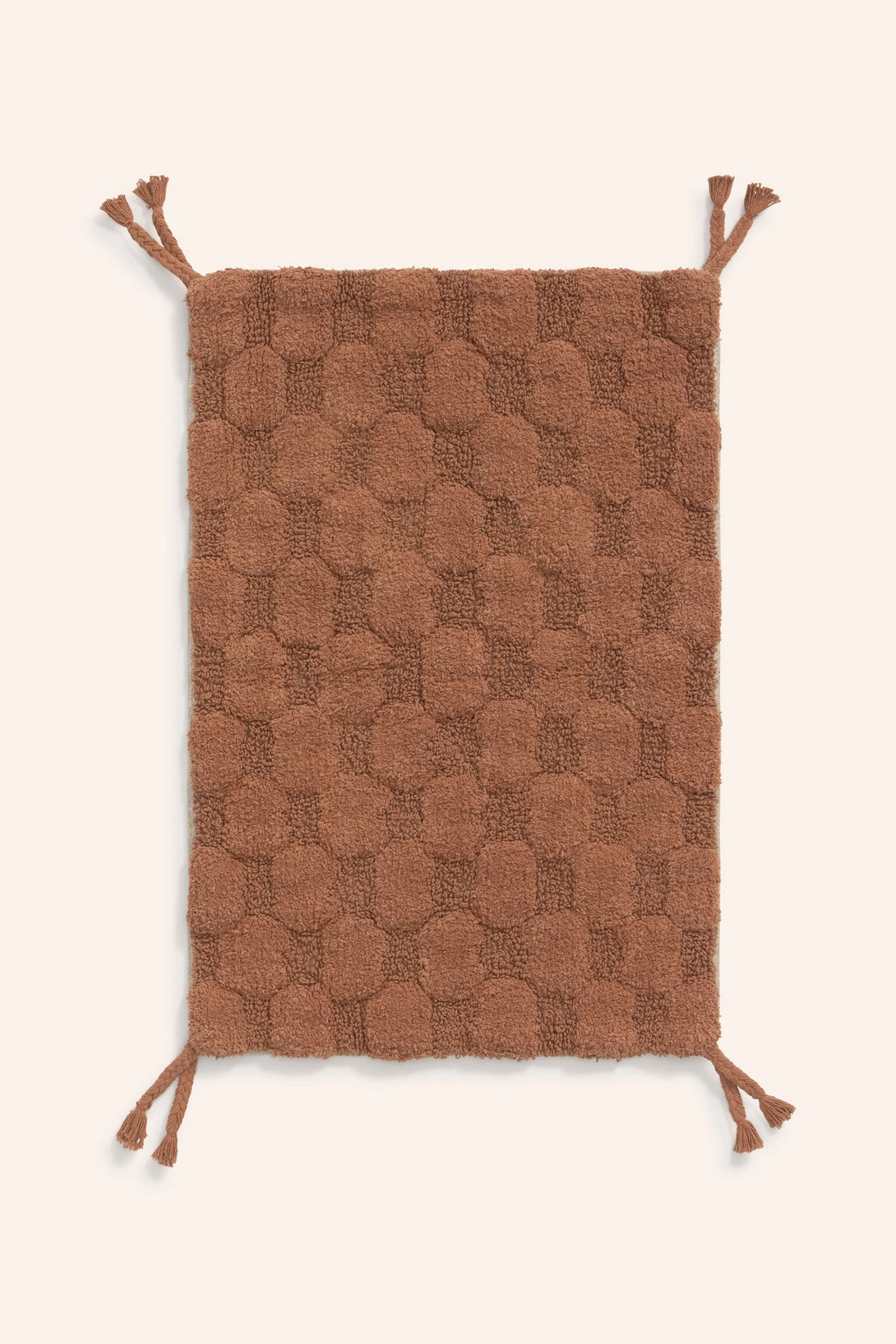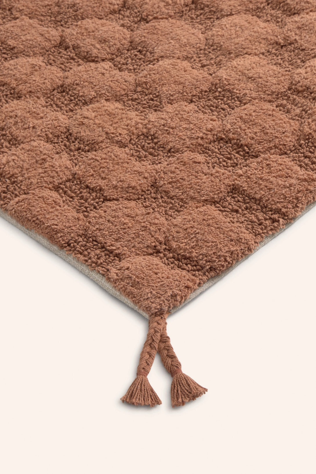 Alfombra de baño de algodón tufting con diseño a cuadros dameros en tono tierra. Acabado en flecos.