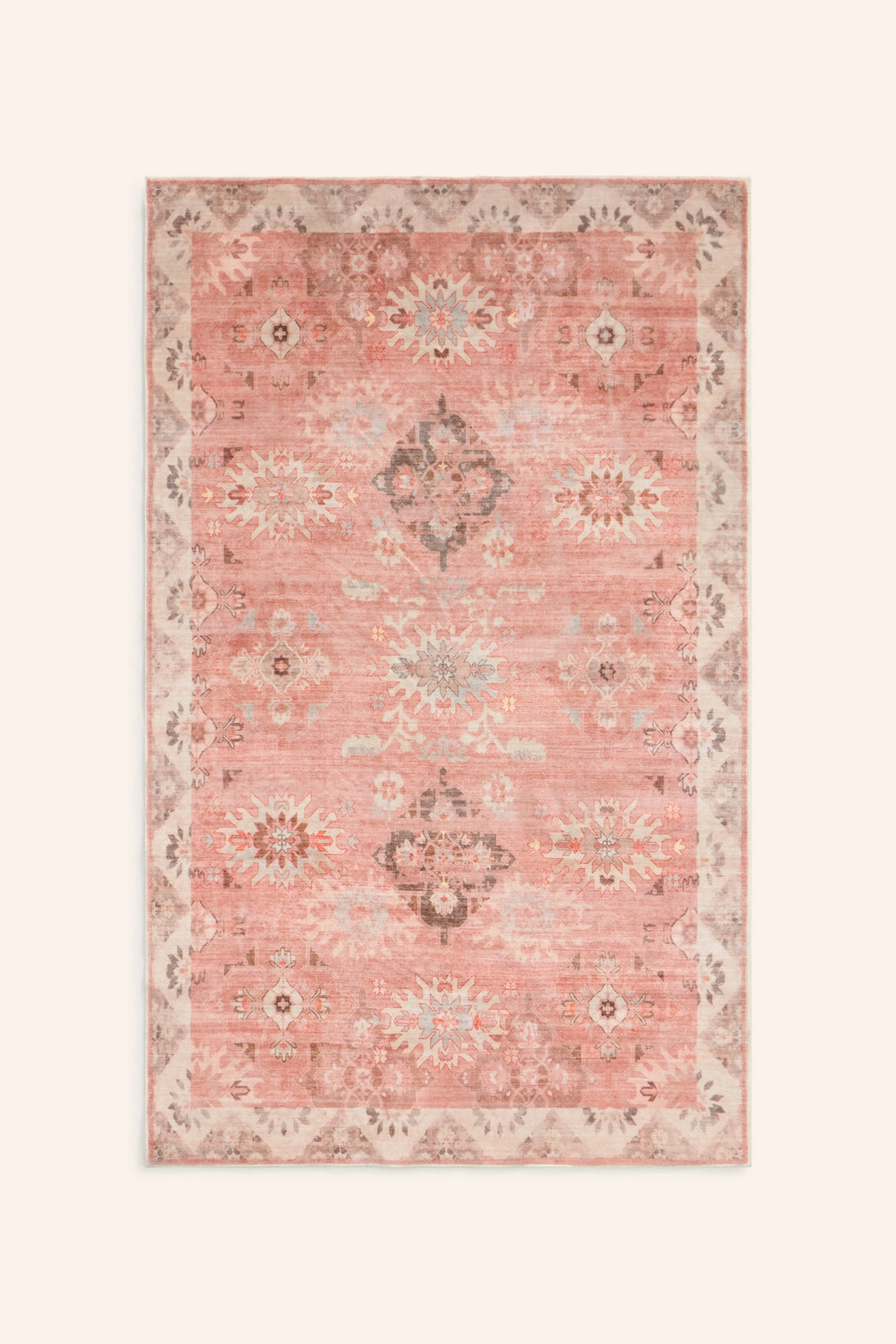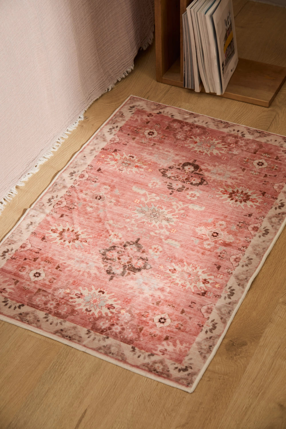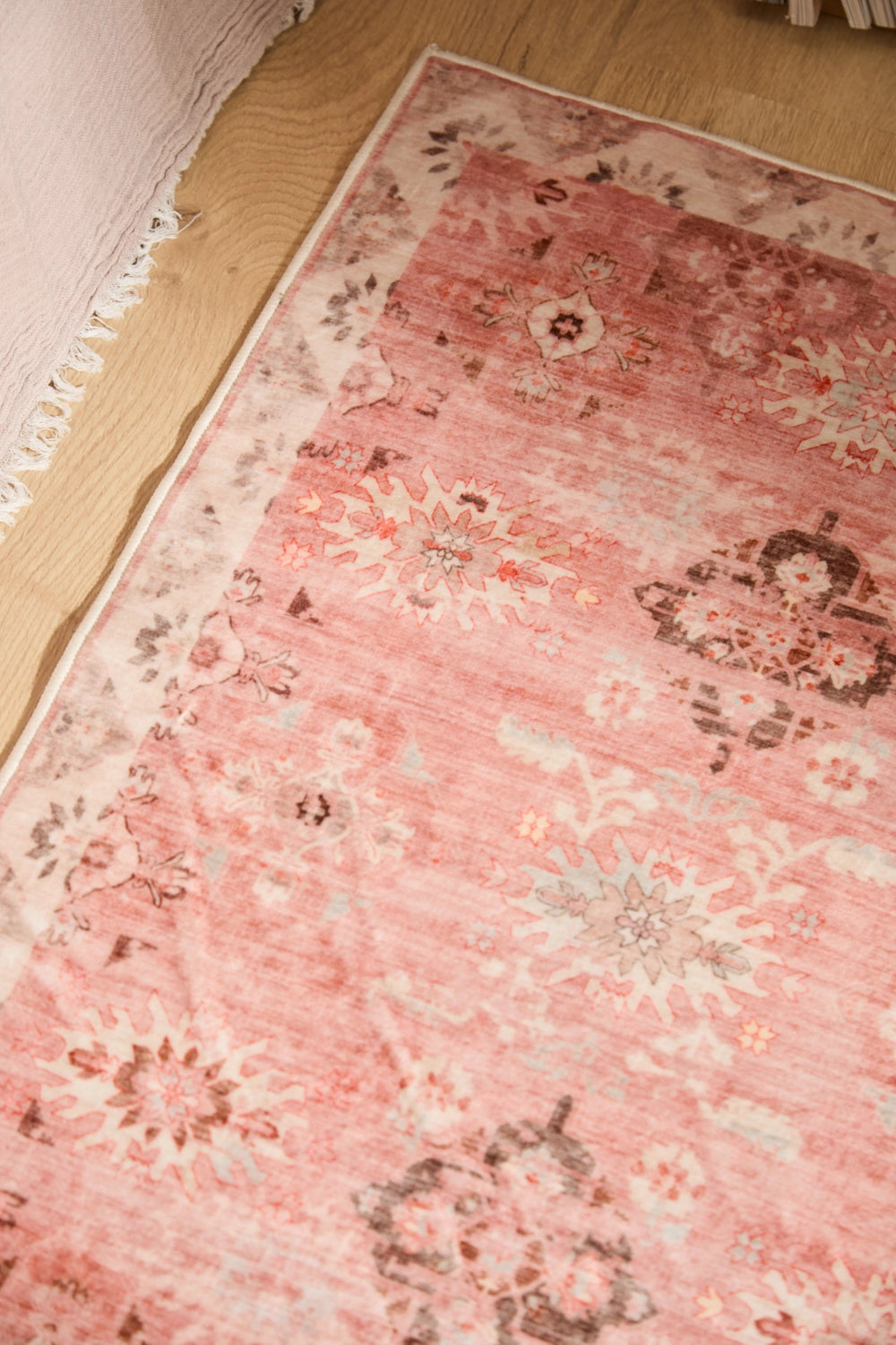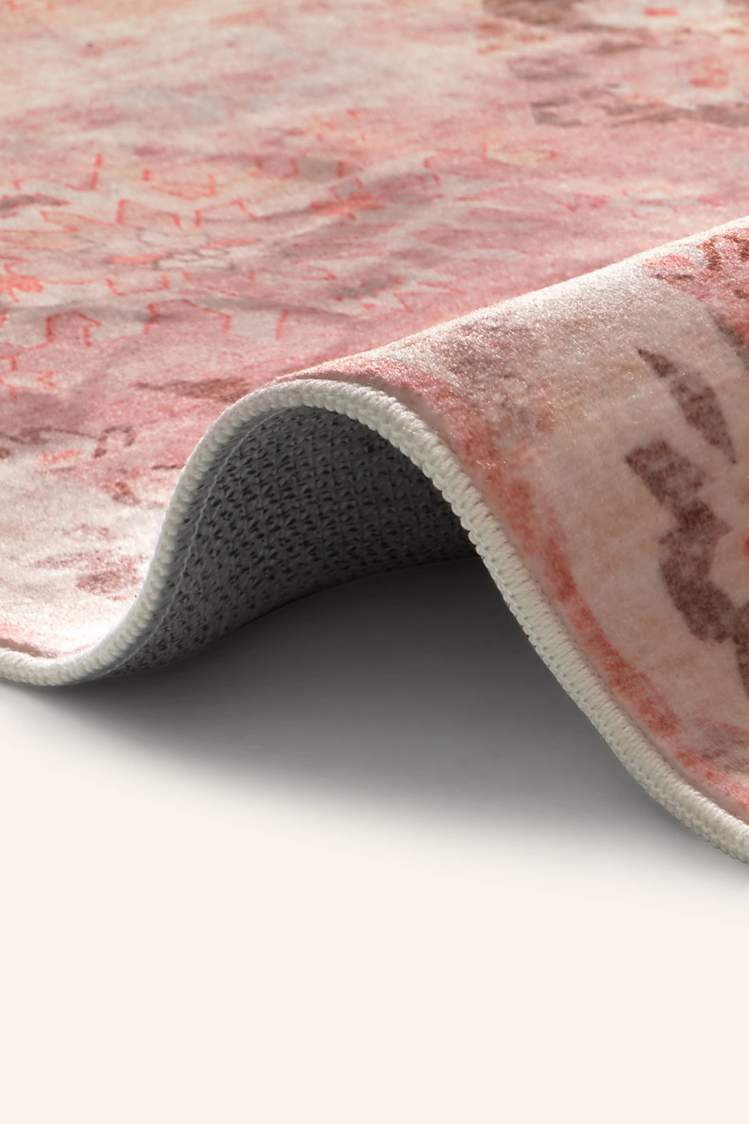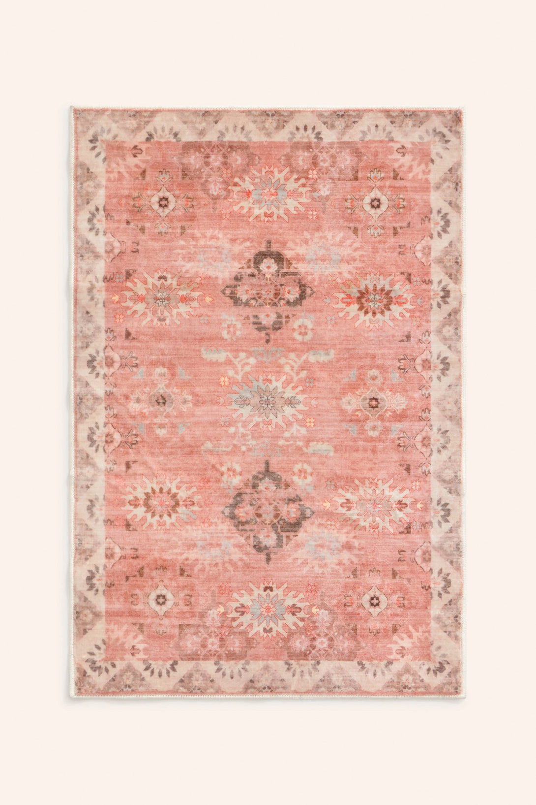 Alfombra lavable de pelo suave corto con estampado de filigranas en tonos rosas. Trasero con antideslizante.