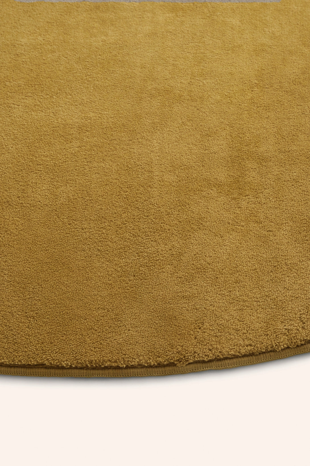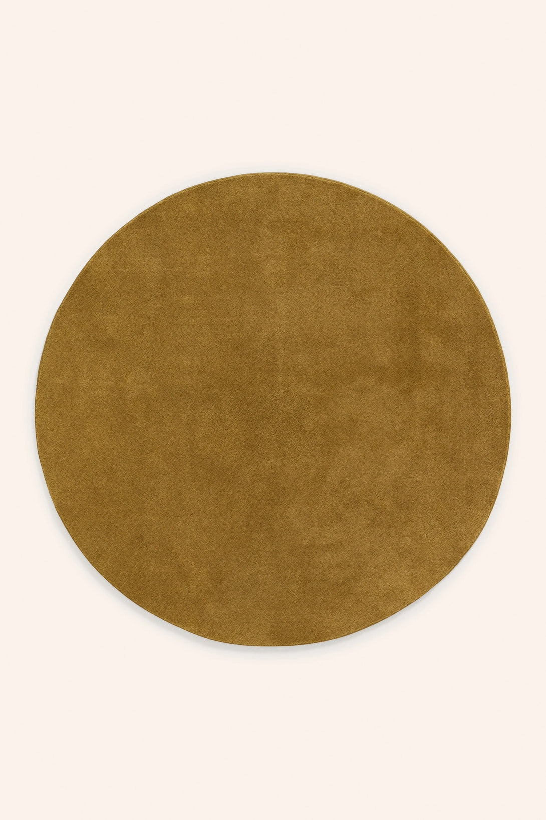 Alfombra redonda lavable de pelo suave corto en tono mostaza. Trasero con antideslizante.