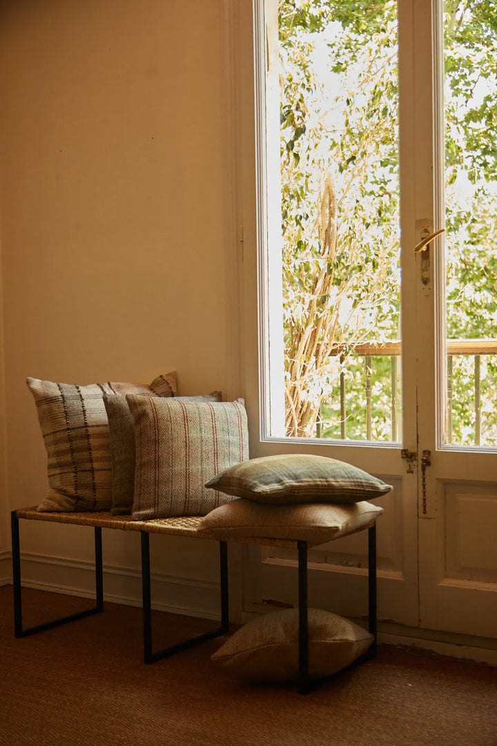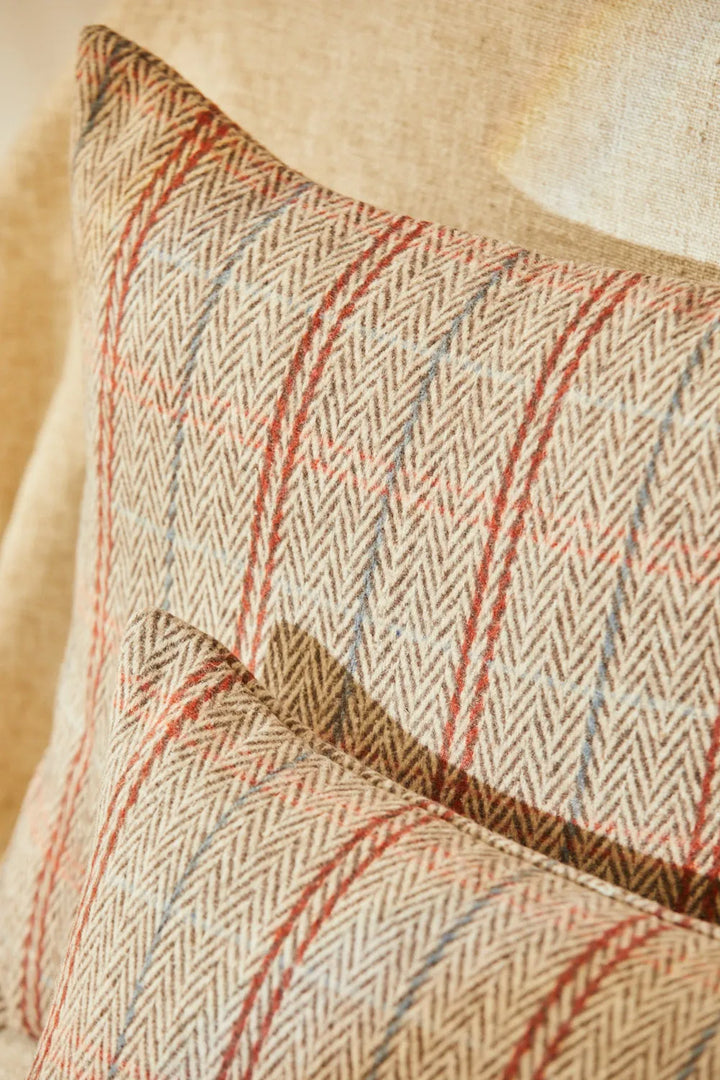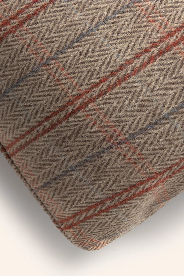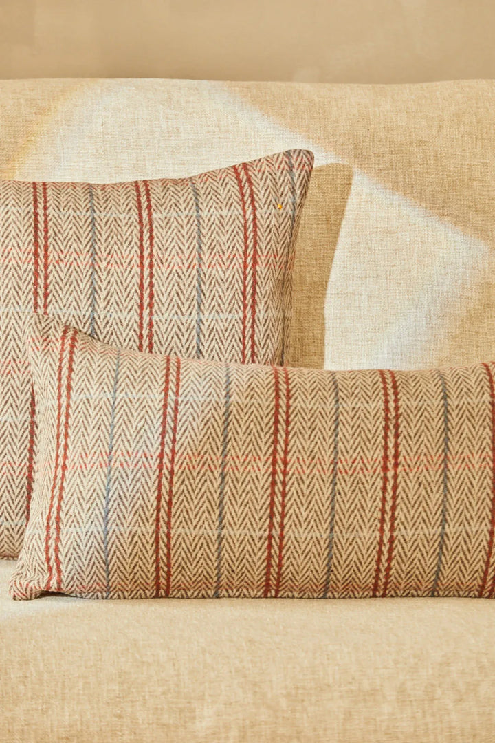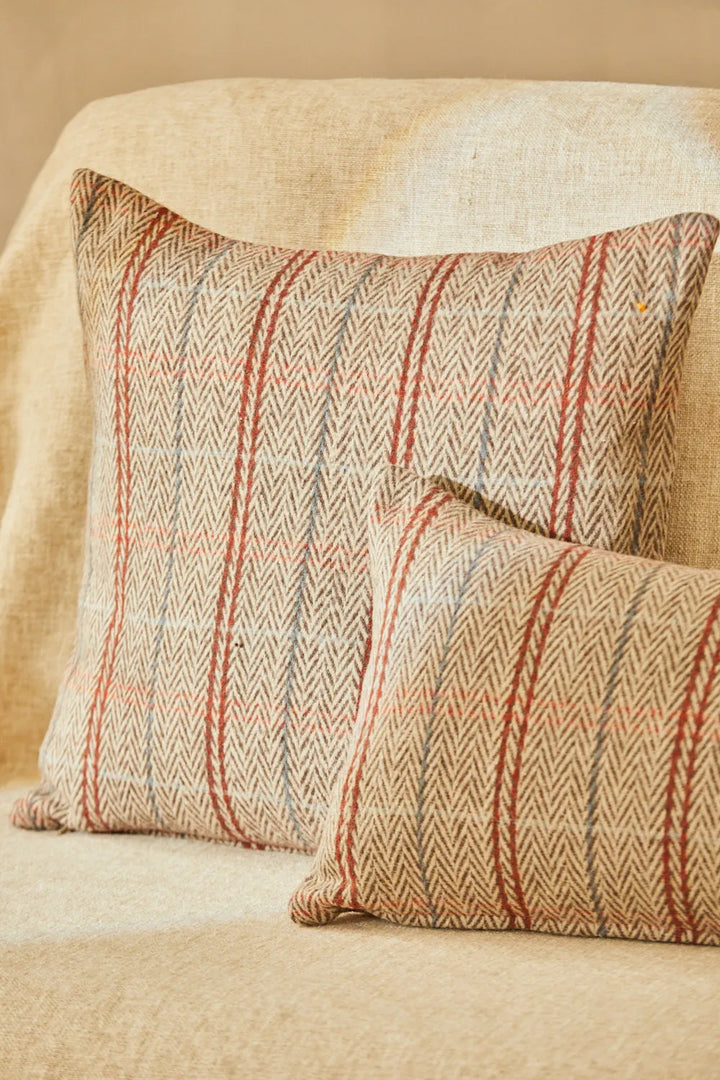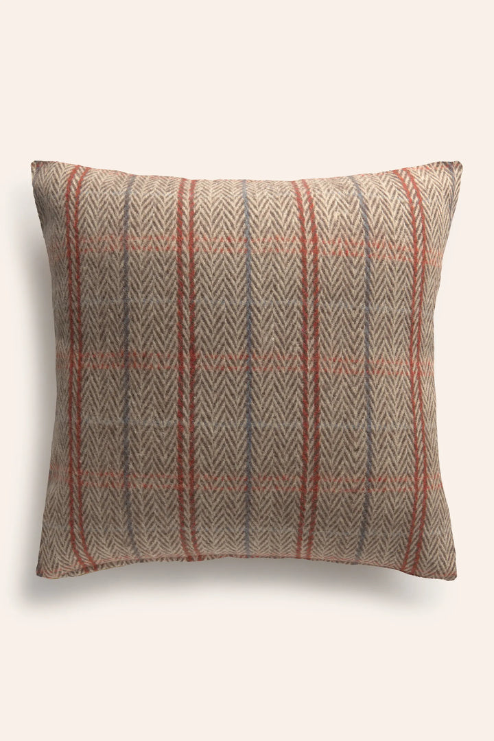 Confeccionada con lana de alta calidad, esta funda presenta un refinado patrón en raya y espiga en tonos tostados, aportando una textura rica y un acabado visualmente atractivo.