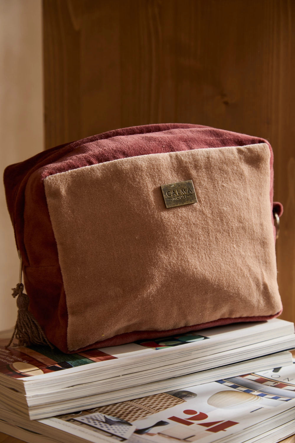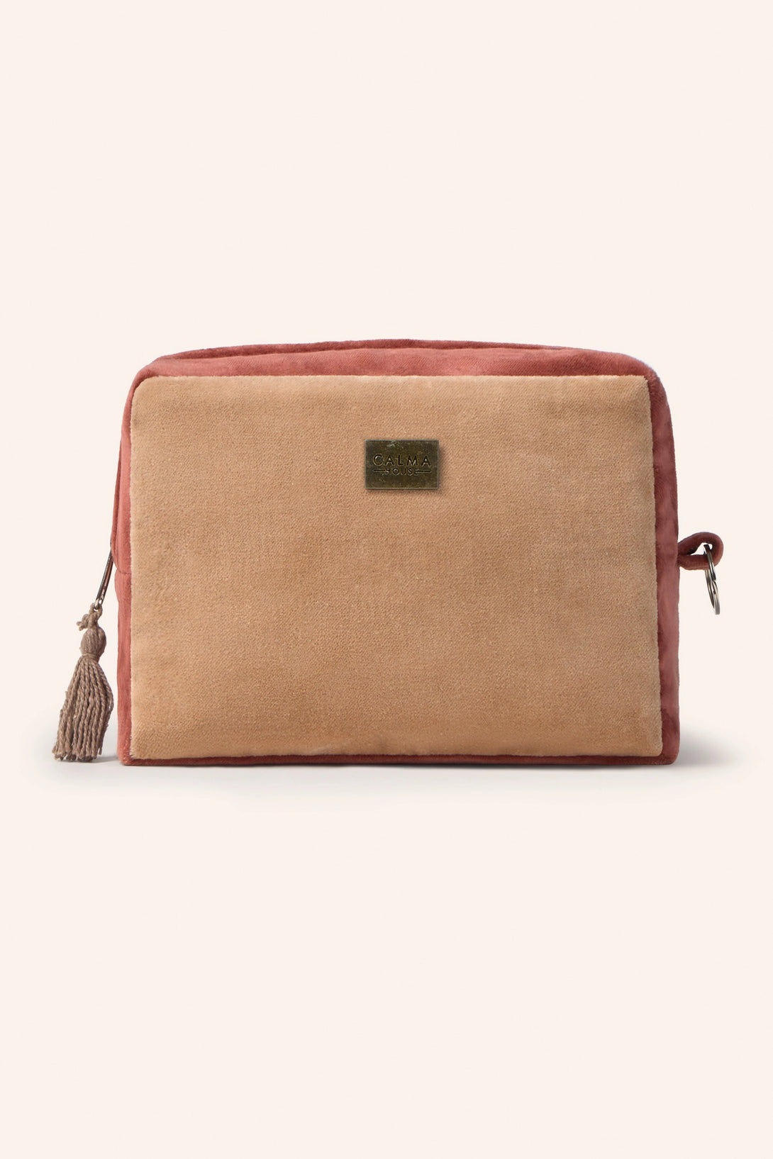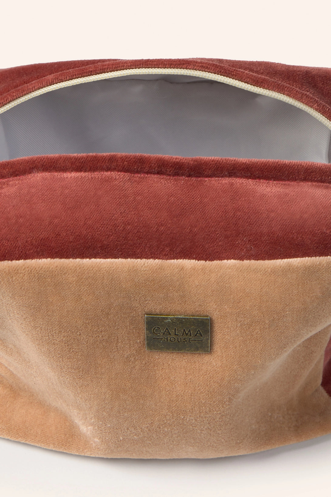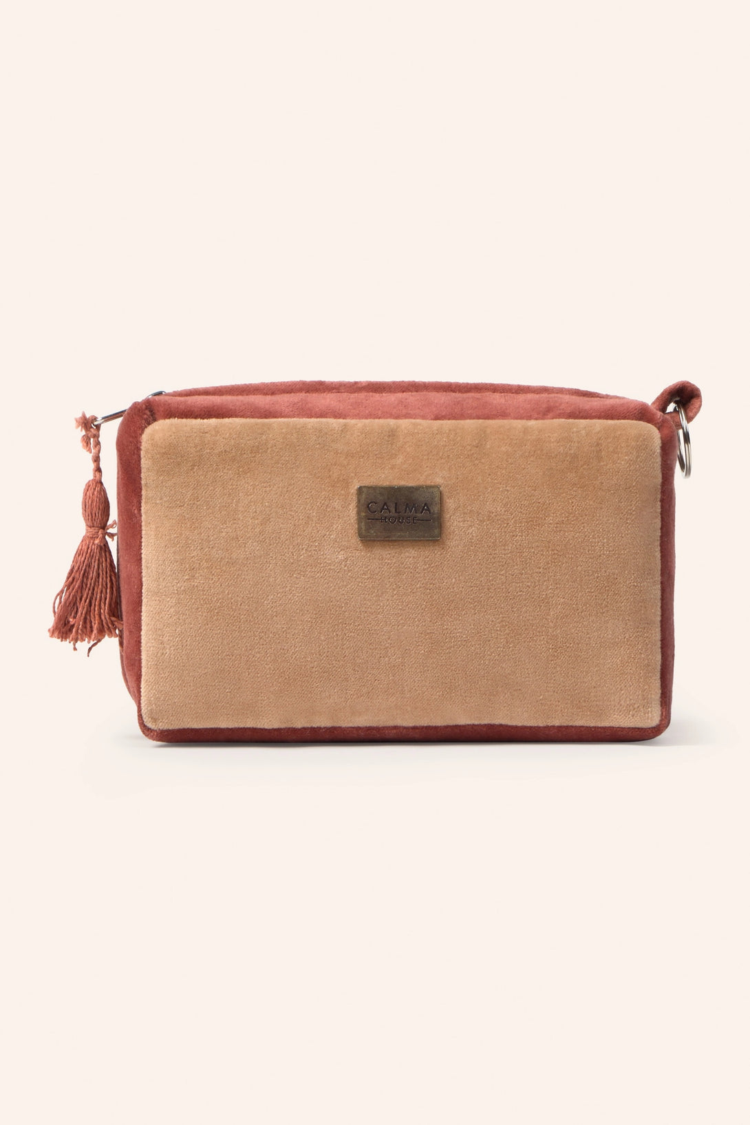 Neceser de terciopelo de algodón en tonos tierra. Cierre con cremallera y detalle de pompón. Interior resistente al agua. Aro lateral para agarre.