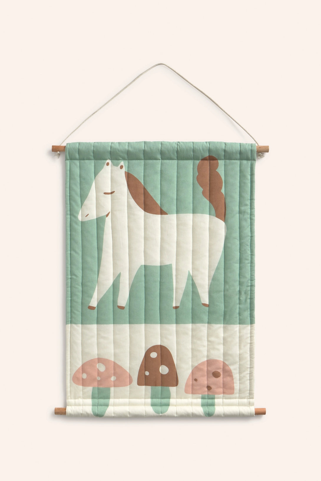 Tapiz de pared acolchado con ilustración de caballo. Estructura de madera. Trasero liso en algodón.
