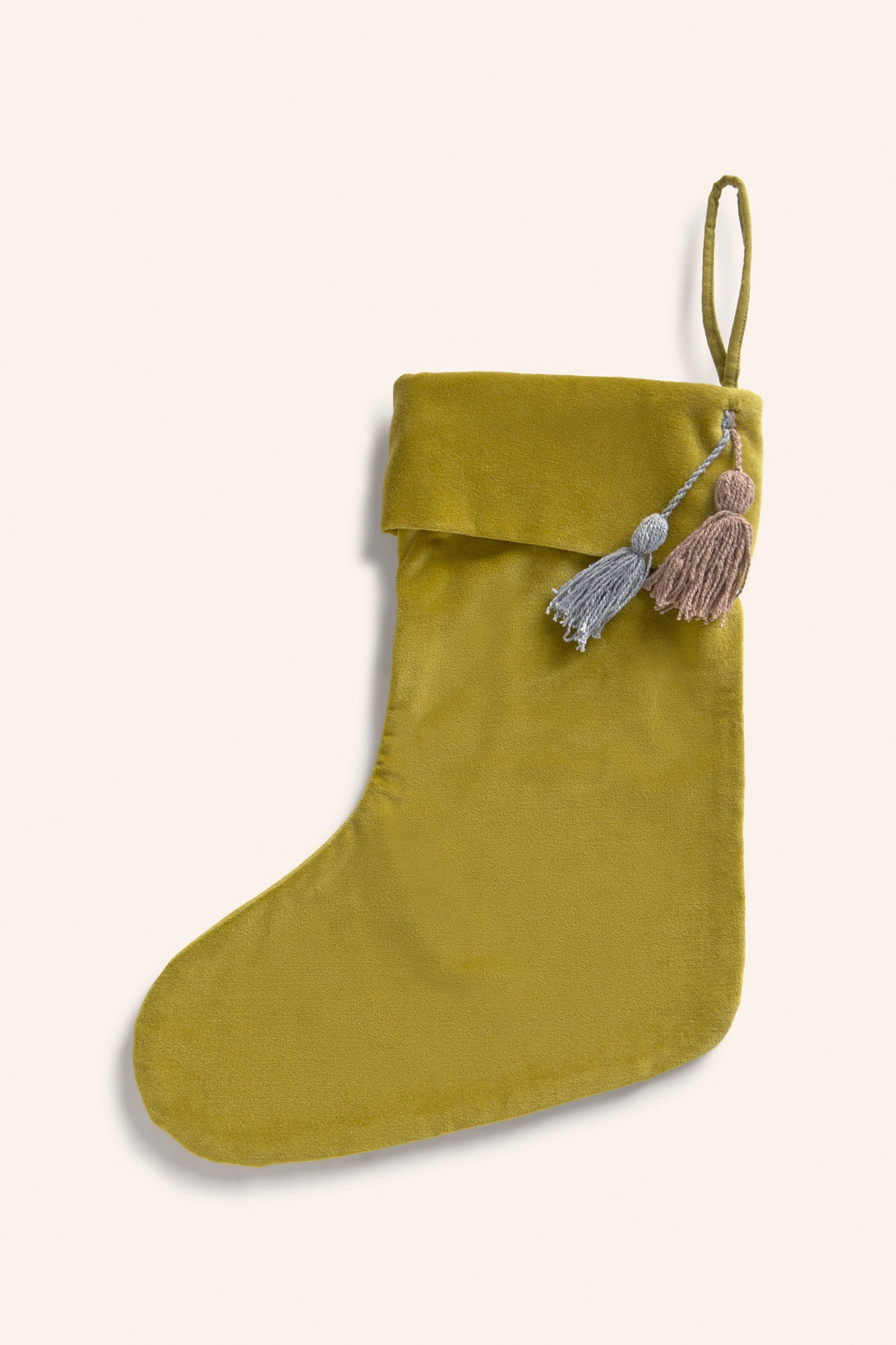 Décoration de Noël en velours de coton vert. Intérieur doublé de toile. Pompons et ruban de suspension.
