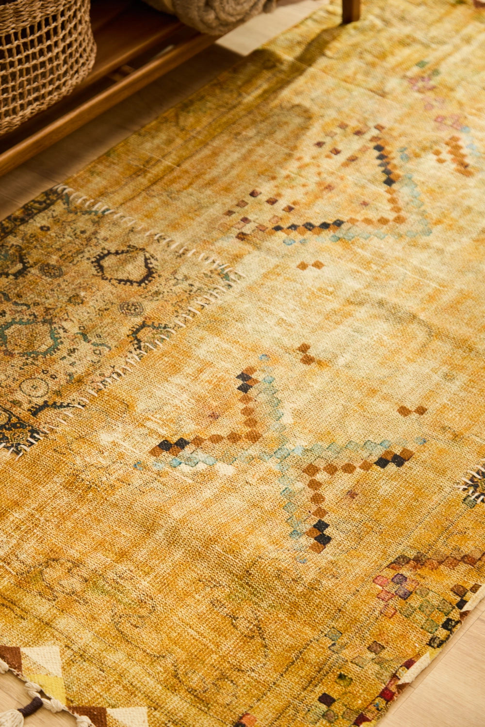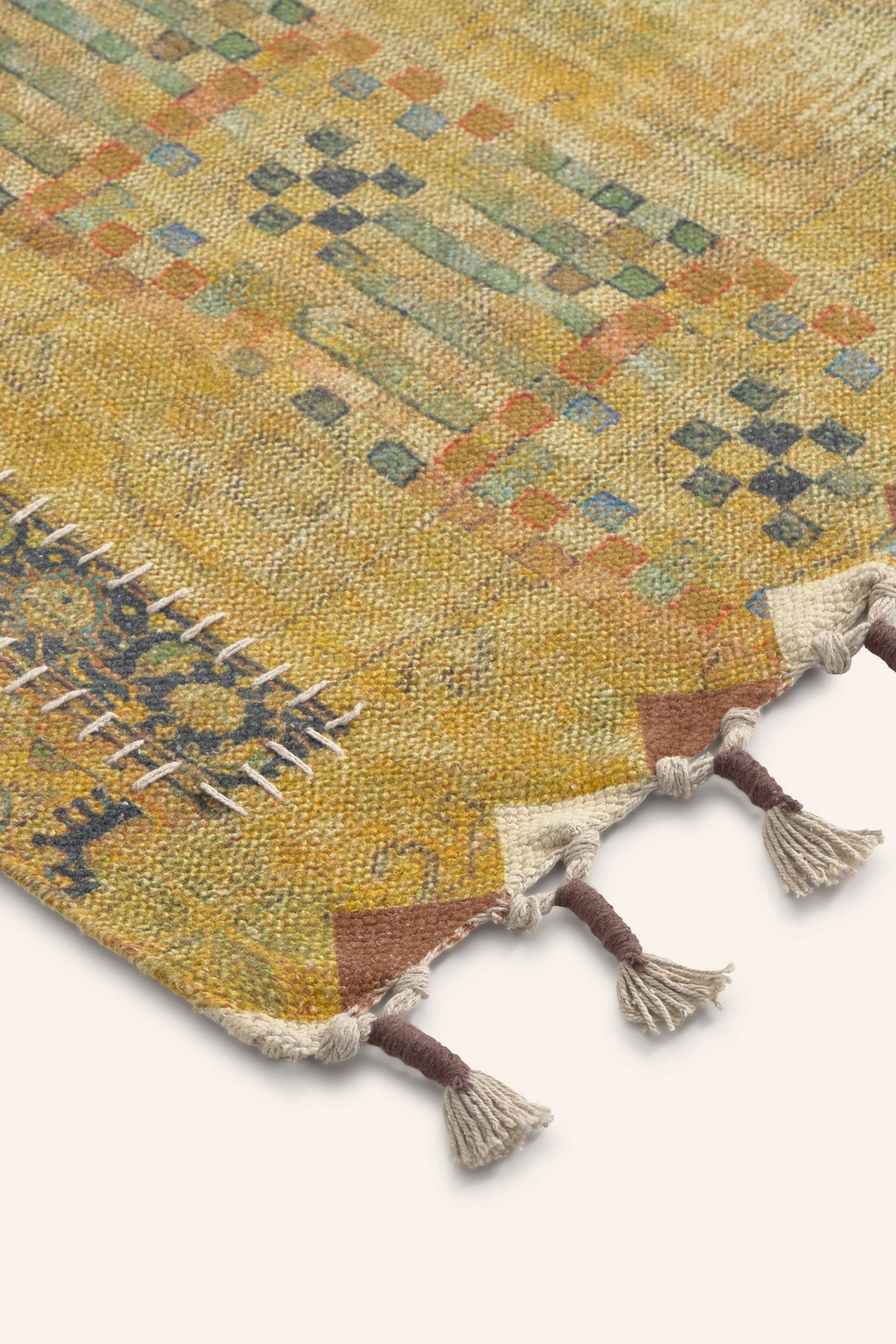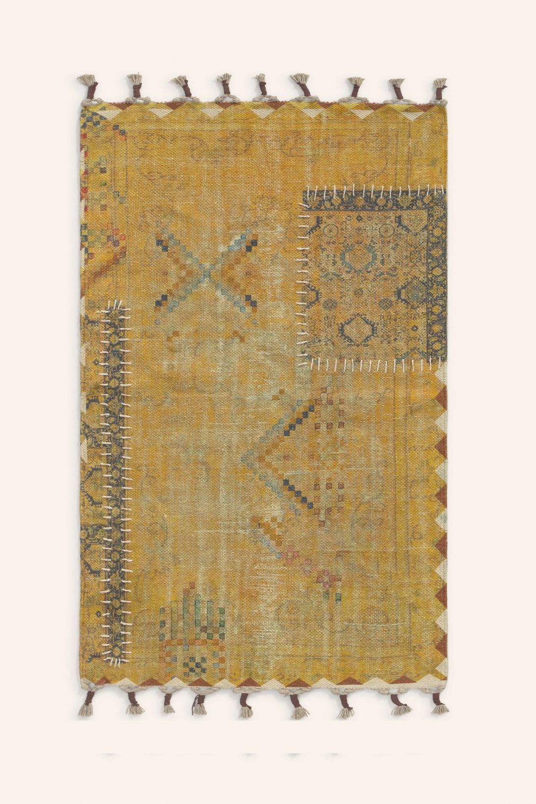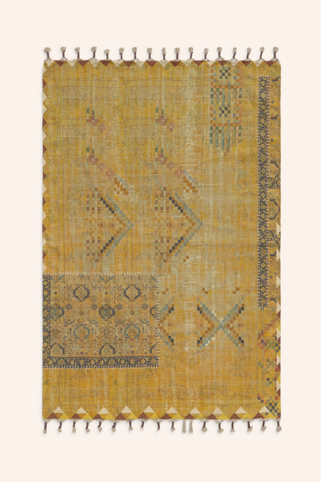 Tapis dhurrie en coton moutarde, technique patchwork. Finition frangée.