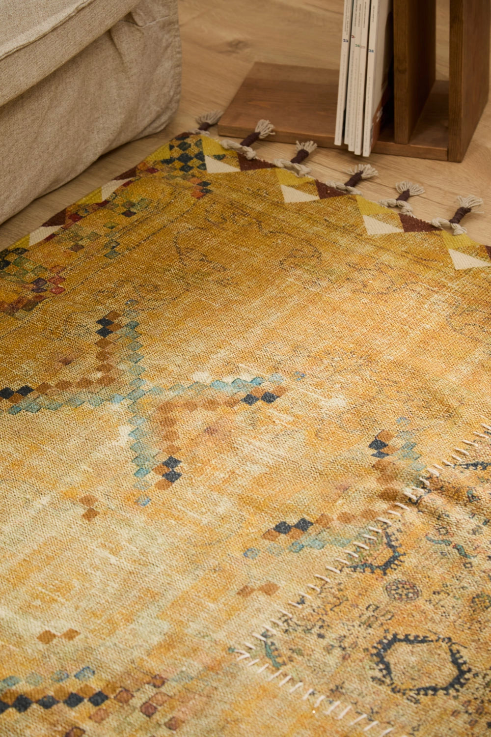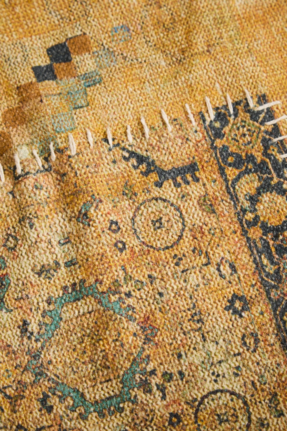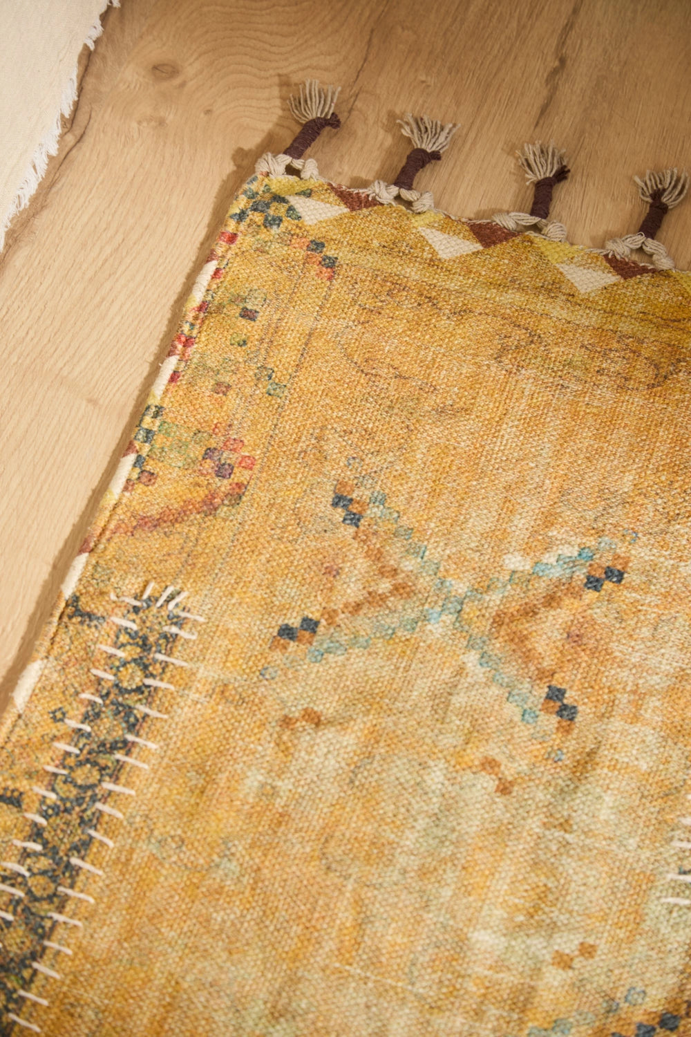 Tapis dhurrie en coton moutarde, technique patchwork. Finition frangée.