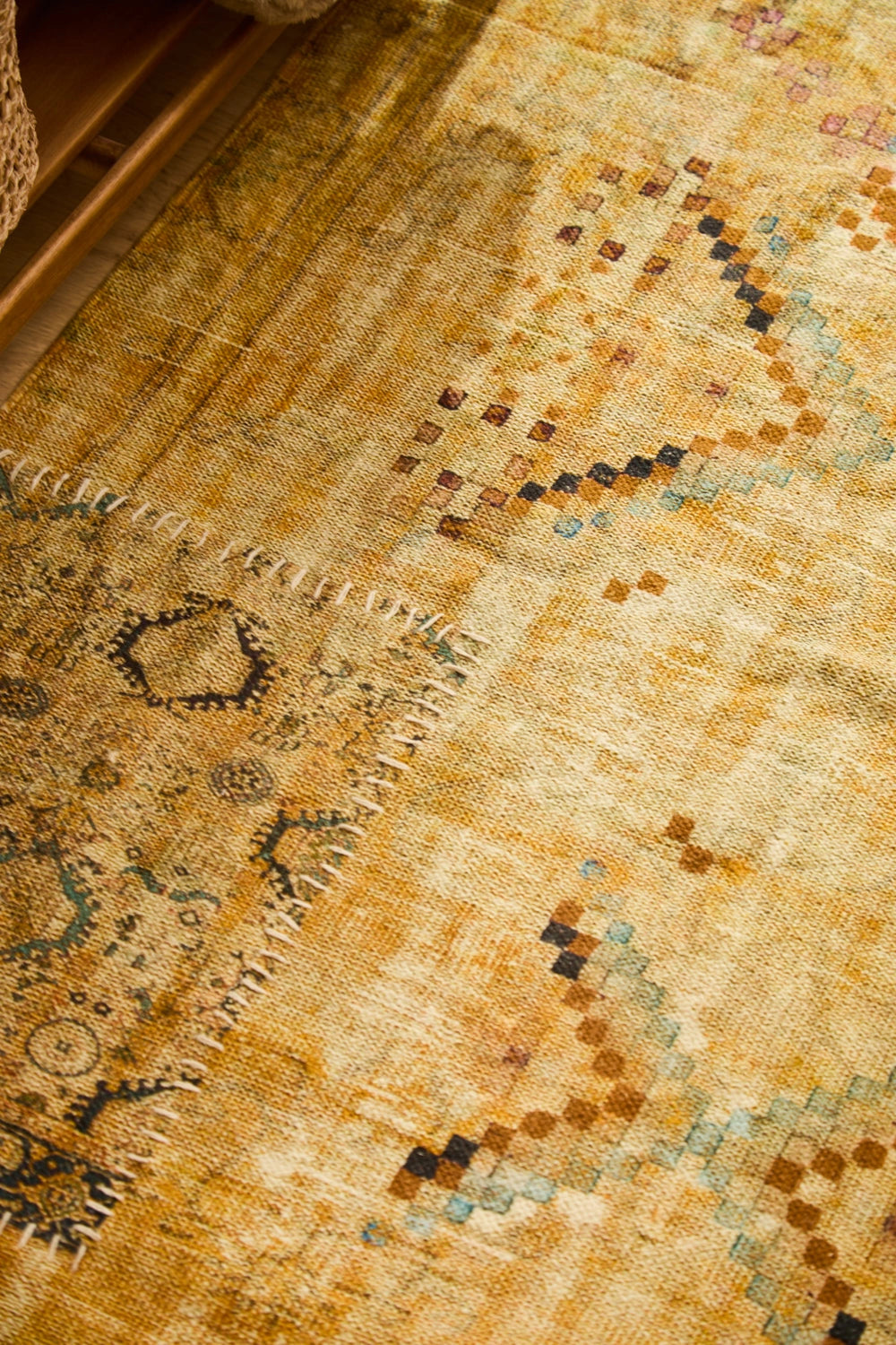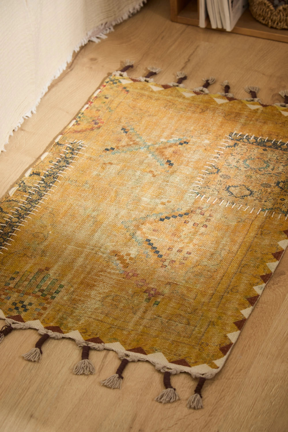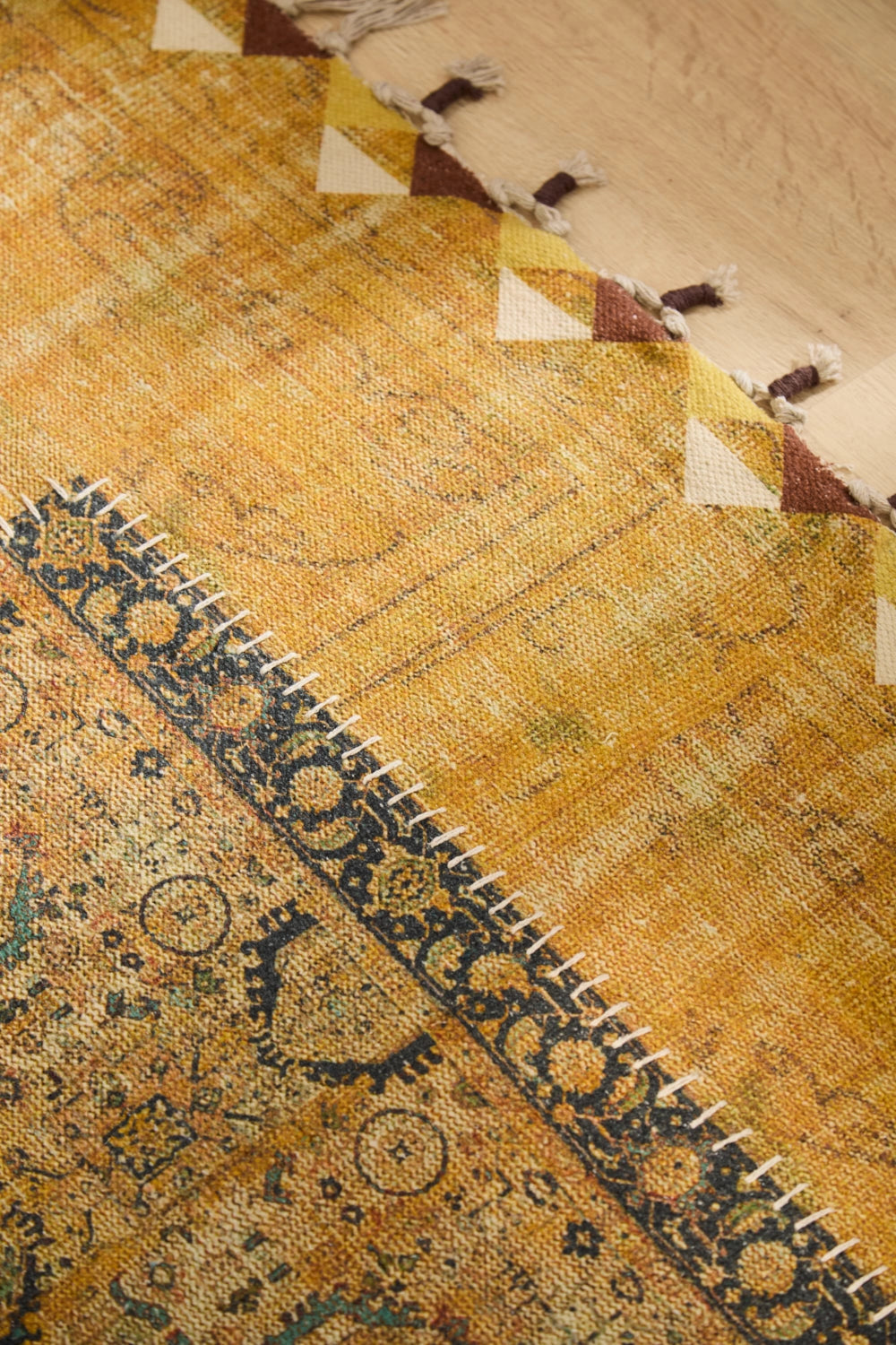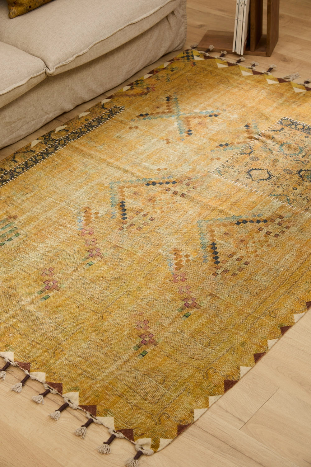 Tapis dhurrie en coton moutarde, technique patchwork. Finition frangée.