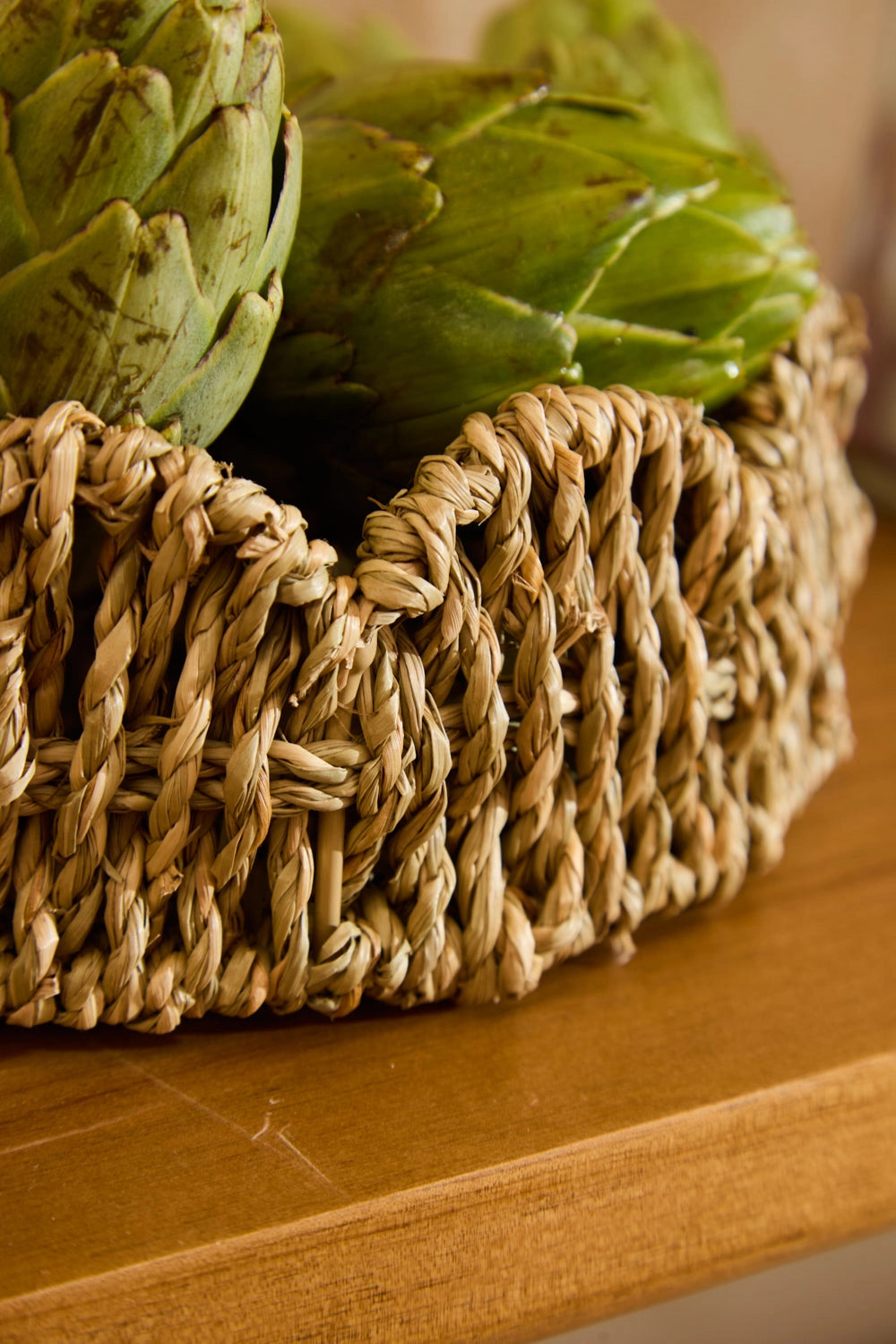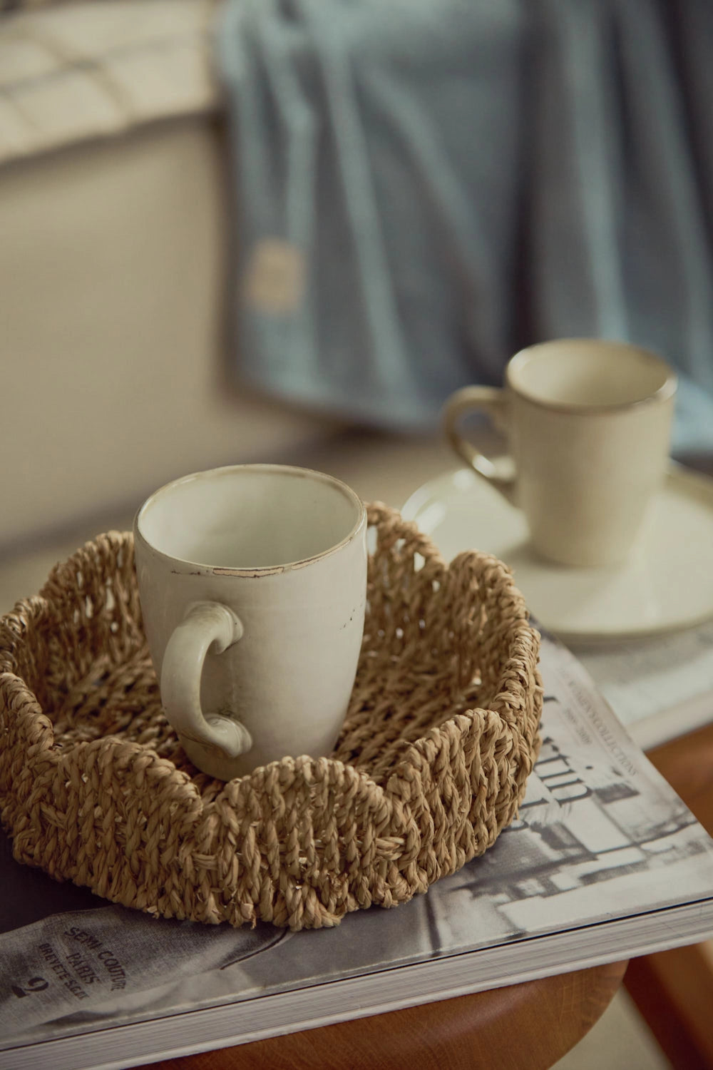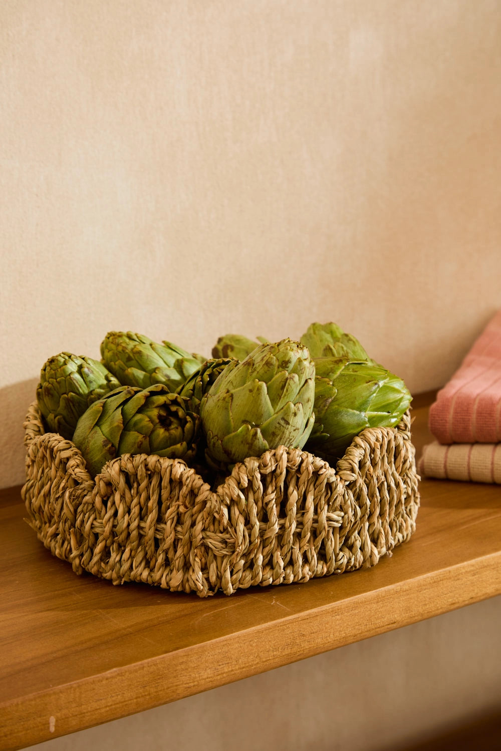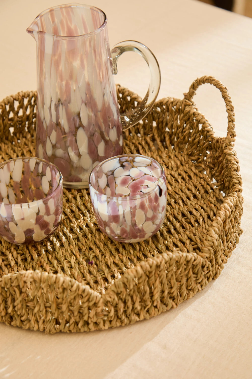 Plateau en jonc de mer avec cadre en métal. Le grand format comprend des poignées.