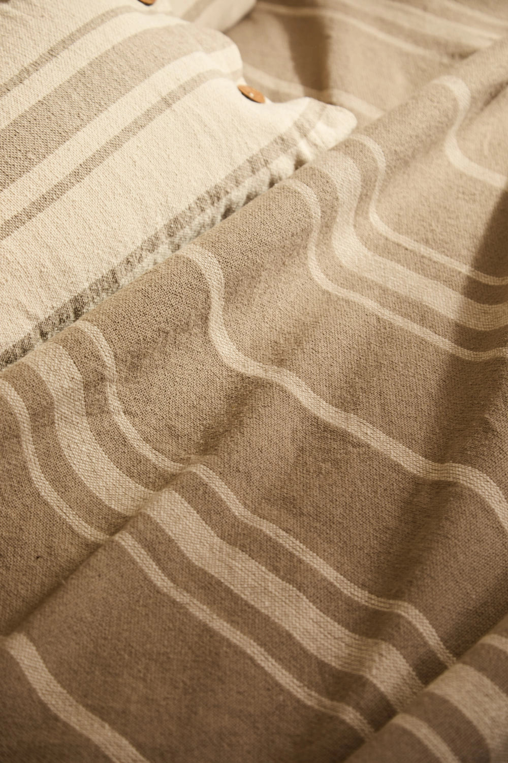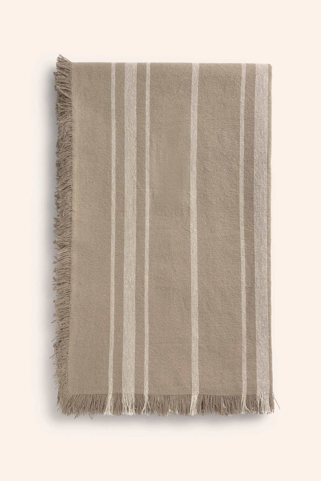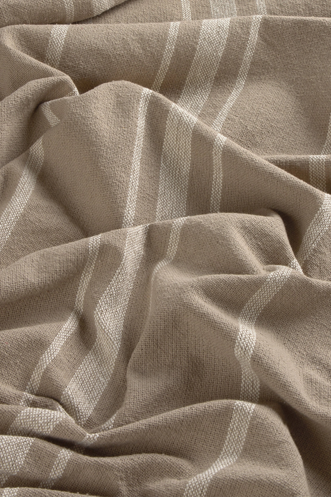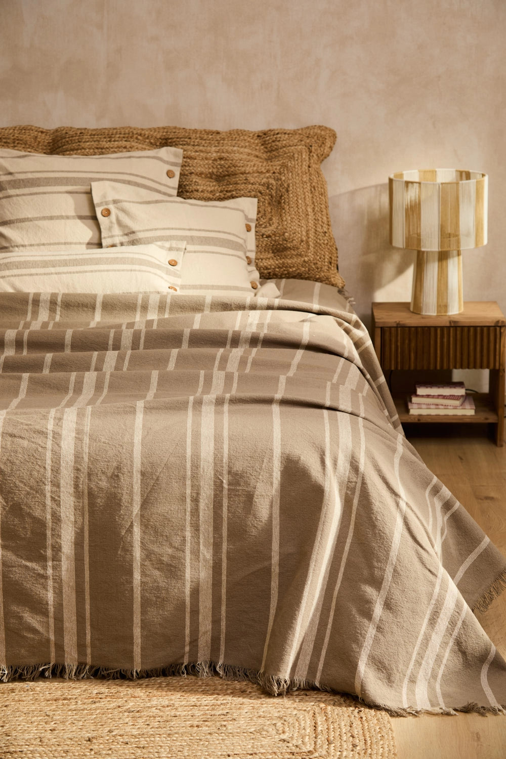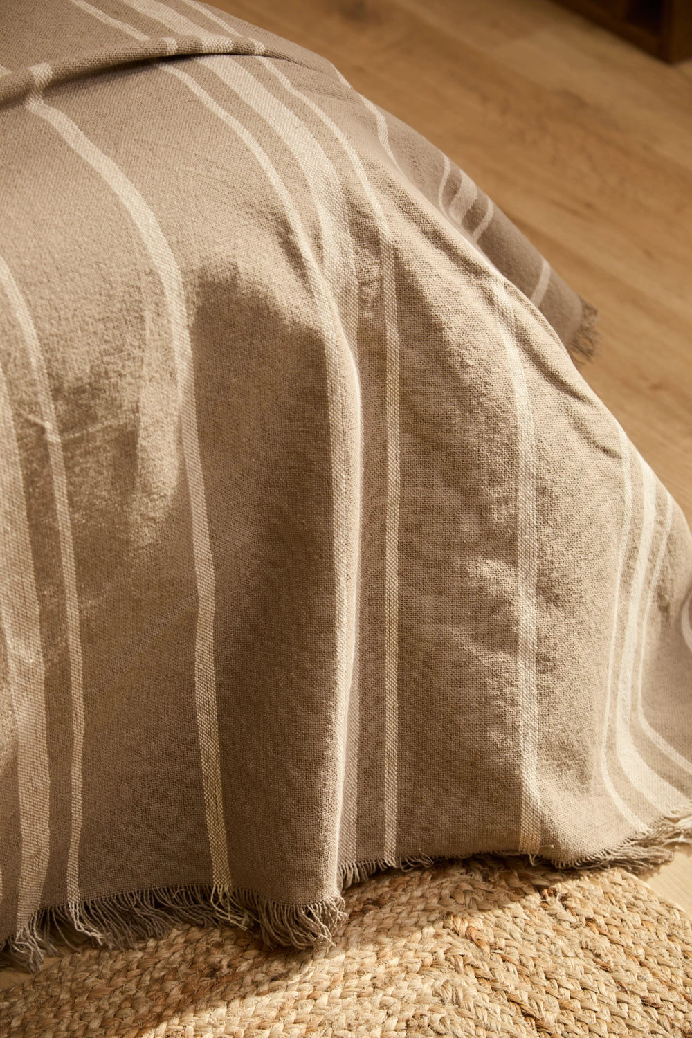 Couvre-lit en coton épais à rayures écrues tissées sur fond pierre. Finition frangée.